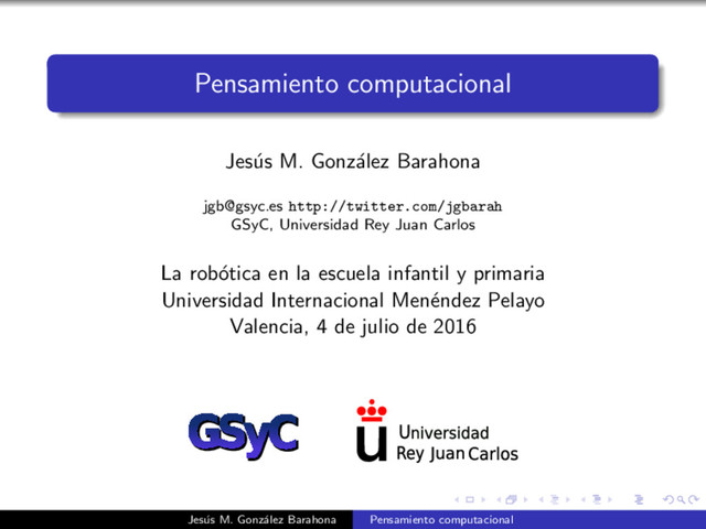 GSyC, Universidad Rey Juan Carlos La rob´ otica en la escuela infantil y primaria Universidad Internacional Men´ endez Pelayo Valencia, 4 de julio de 2016 Jes´ us M. Gonz´ alez Barahona Pensamiento computacional