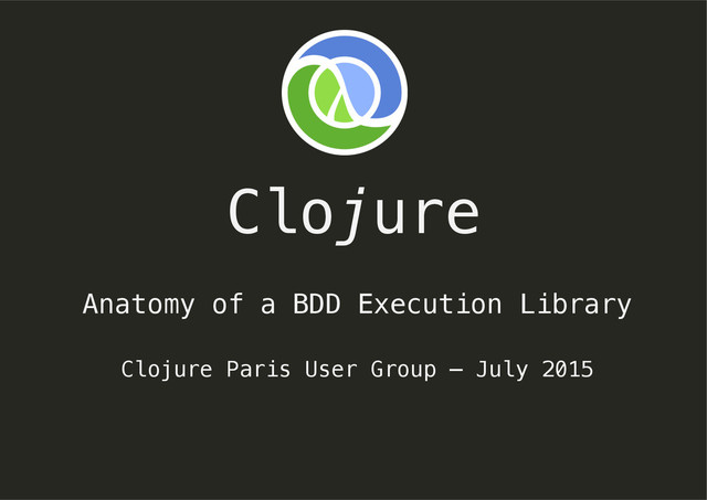 can! J • Full idiomatic Clojure Implementation • I wanted better REPL integration and functional point of view • Include Rules handling and execution as an enhancement to BDD • Alternative in Clojure: cucumber-jvm, speclj (internal DSL)