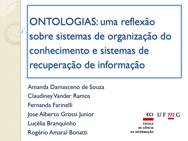 Organização do Conhecimento • Sistemas de Recuperação de Informação • Ontologias 3. Modelos conceituais como sistemas de organização do conhecimento 4. Ontologias biomédicas 5. Ontologias para sistemas de informação 6. Ontologias para recuperação de informação 7. Ontologias e mineração de dados 8. Ontologias e grafos