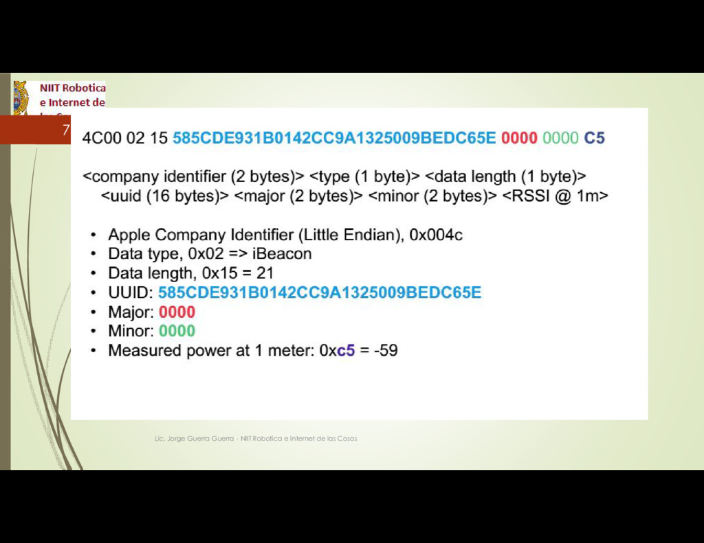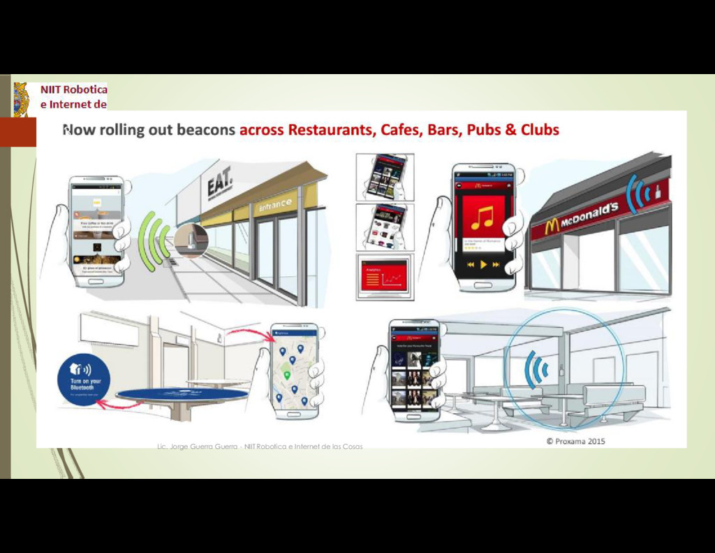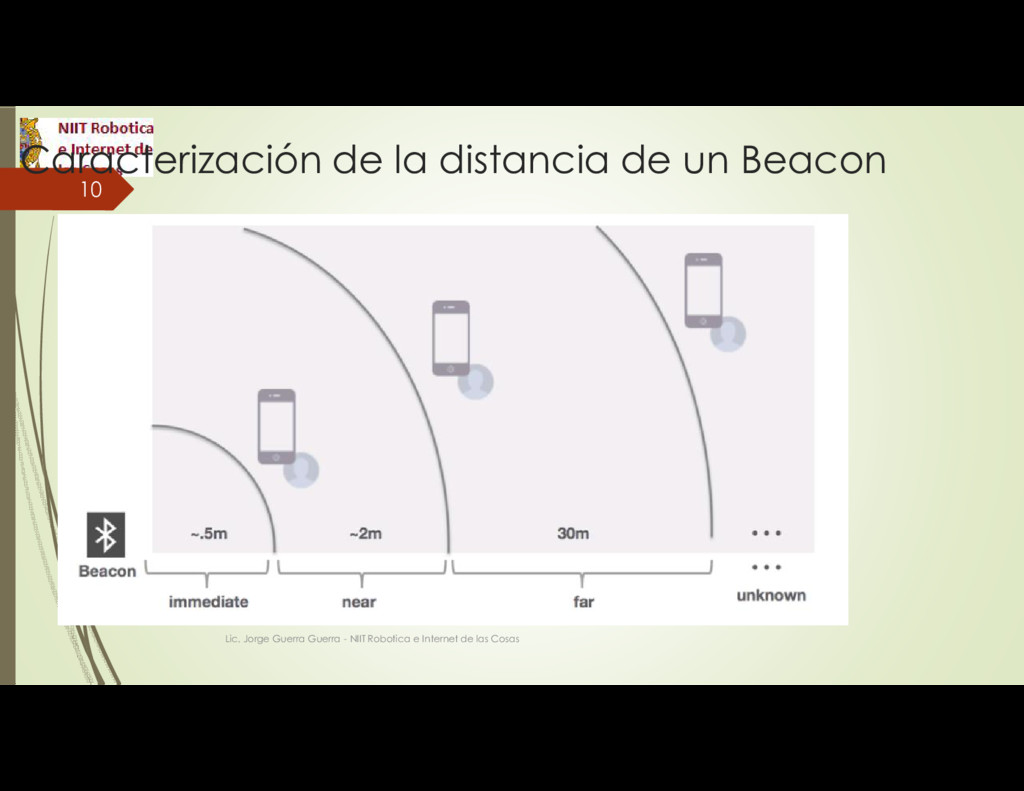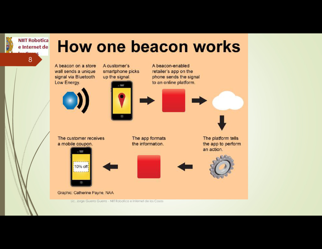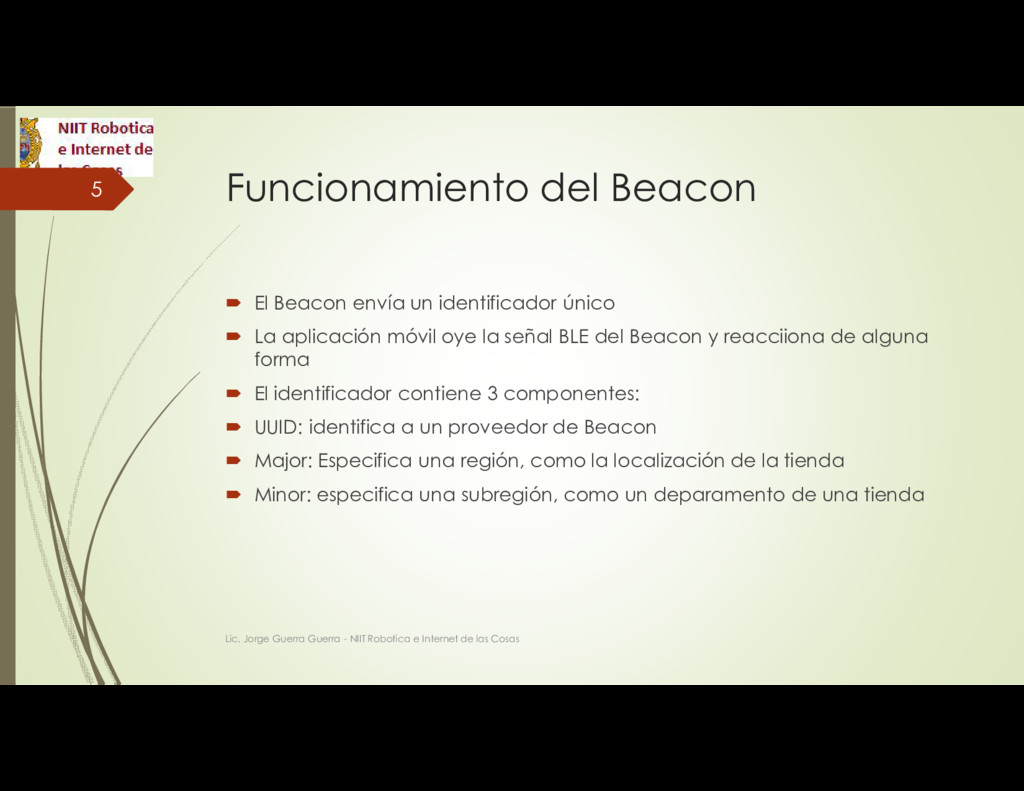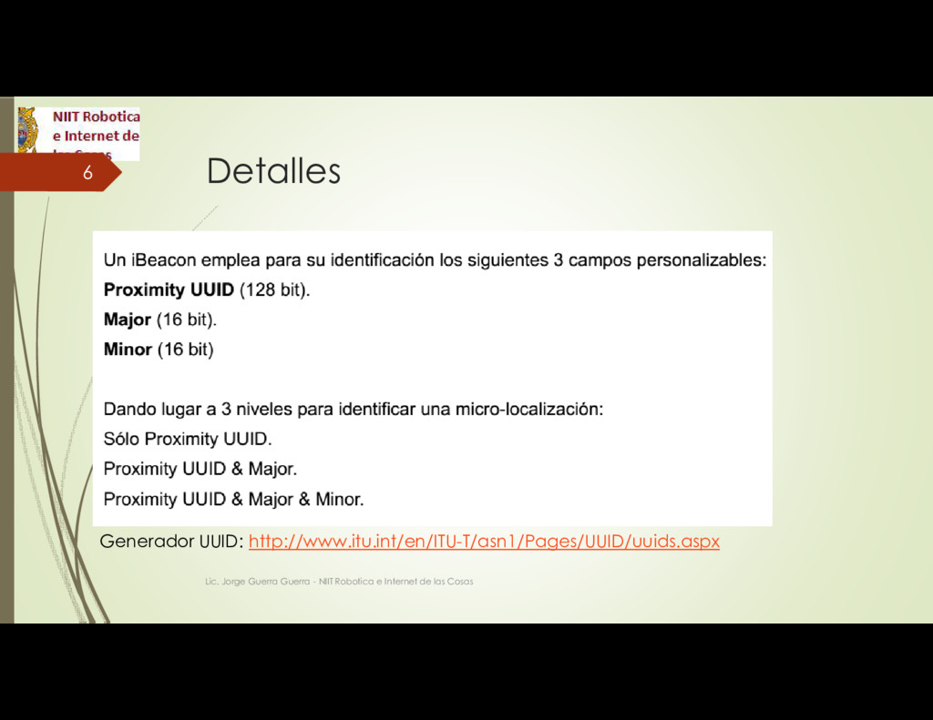 La aplicación móvil oye la señal BLE del Beacon y reacciiona de alguna forma El identificador contiene 3 componentes: UUID: identifica a un proveedor de Beacon Major: Especifica una región, como la localización de la tienda Minor: especifica una subregión, como un deparamento de una tienda 5 Lic. Jorge Guerra Guerra - NIIT Robotica e Internet de las Cosas