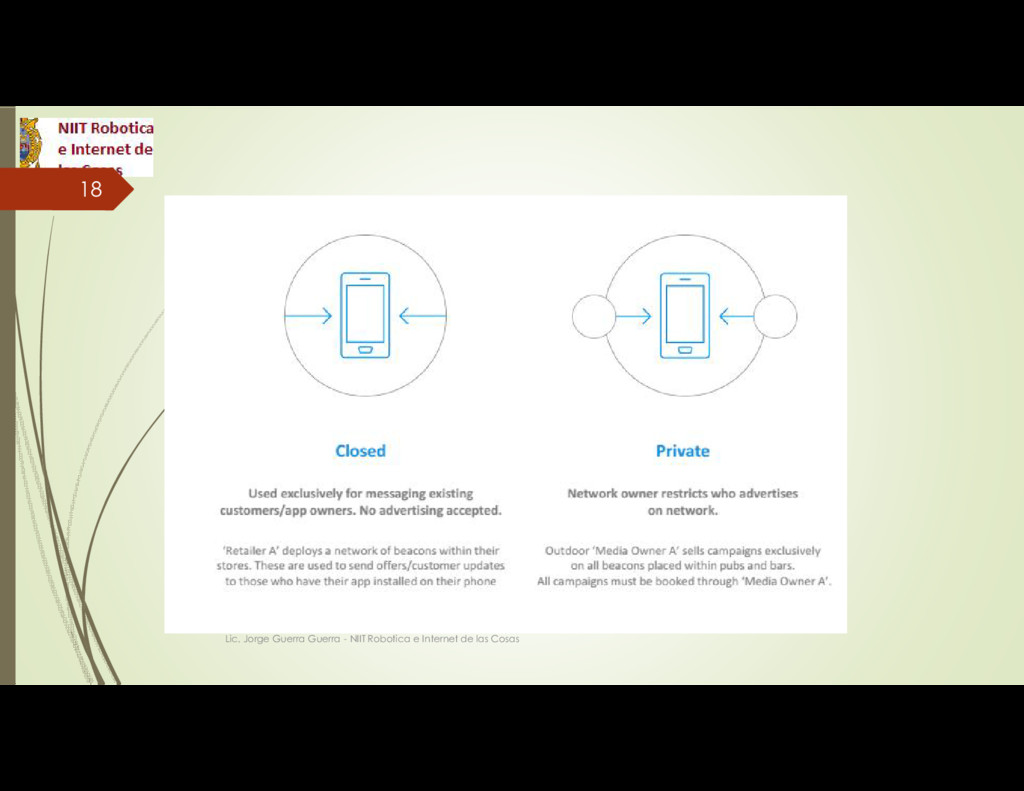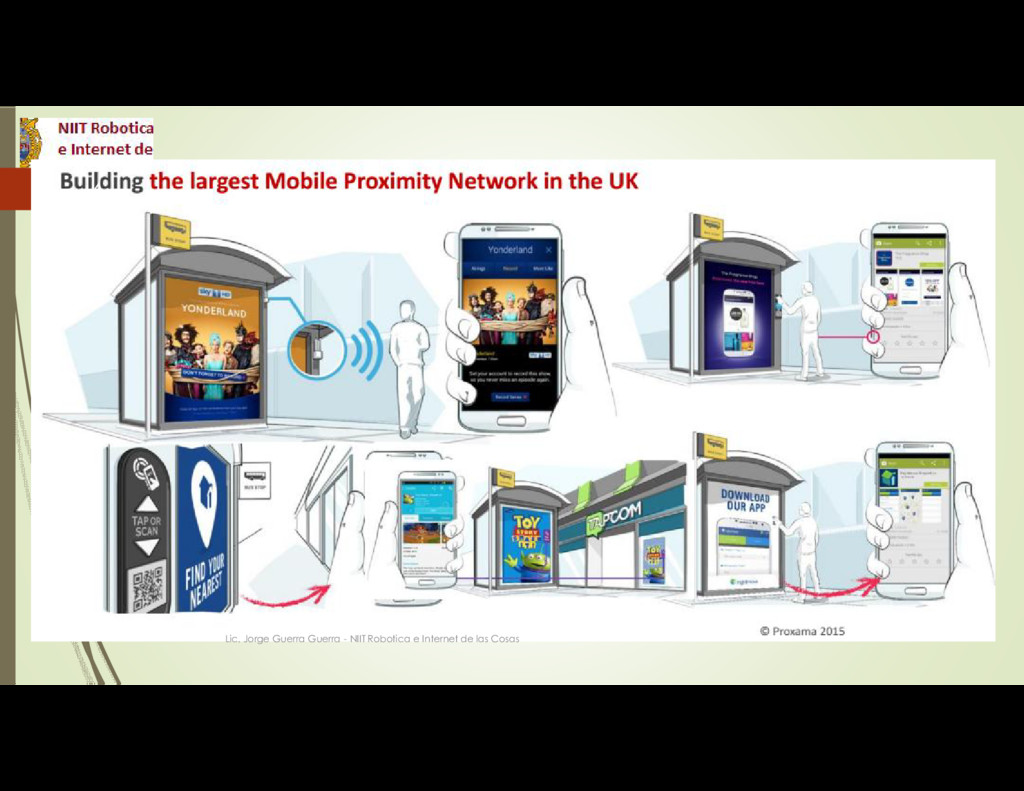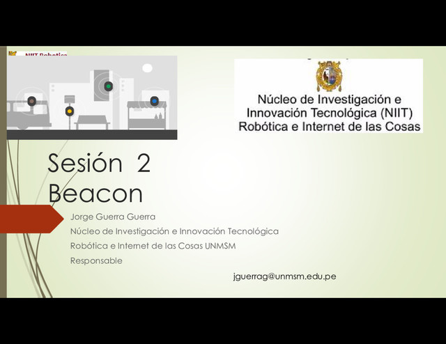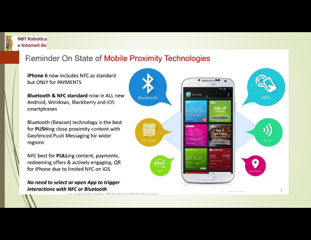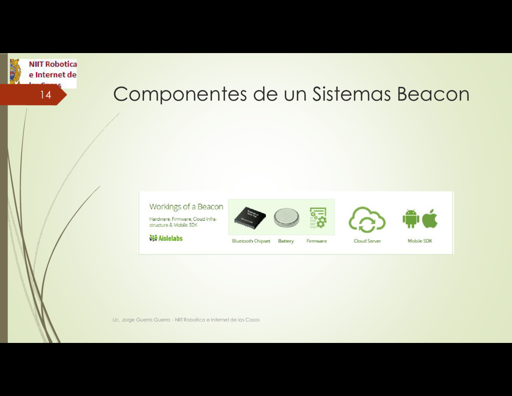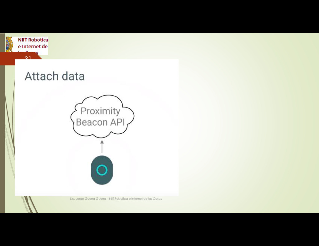 La aplicación móvil oye la señal BLE del Beacon y reacciiona de alguna forma El identificador contiene 3 componentes: UUID: identifica a un proveedor de Beacon Major: Especifica una región, como la localización de la tienda Minor: especifica una subregión, como un deparamento de una tienda 5 Lic. Jorge Guerra Guerra - NIIT Robotica e Internet de las Cosas