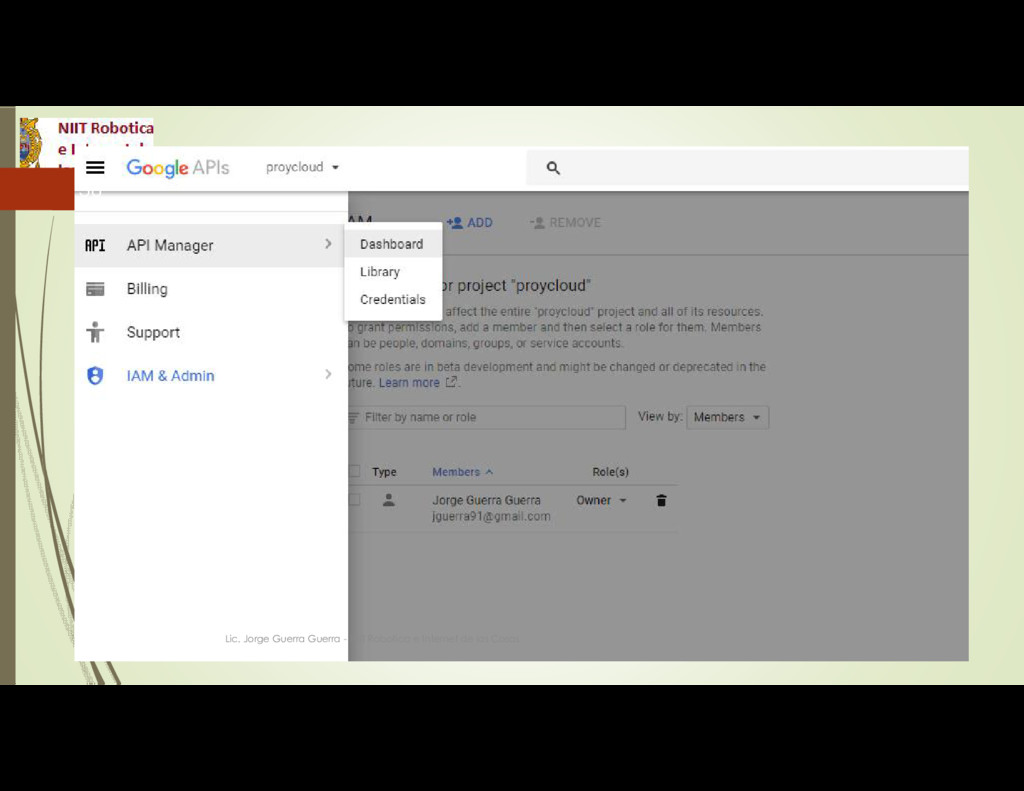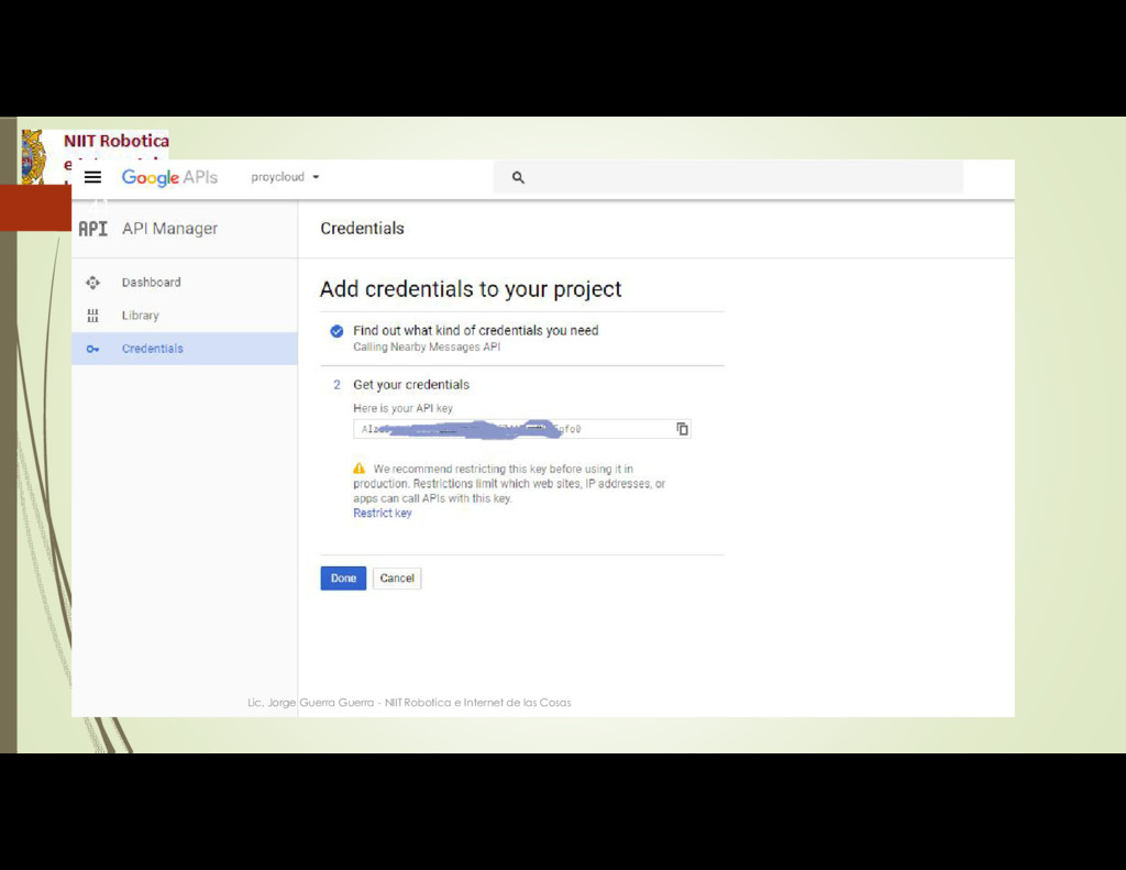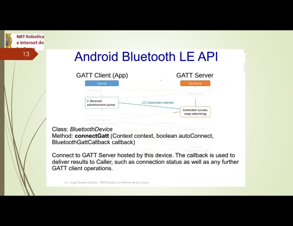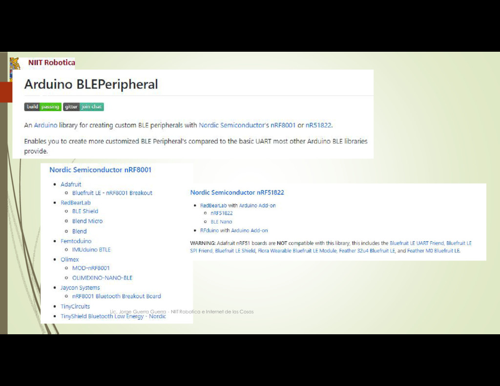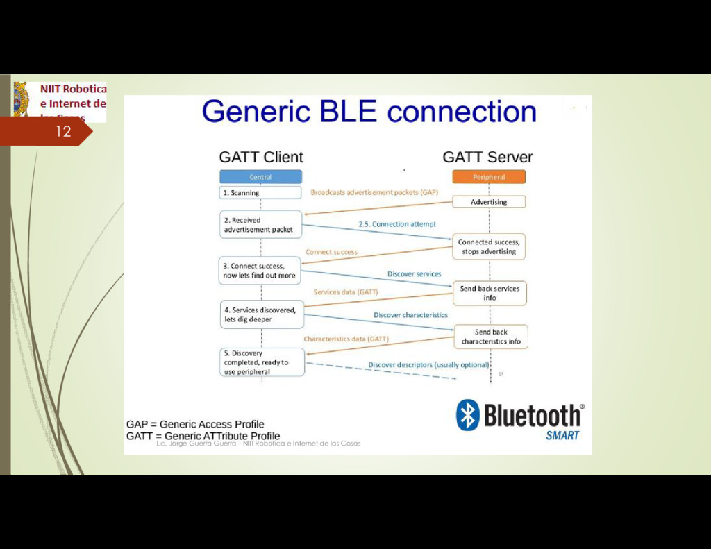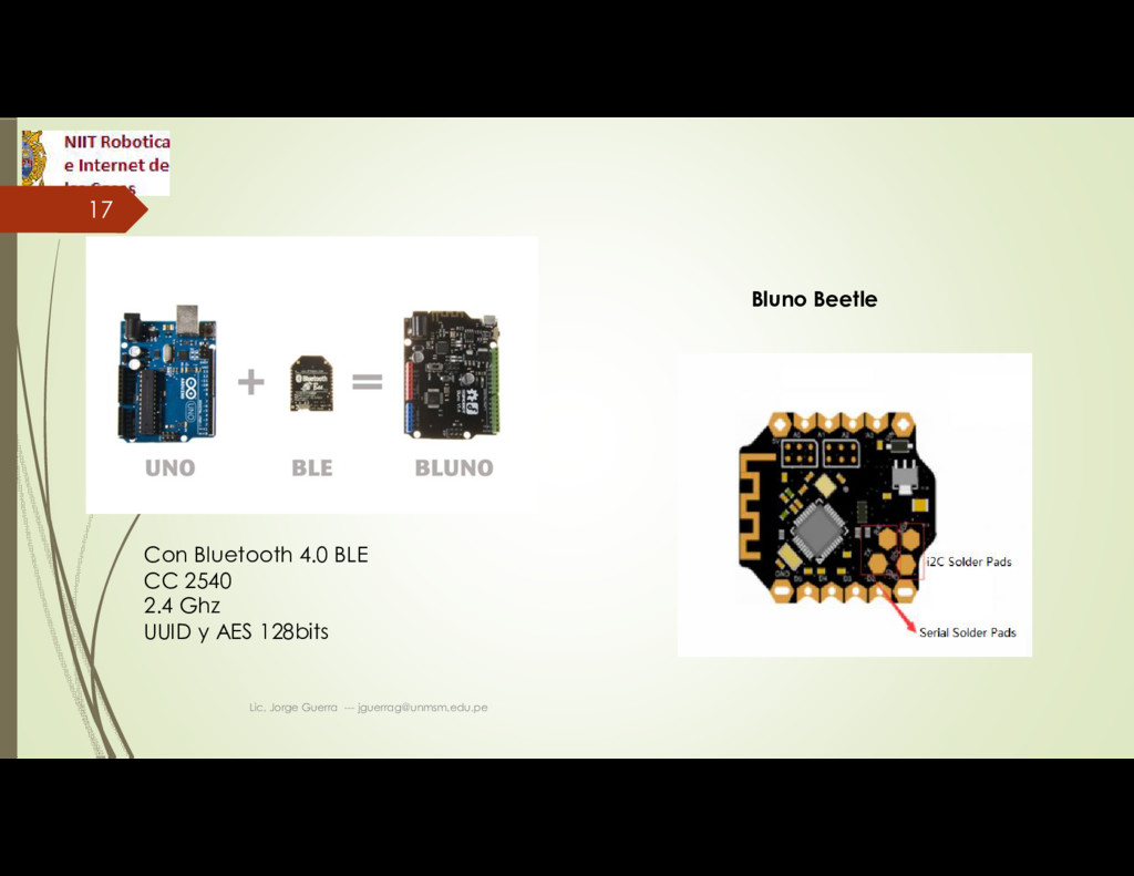 La aplicación móvil oye la señal BLE del Beacon y reacciiona de alguna forma El identificador contiene 3 componentes: UUID: identifica a un proveedor de Beacon Major: Especifica una región, como la localización de la tienda Minor: especifica una subregión, como un deparamento de una tienda 5 Lic. Jorge Guerra Guerra - NIIT Robotica e Internet de las Cosas
