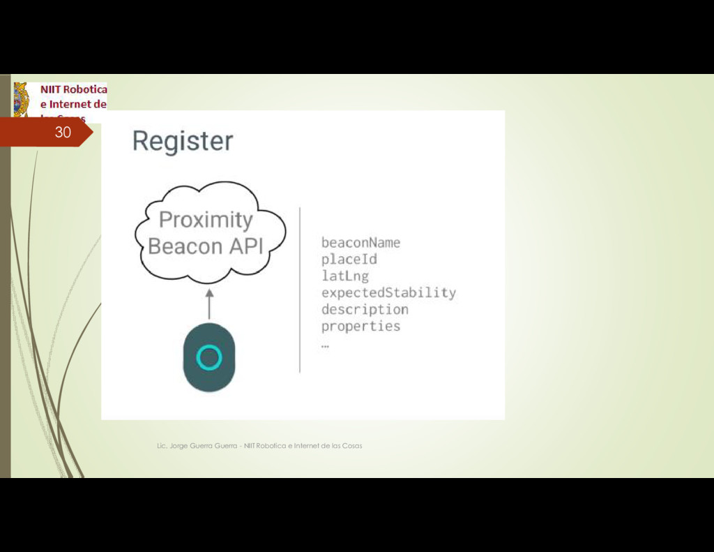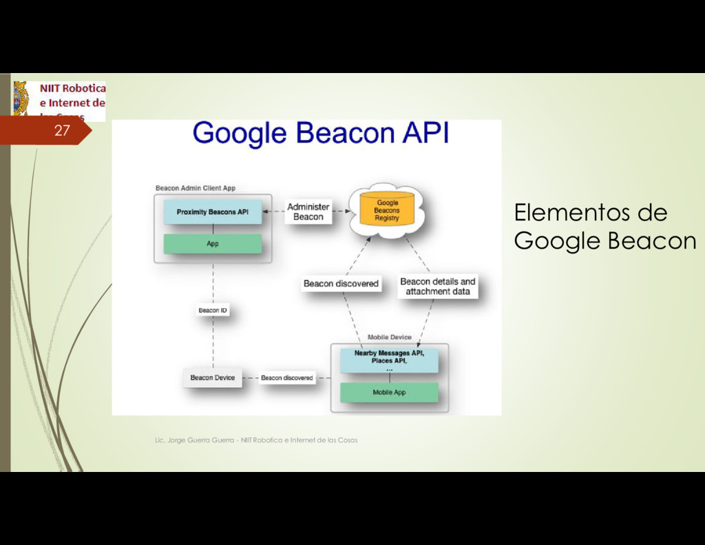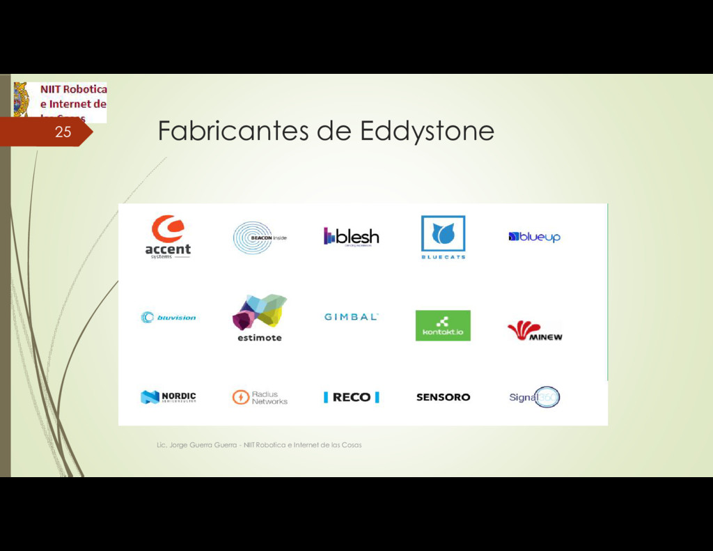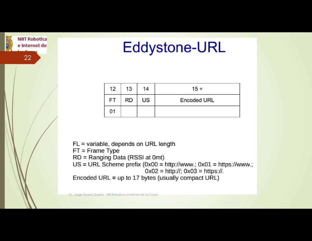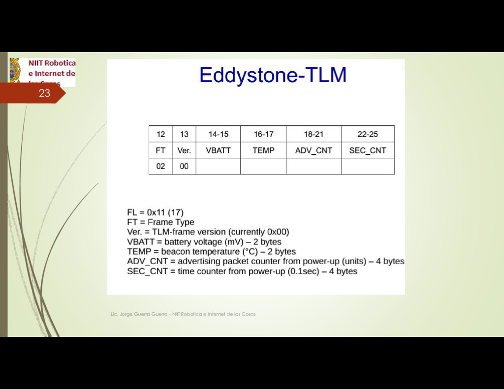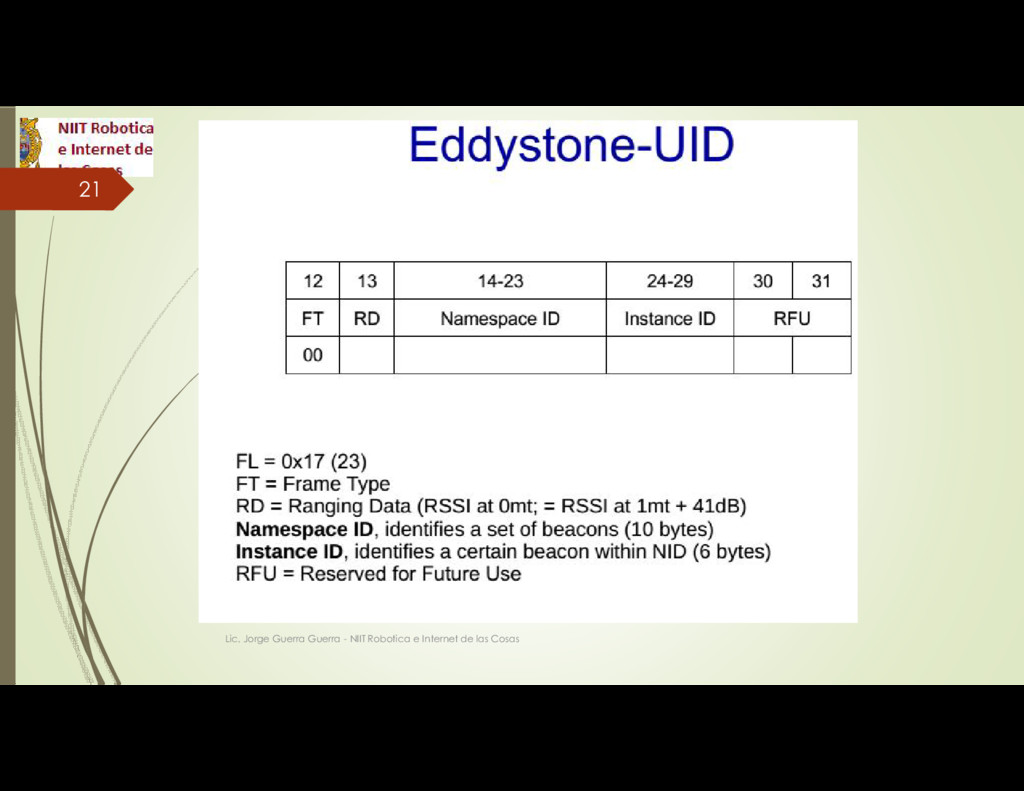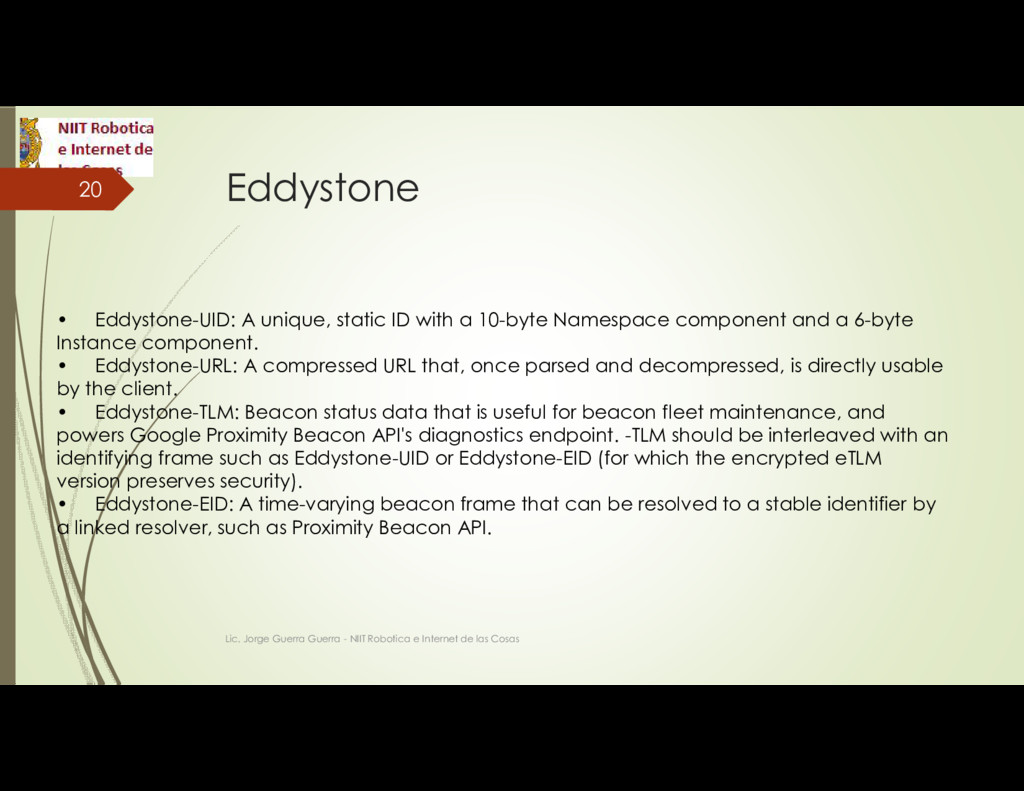 component and a 6-byte Instance component. • Eddystone-URL: A compressed URL that, once parsed and decompressed, is directly usable by the client. • Eddystone-TLM: Beacon status data that is useful for beacon fleet maintenance, and powers Google Proximity Beacon API's diagnostics endpoint. -TLM should be interleaved with an identifying frame such as Eddystone-UID or Eddystone-EID (for which the encrypted eTLM version preserves security). • Eddystone-EID: A time-varying beacon frame that can be resolved to a stable identifier by a linked resolver, such as Proximity Beacon API. Eddystone 20 Lic. Jorge Guerra Guerra - NIIT Robotica e Internet de las Cosas