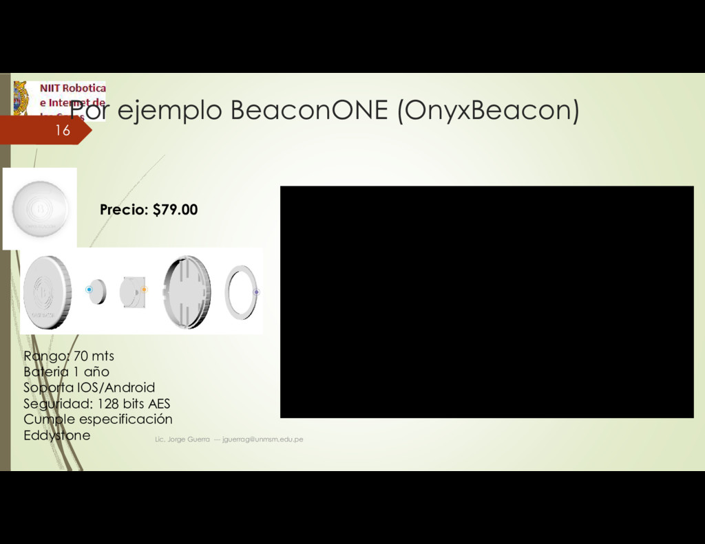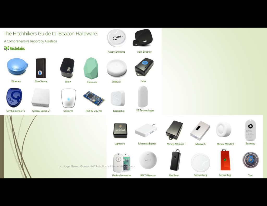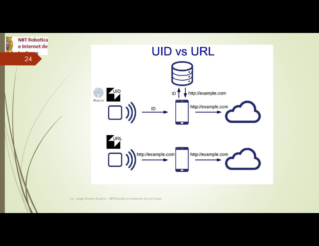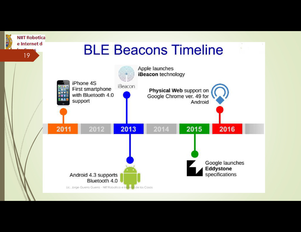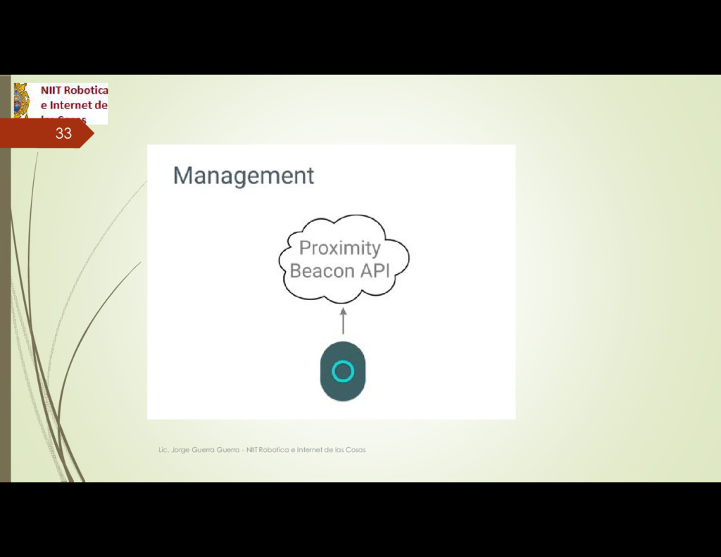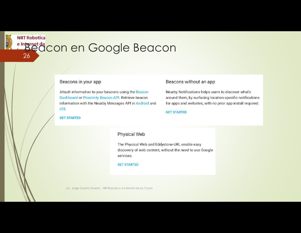 component and a 6-byte Instance component. • Eddystone-URL: A compressed URL that, once parsed and decompressed, is directly usable by the client. • Eddystone-TLM: Beacon status data that is useful for beacon fleet maintenance, and powers Google Proximity Beacon API's diagnostics endpoint. -TLM should be interleaved with an identifying frame such as Eddystone-UID or Eddystone-EID (for which the encrypted eTLM version preserves security). • Eddystone-EID: A time-varying beacon frame that can be resolved to a stable identifier by a linked resolver, such as Proximity Beacon API. Eddystone 20 Lic. Jorge Guerra Guerra - NIIT Robotica e Internet de las Cosas