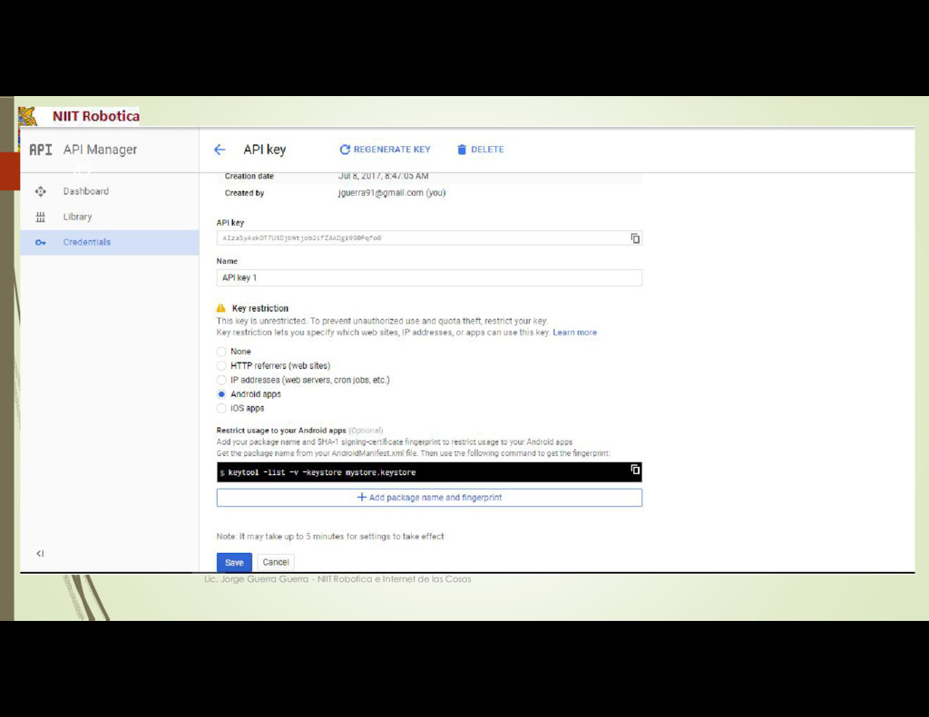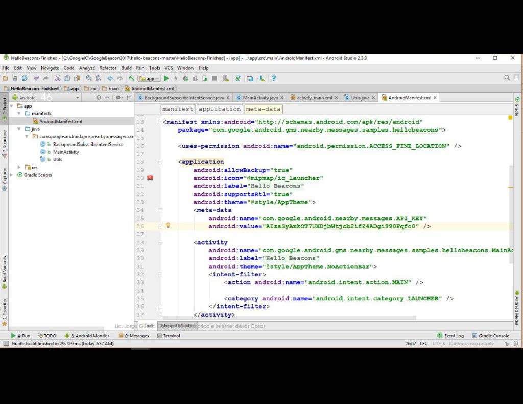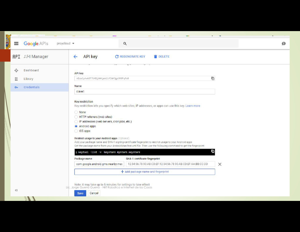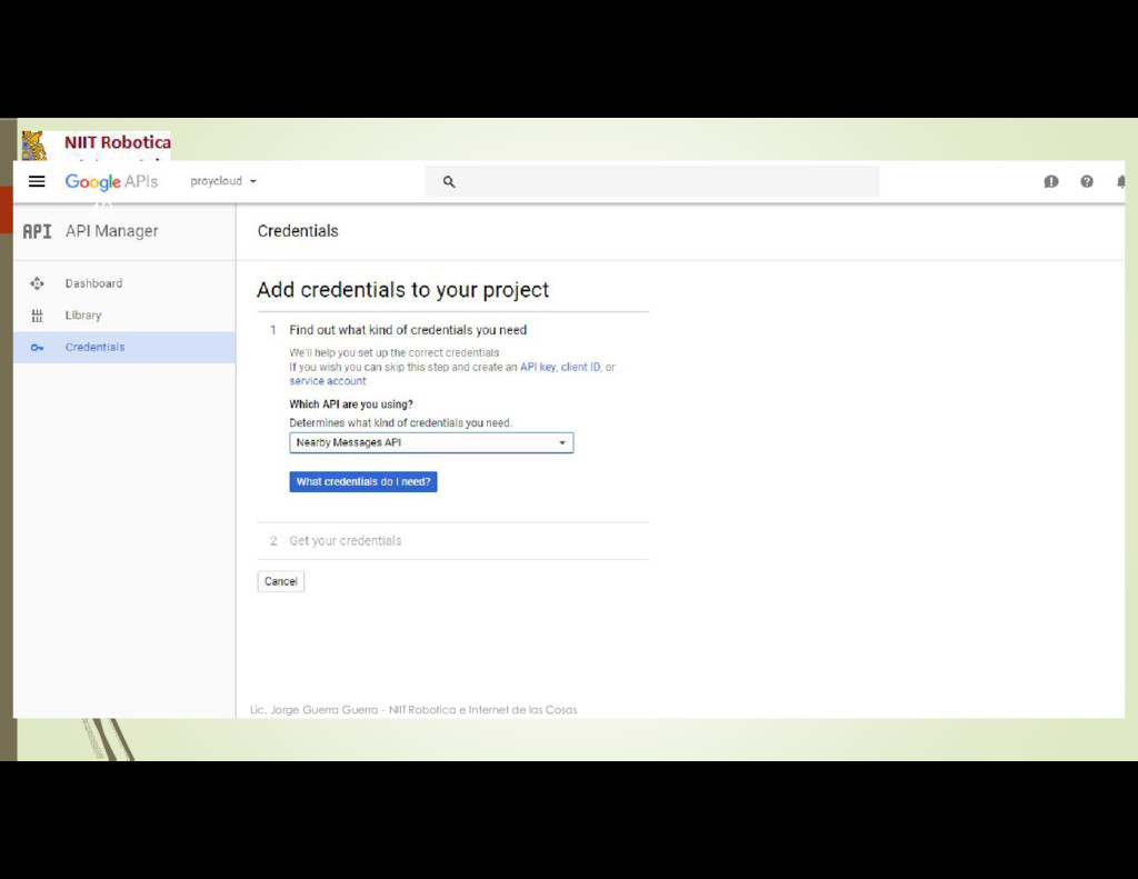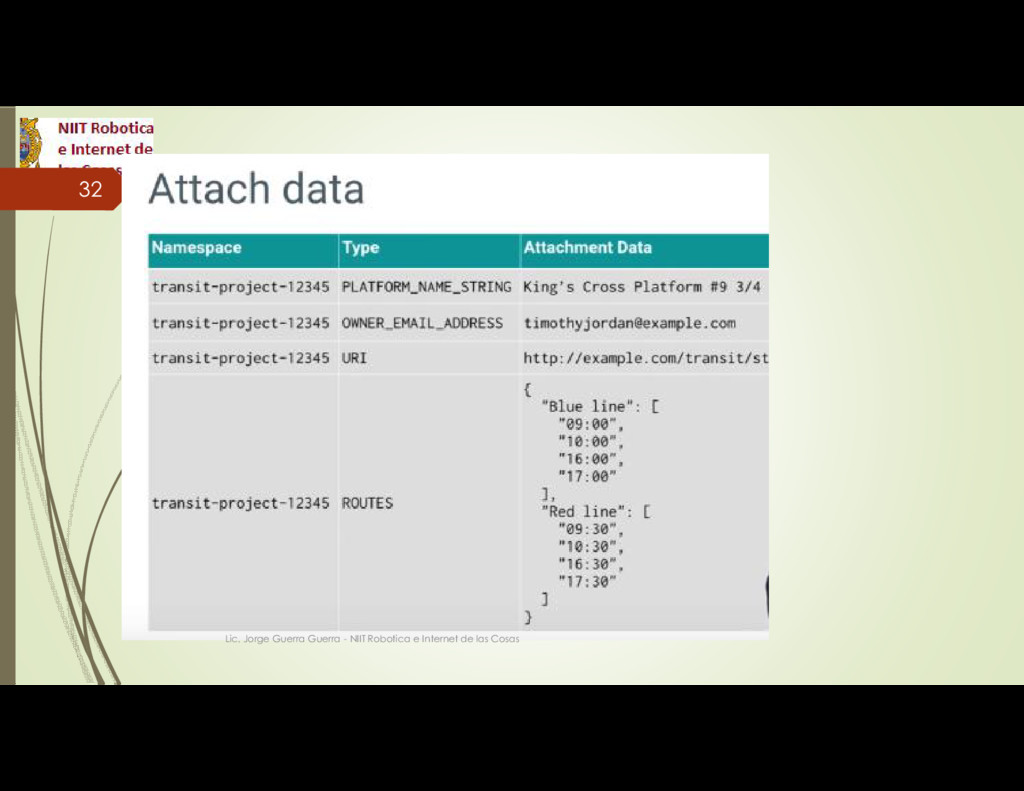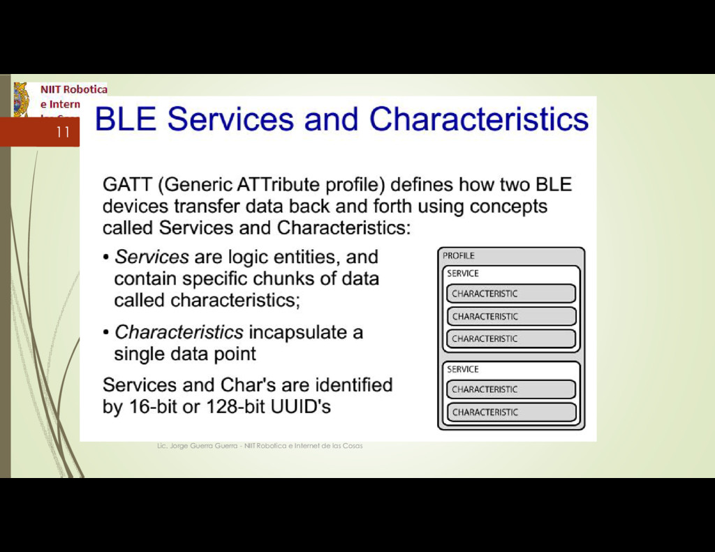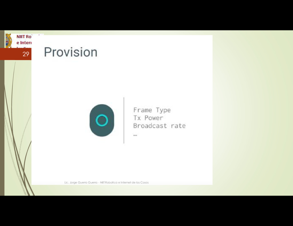 component and a 6-byte Instance component. • Eddystone-URL: A compressed URL that, once parsed and decompressed, is directly usable by the client. • Eddystone-TLM: Beacon status data that is useful for beacon fleet maintenance, and powers Google Proximity Beacon API's diagnostics endpoint. -TLM should be interleaved with an identifying frame such as Eddystone-UID or Eddystone-EID (for which the encrypted eTLM version preserves security). • Eddystone-EID: A time-varying beacon frame that can be resolved to a stable identifier by a linked resolver, such as Proximity Beacon API. Eddystone 20 Lic. Jorge Guerra Guerra - NIIT Robotica e Internet de las Cosas