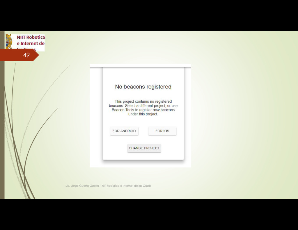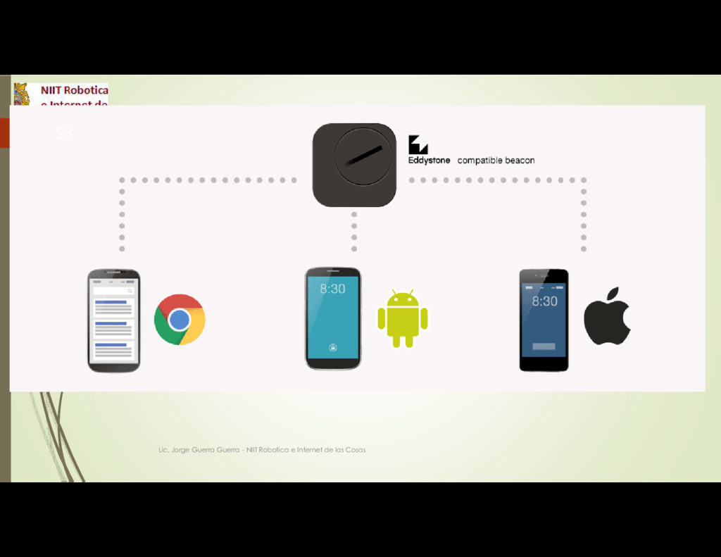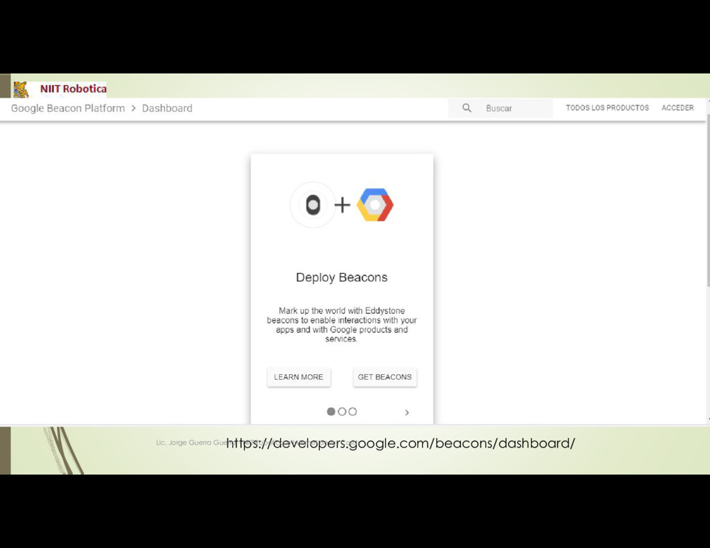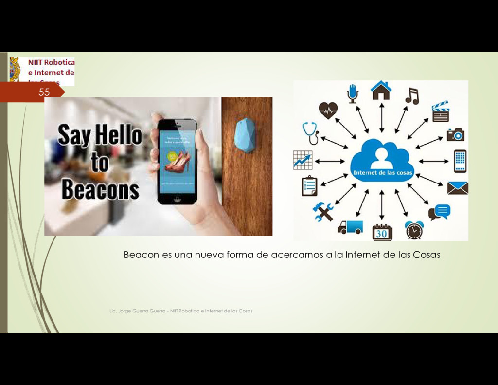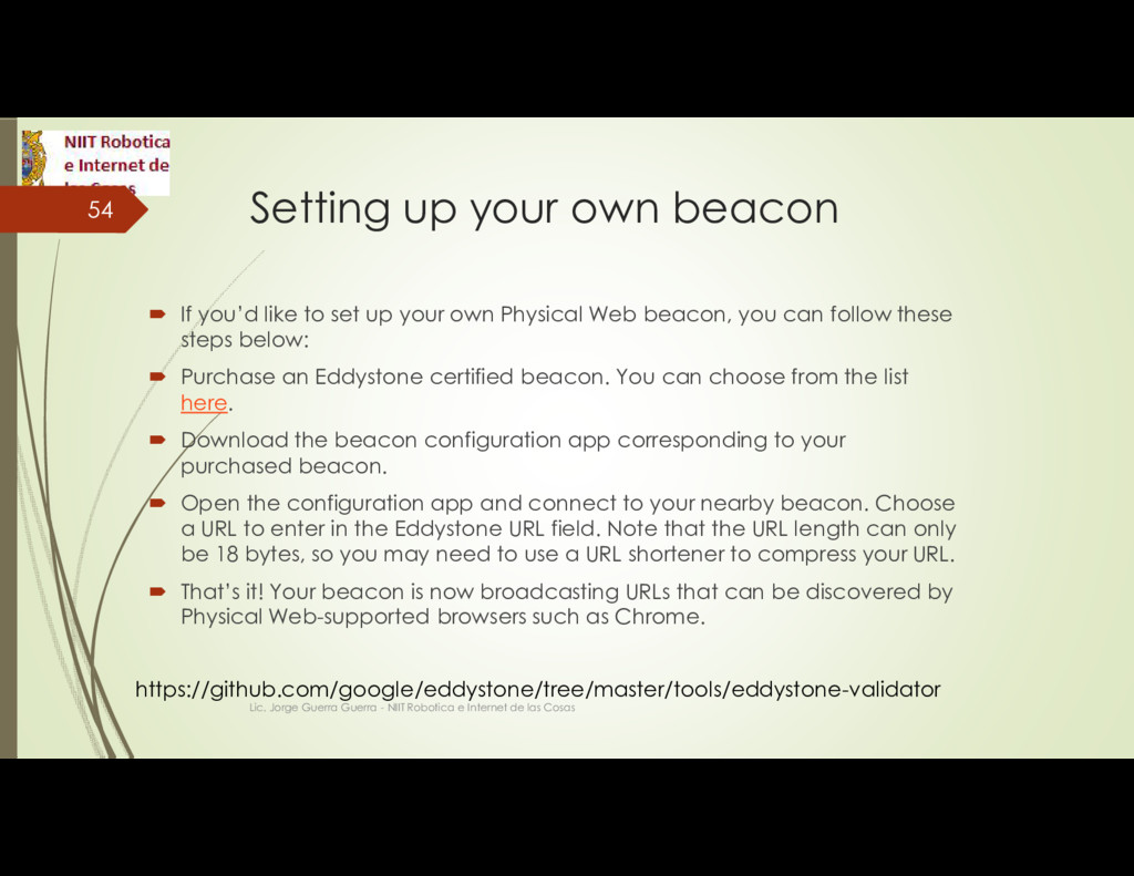 set up your own Physical Web beacon, you can follow these steps below: Purchase an Eddystone certified beacon. You can choose from the list here. Download the beacon configuration app corresponding to your purchased beacon. Open the configuration app and connect to your nearby beacon. Choose a URL to enter in the Eddystone URL field. Note that the URL length can only be 18 bytes, so you may need to use a URL shortener to compress your URL. That’s it! Your beacon is now broadcasting URLs that can be discovered by Physical Web-supported browsers such as Chrome. https://github.com/google/eddystone/tree/master/tools/eddystone-validator 54 Lic. Jorge Guerra Guerra - NIIT Robotica e Internet de las Cosas