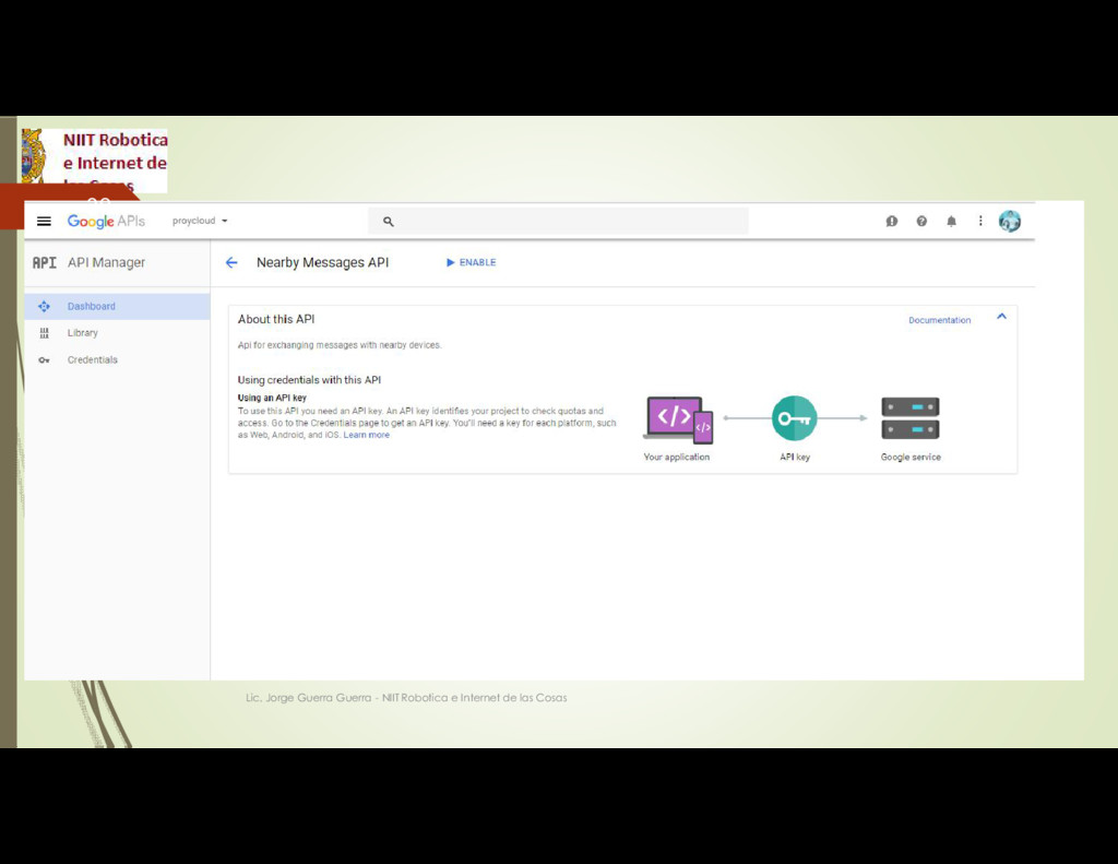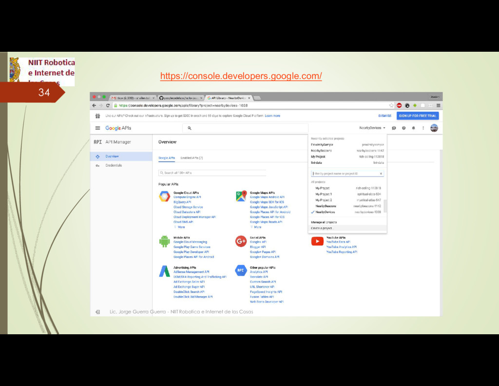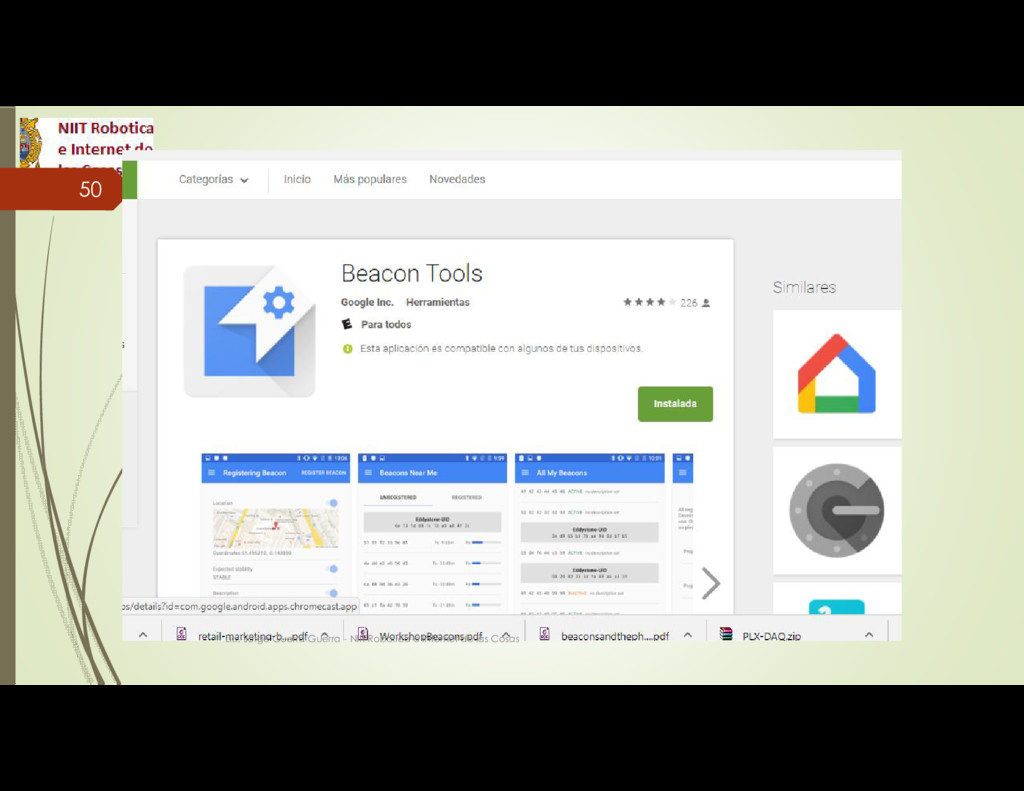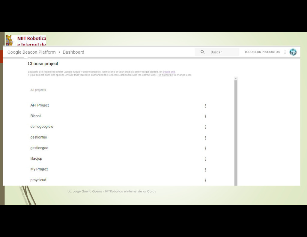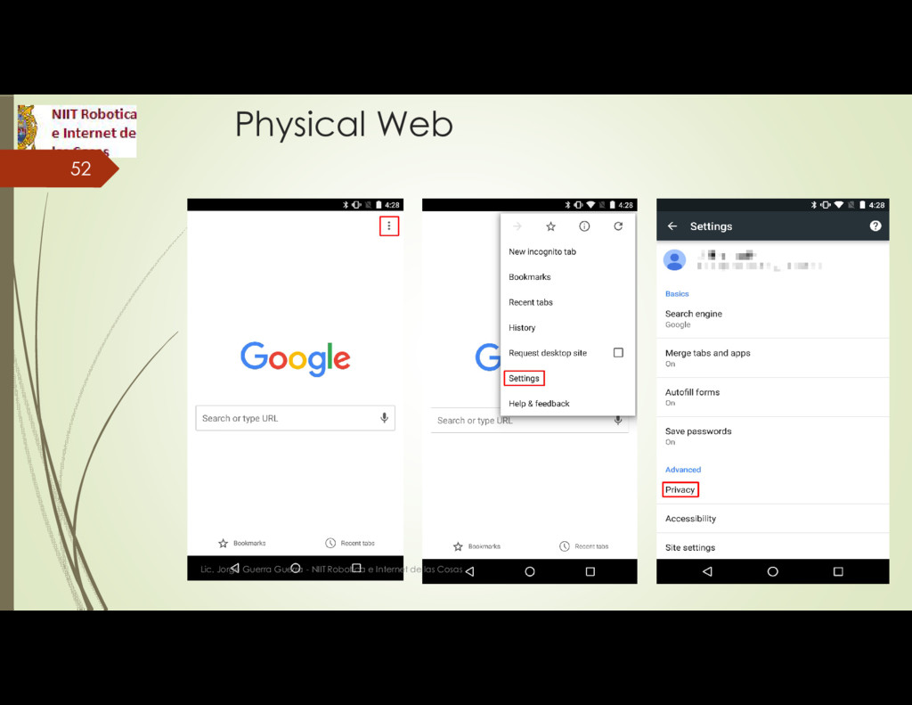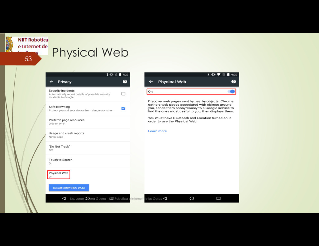 set up your own Physical Web beacon, you can follow these steps below: Purchase an Eddystone certified beacon. You can choose from the list here. Download the beacon configuration app corresponding to your purchased beacon. Open the configuration app and connect to your nearby beacon. Choose a URL to enter in the Eddystone URL field. Note that the URL length can only be 18 bytes, so you may need to use a URL shortener to compress your URL. That’s it! Your beacon is now broadcasting URLs that can be discovered by Physical Web-supported browsers such as Chrome. https://github.com/google/eddystone/tree/master/tools/eddystone-validator 54 Lic. Jorge Guerra Guerra - NIIT Robotica e Internet de las Cosas