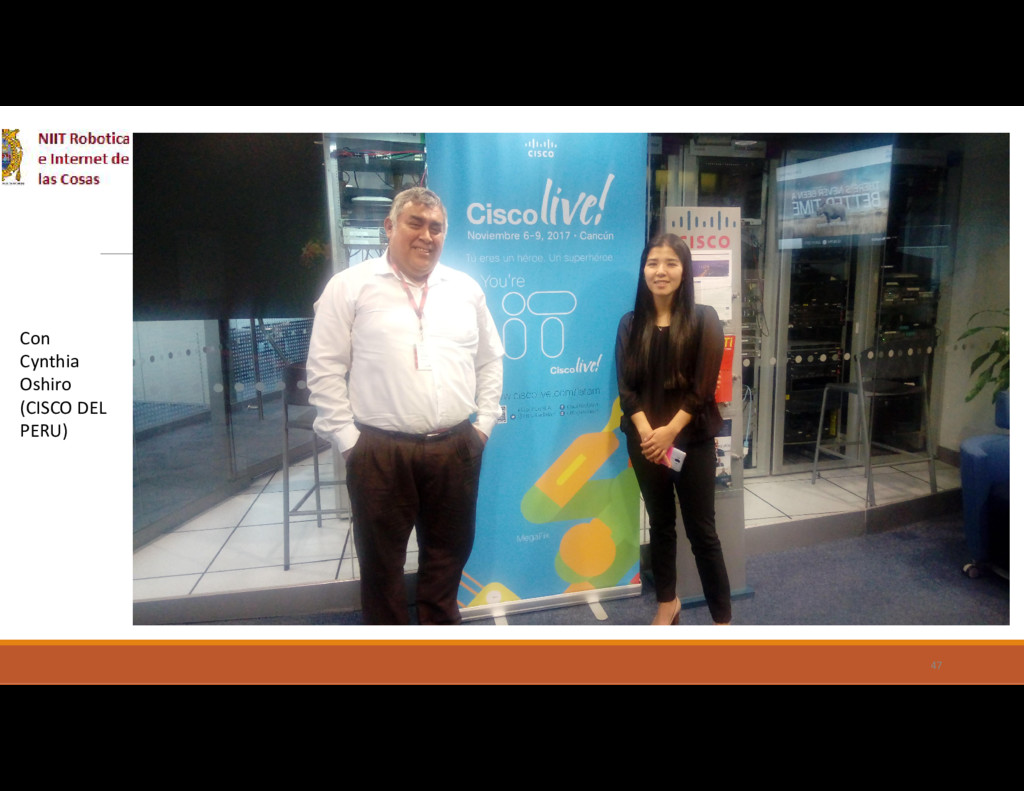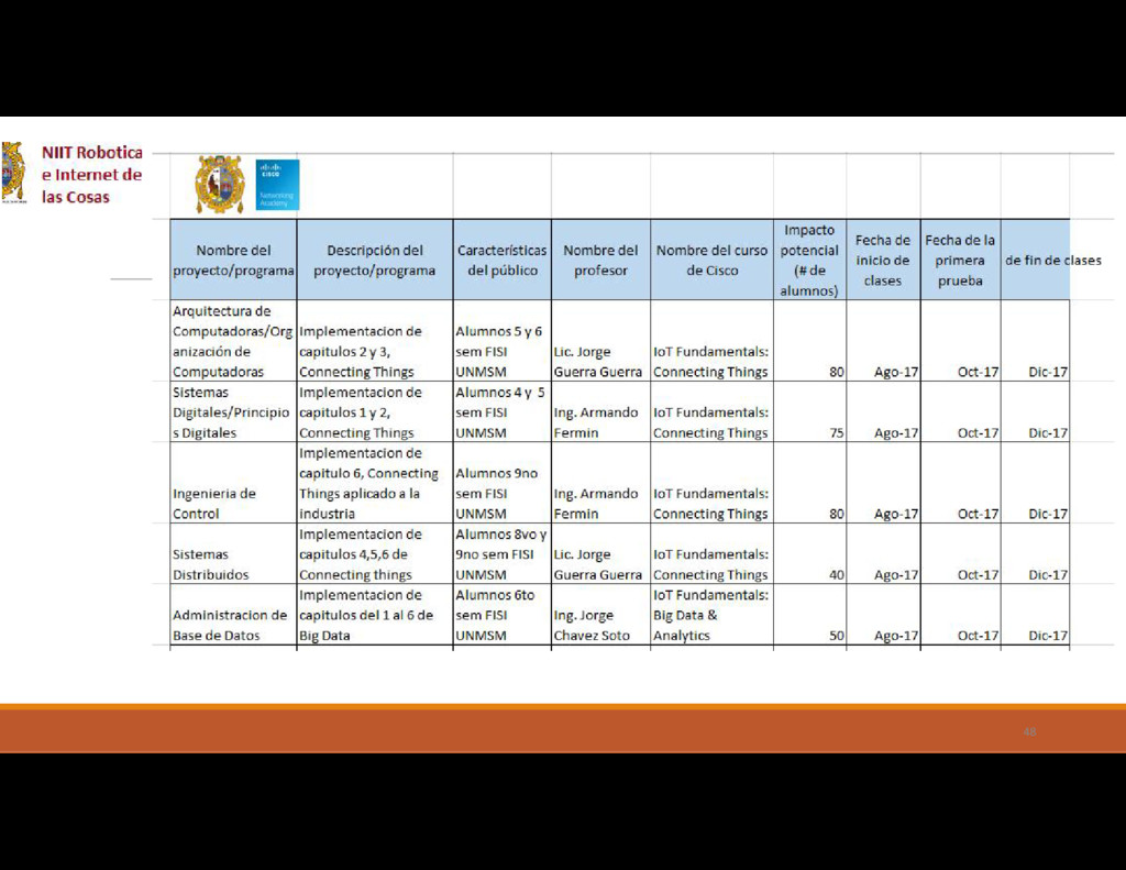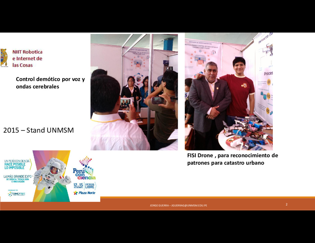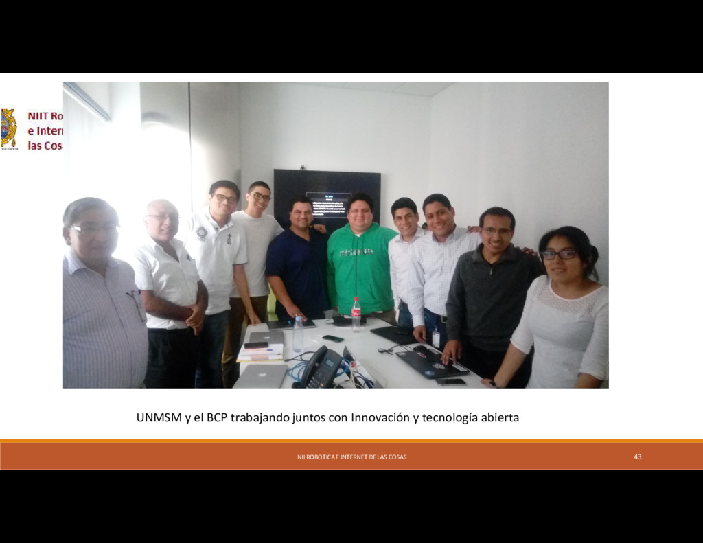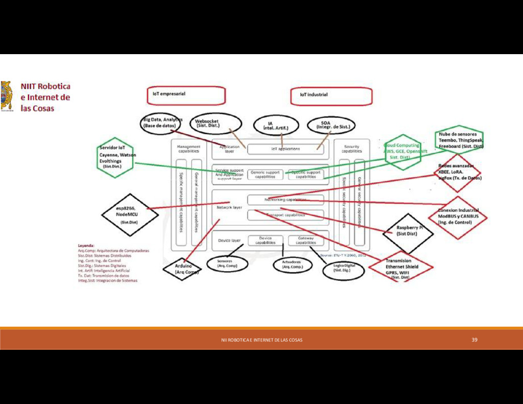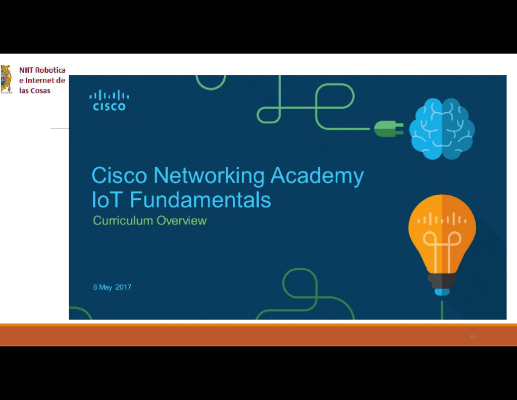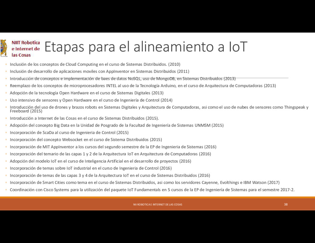 conceptos de Cloud Computing en el curso de Sistemas Distribuidos. (2010) ◦ Inclusión de desarrollo de aplicaciones moviles con AppInventor en Sistemas Distribuidos (2011) ◦ Introducción de conceptos e implementación de baes de datos NoSQL, uso de MongoDB, en Sistemas Distribuidos (2013) ◦ Reemplazo de los conceptos de microprocesadores INTEL al uso de la Tecnología Arduino, en el curso de Arquitectura de Computadoras (2013) ◦ Adopción de la tecnología Open Hardware en el curso de Sistemas Digitales (2013) ◦ Uso intensivo de sensores y Open Hardware en el curso de Ingeniería de Control (2014) ◦ Introducción del uso de drones y brazos robots en Sistemas Digitales y Arquitectura de Computadoras, asi como el uso de nubes de sensores como Thingspeak y Freeboard (2015) ◦ Introducción a Internet de las Cosas en el curso de Sistemas Distribuidos (2015). ◦ Adopción del concepto Big Data en la Unidad de Posgrado de la Facultad de Ingeniería de Sistemas UNMSM (2015) ◦ Incorporación de ScaDa al curso de Ingenieria de Control (2015) ◦ Incorporación del concepto Websocket en el curso de Sistema Distribuidos (2015) ◦ Incorporación de MIT AppInventor a los cursos del segundo semestre de la EP de Ingenieria de Sistemas (2016) ◦ Incorporación del temario de las capas 1 y 2 de la Arquitectura IoT en Arquitectura de Computadoras (2016) ◦ Adopción del modelo IoT en el curso de Inteligencia Artificial en el desarrollo de proyectos (2016) ◦ Incorporación de temas sobre IoT industrial en el curso de Ingenieria de Control (2016) ◦ Incorporación de temas de las capas 3 y 4 de la Arquitectura IoT en el curso de Sistemas Distribuidos (2016) ◦ Incorporación de Smart Cities como tema en el curso de Sistemas Distribuidos, asi como los servidores Cayenne, Evolthings e IBM Watson (2017) ◦ Coordinación con Cisco Systems para la utilización del paquete IoT Fundamentals en 5 cursos de la EP de Ingeniería de Sistemas para el semestre 2017-2. NII ROBOTICA E INTERNET DE LAS COSAS 38