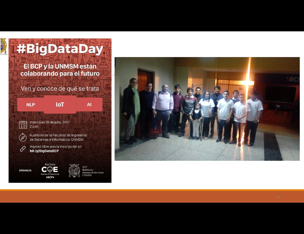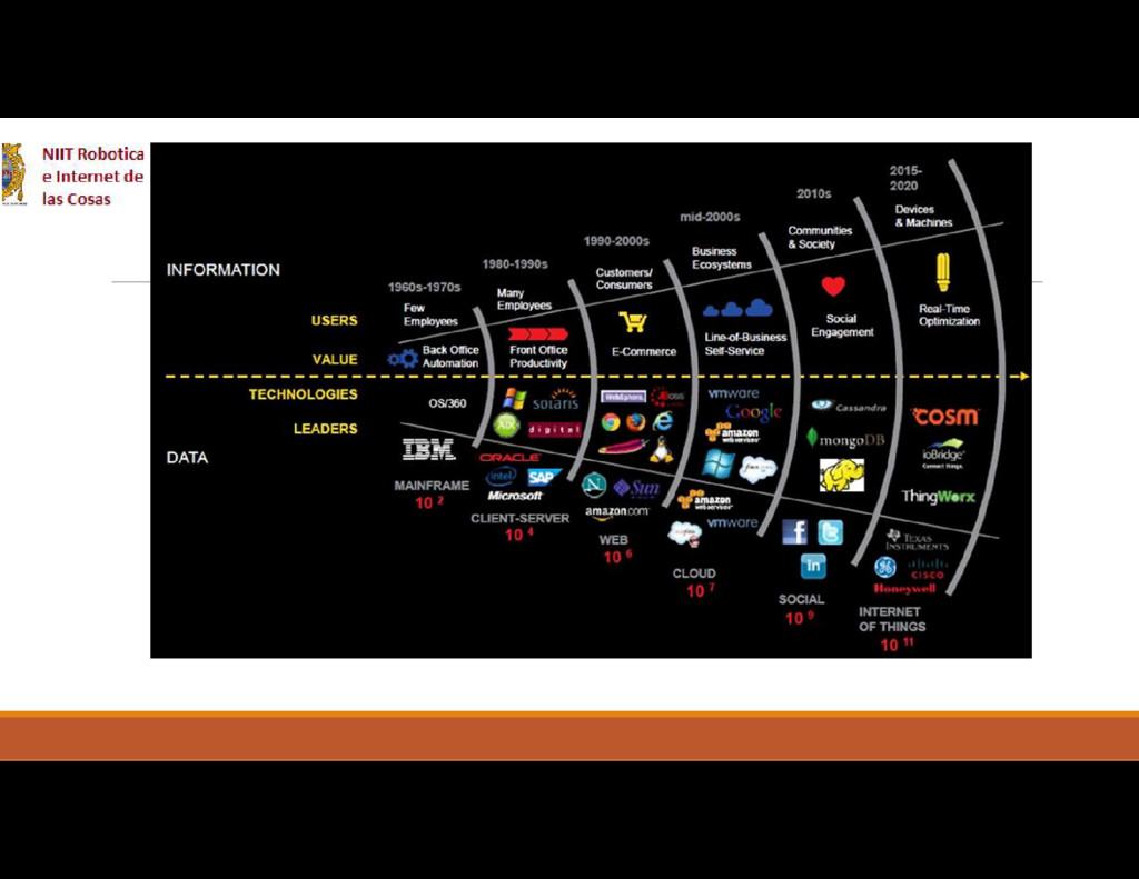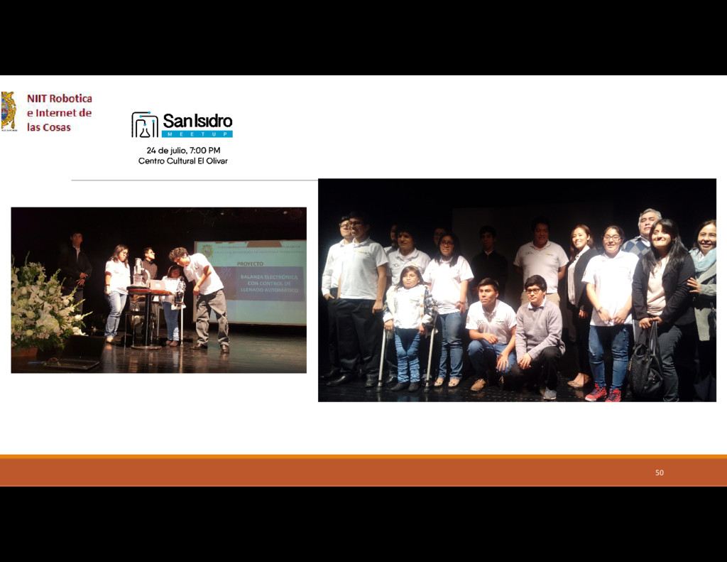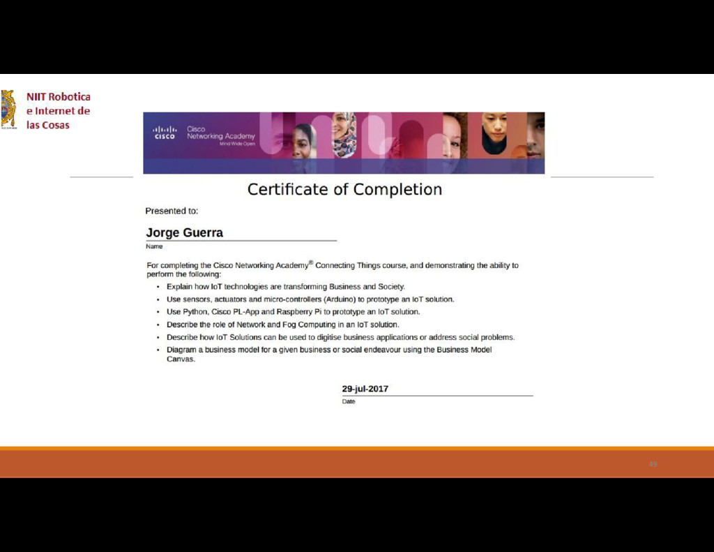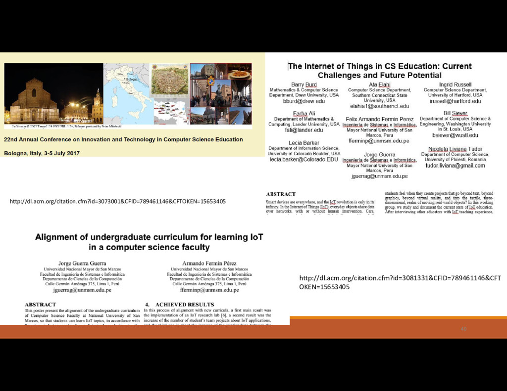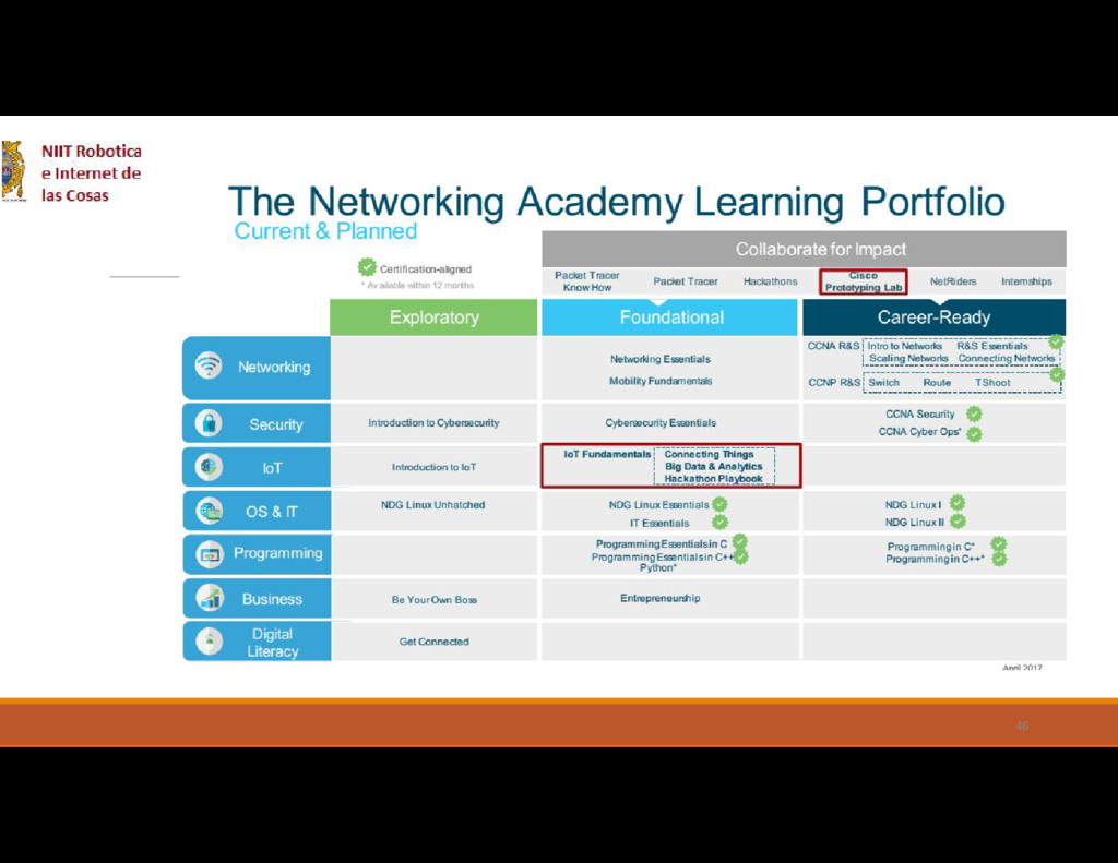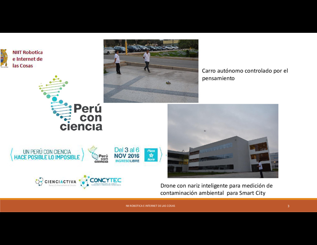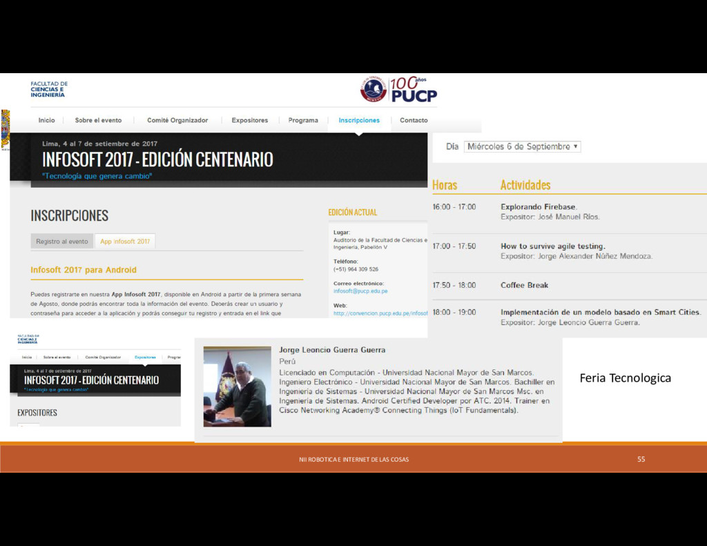 conceptos de Cloud Computing en el curso de Sistemas Distribuidos. (2010) ◦ Inclusión de desarrollo de aplicaciones moviles con AppInventor en Sistemas Distribuidos (2011) ◦ Introducción de conceptos e implementación de baes de datos NoSQL, uso de MongoDB, en Sistemas Distribuidos (2013) ◦ Reemplazo de los conceptos de microprocesadores INTEL al uso de la Tecnología Arduino, en el curso de Arquitectura de Computadoras (2013) ◦ Adopción de la tecnología Open Hardware en el curso de Sistemas Digitales (2013) ◦ Uso intensivo de sensores y Open Hardware en el curso de Ingeniería de Control (2014) ◦ Introducción del uso de drones y brazos robots en Sistemas Digitales y Arquitectura de Computadoras, asi como el uso de nubes de sensores como Thingspeak y Freeboard (2015) ◦ Introducción a Internet de las Cosas en el curso de Sistemas Distribuidos (2015). ◦ Adopción del concepto Big Data en la Unidad de Posgrado de la Facultad de Ingeniería de Sistemas UNMSM (2015) ◦ Incorporación de ScaDa al curso de Ingenieria de Control (2015) ◦ Incorporación del concepto Websocket en el curso de Sistema Distribuidos (2015) ◦ Incorporación de MIT AppInventor a los cursos del segundo semestre de la EP de Ingenieria de Sistemas (2016) ◦ Incorporación del temario de las capas 1 y 2 de la Arquitectura IoT en Arquitectura de Computadoras (2016) ◦ Adopción del modelo IoT en el curso de Inteligencia Artificial en el desarrollo de proyectos (2016) ◦ Incorporación de temas sobre IoT industrial en el curso de Ingenieria de Control (2016) ◦ Incorporación de temas de las capas 3 y 4 de la Arquitectura IoT en el curso de Sistemas Distribuidos (2016) ◦ Incorporación de Smart Cities como tema en el curso de Sistemas Distribuidos, asi como los servidores Cayenne, Evolthings e IBM Watson (2017) ◦ Coordinación con Cisco Systems para la utilización del paquete IoT Fundamentals en 5 cursos de la EP de Ingeniería de Sistemas para el semestre 2017-2. NII ROBOTICA E INTERNET DE LAS COSAS 38