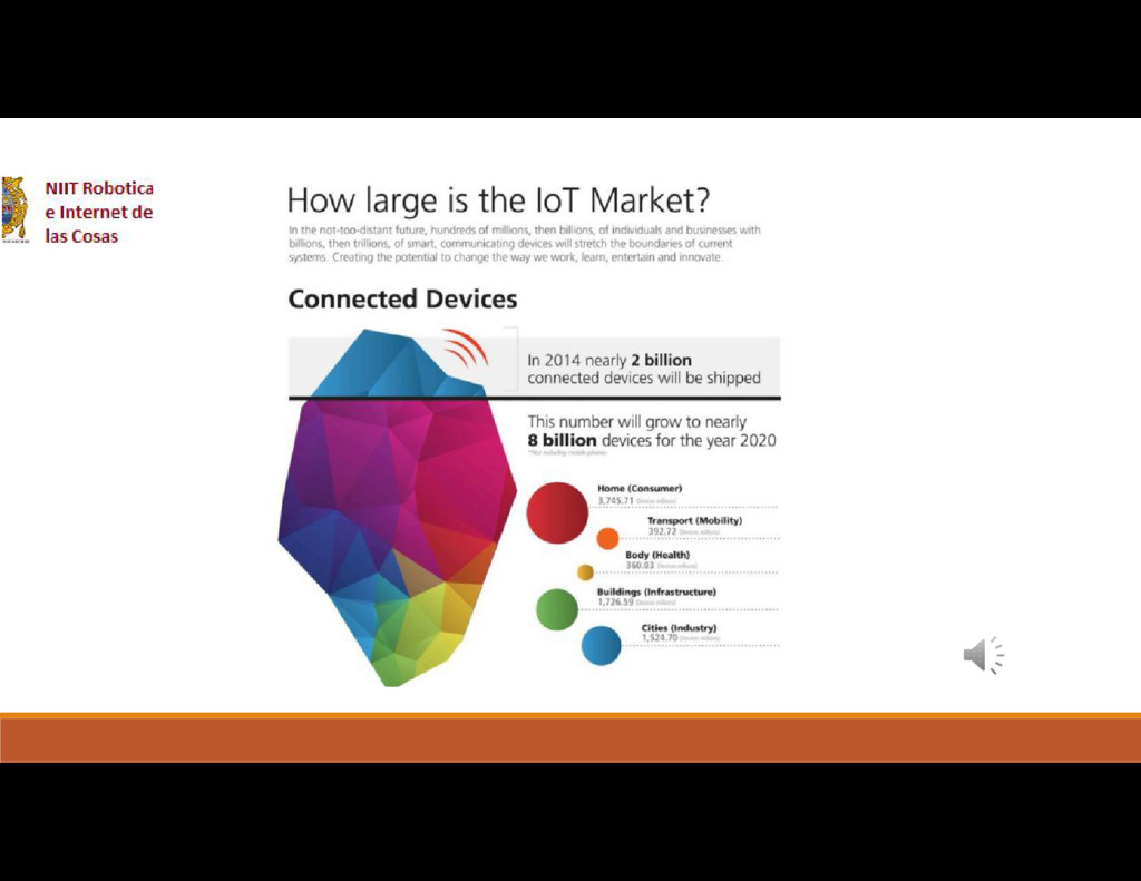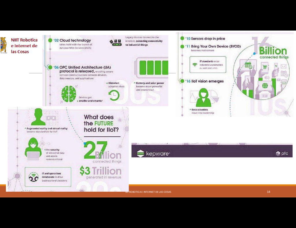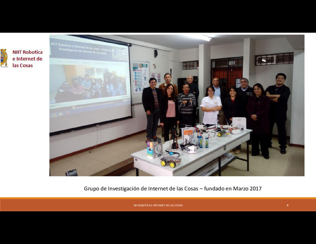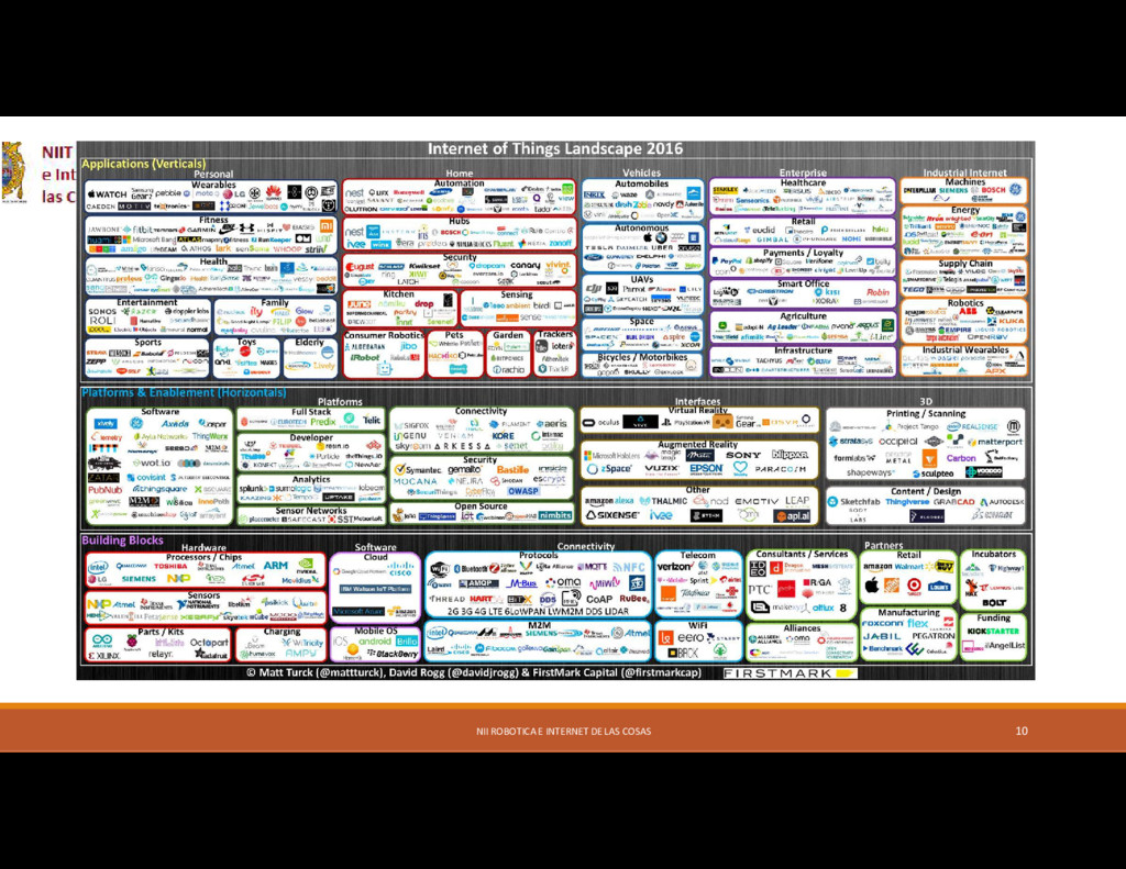 Introducción al tema de Internet de las Cosas. Visión general y campos de acción definidos donde IoT juega un papel importante. Se presenta un resumen de actividades del NIIT de Robotica e Internet de las cosas UNMSM hasta julio 2017