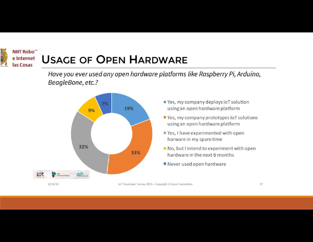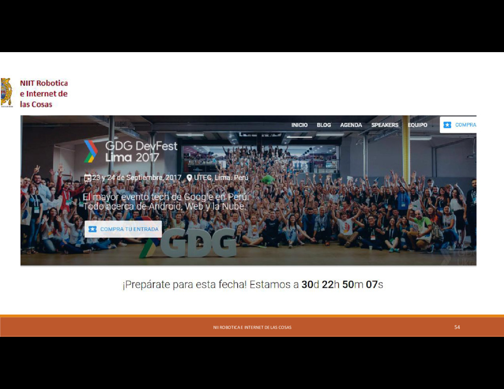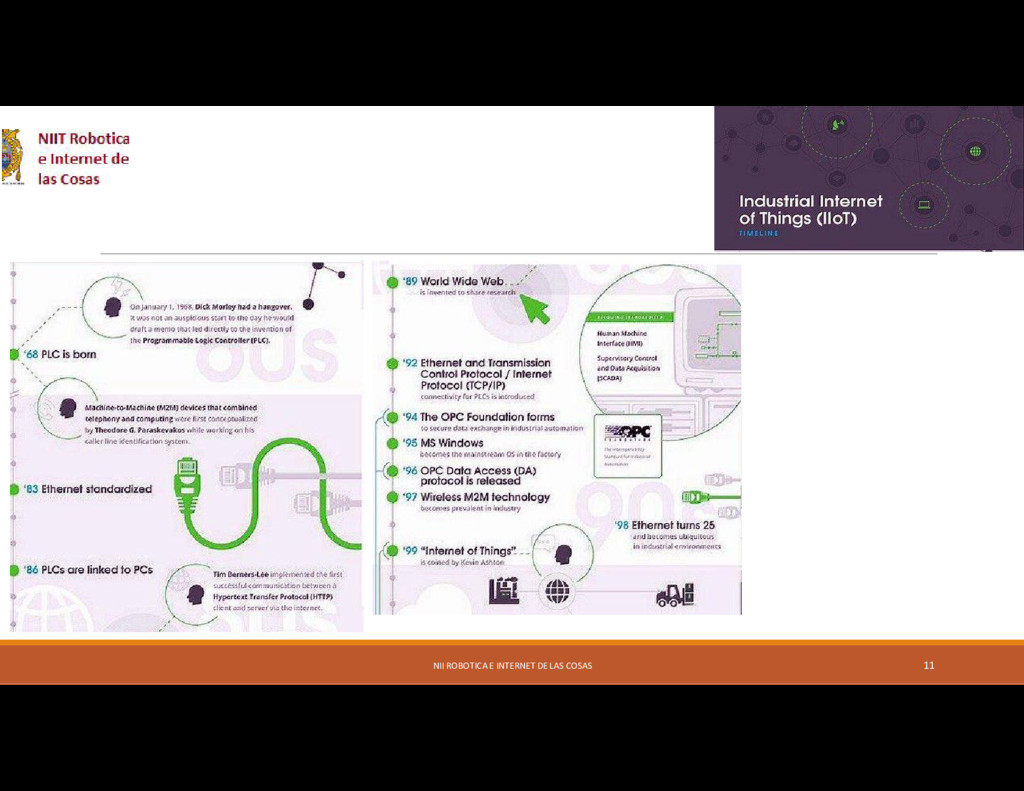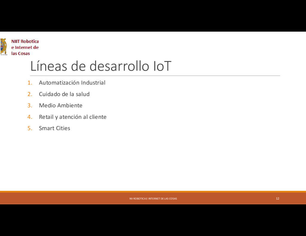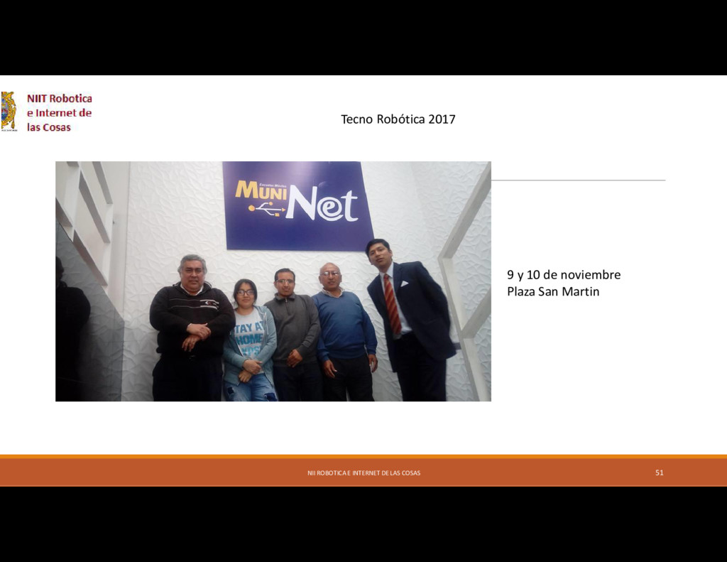 Introducción al tema de Internet de las Cosas. Visión general y campos de acción definidos donde IoT juega un papel importante. Se presenta un resumen de actividades del NIIT de Robotica e Internet de las cosas UNMSM hasta julio 2017