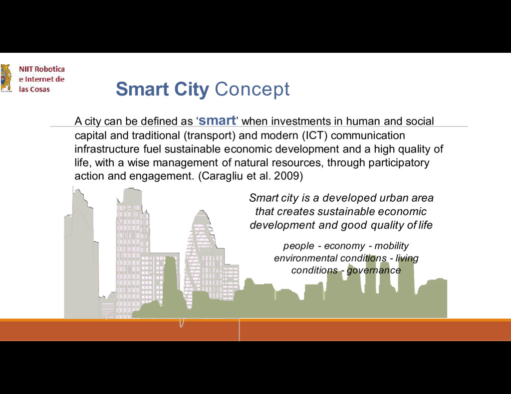 when investments in human and social capital and traditional (transport) and modern (ICT) communication infrastructure fuel sustainable economic development and a high quality of life, with a wise management of natural resources, through participatory action and engagement. (Caragliu et al. 2009) Smart city is a developed urban area that creates sustainable economic development and good quality of life people - economy - mobility environmental conditions - living conditions - governance