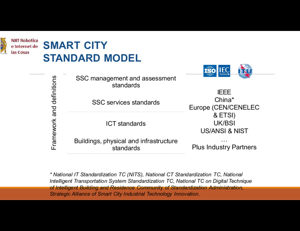 Buildings, physical and infrastructure standards Framework and definitions SMART CITY STANDARD MODEL IEEE China* Europe (CEN/CENELEC & ETSI) UK/BSI US/ANSI & NIST … Plus Industry Partners * National IT Standardization TC (NITS), National CT Standardization TC, National Intelligent Transportation System Standardization TC, National TC on Digital Technique of Intelligent Building and Residence Community of Standardization Administration, Strategic Alliance of Smart City Industrial Technology Innovation.