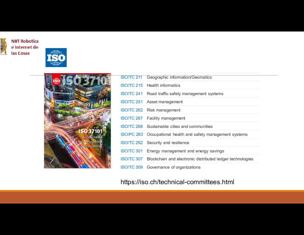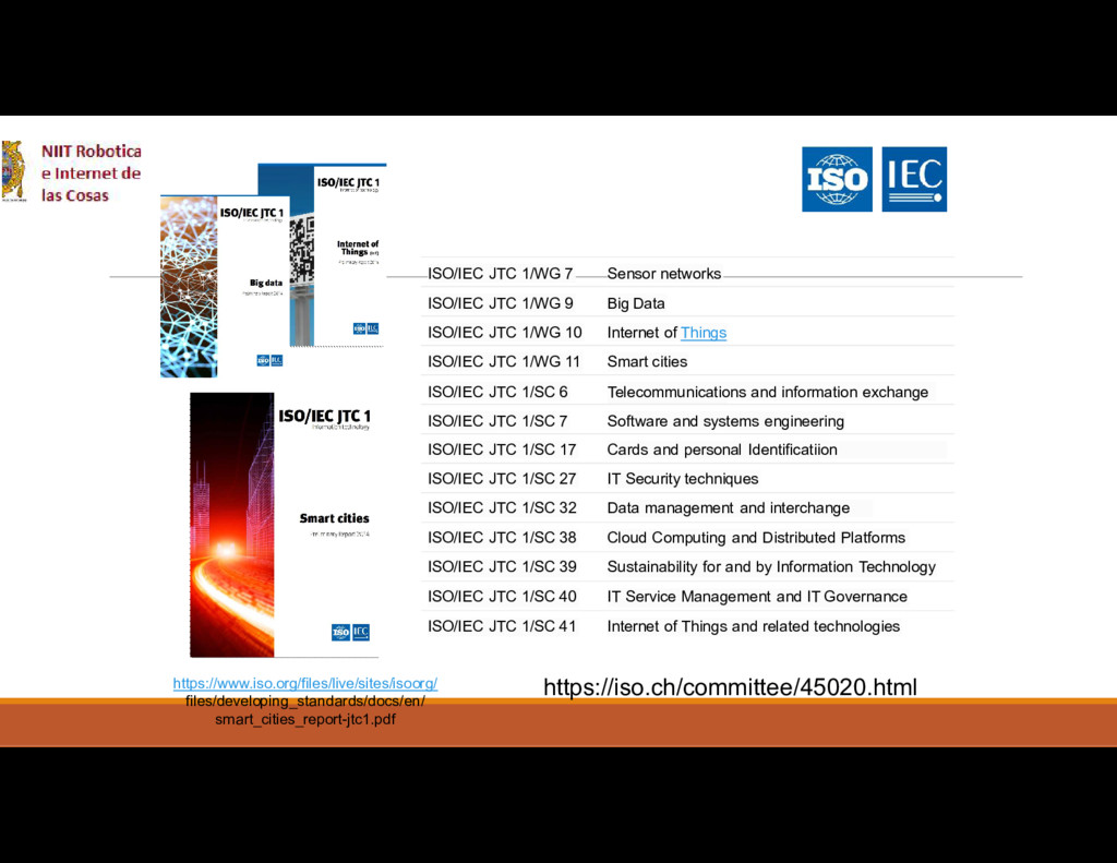 JTC 1/WG 9 Big Data ISO/IEC JTC 1/WG 10 Internet of Things ISO/IEC JTC 1/WG 11 Smart cities ISO/IEC JTC 1/SC 6 Telecommunications and information exchange ISO/IEC JTC 1/SC 7 Software and systems engineering ISO/IEC JTC 1/SC 17 Cards and personal Identificatiion ISO/IEC JTC 1/SC 27 IT Security techniques ISO/IEC JTC 1/SC 32 Data management and interchange ISO/IEC JTC 1/SC 38 Cloud Computing and Distributed Platforms ISO/IEC JTC 1/SC 39 Sustainability for and by Information Technology ISO/IEC JTC 1/SC 40 IT Service Management and IT Governance ISO/IEC JTC 1/SC 41 Internet of Things and related technologies https://iso.ch/committee/45020.html