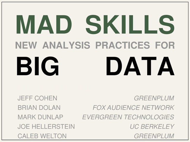 Magnetic, Agile and Deep Analytics: new approaches to handling Big Data, with a case study at Fox Audience Network over Greenplum. Discussion of warehouse design philosophy, scalable statistical methods, and engine requirements.