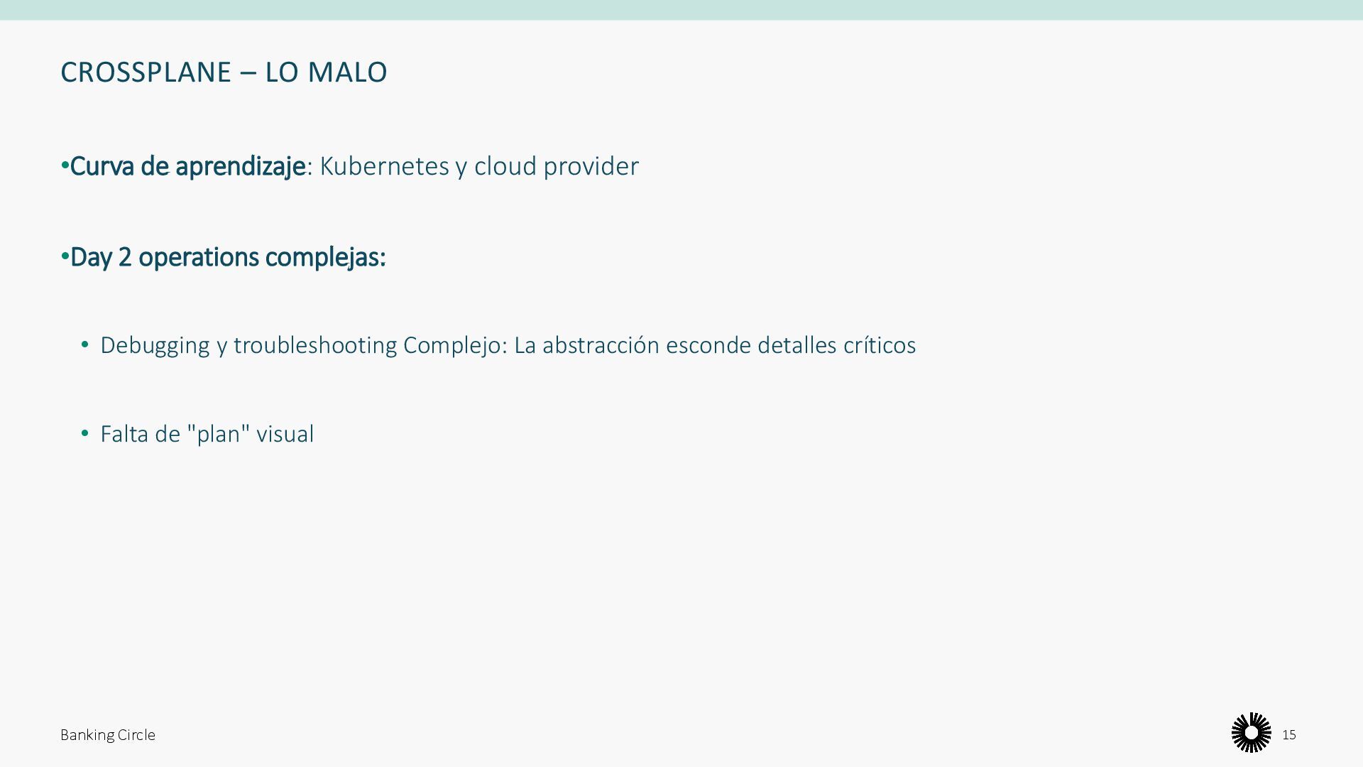 Kubernetes y cloud provider •Day 2 operations complejas: • Debugging y troubleshooting Complejo: La abstracción esconde detalles críticos • Falta de "plan" visual