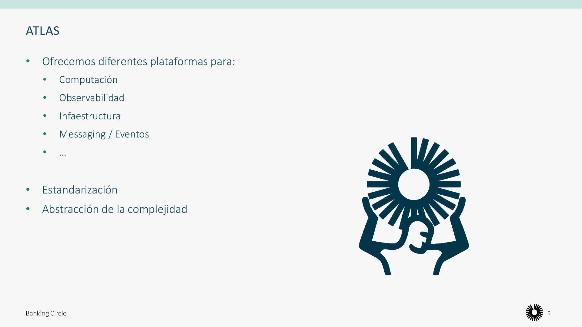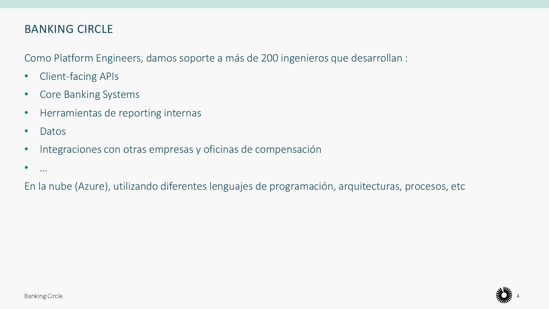 200 ingenieros que desarrollan : • Client-facing APIs • Core Banking Systems • Herramientas de reporting internas • Datos • Integraciones con otras empresas y oficinas de compensación • … En la nube (Azure), utilizando diferentes lenguajes de programación, arquitecturas, procesos, etc Banking Circle 4