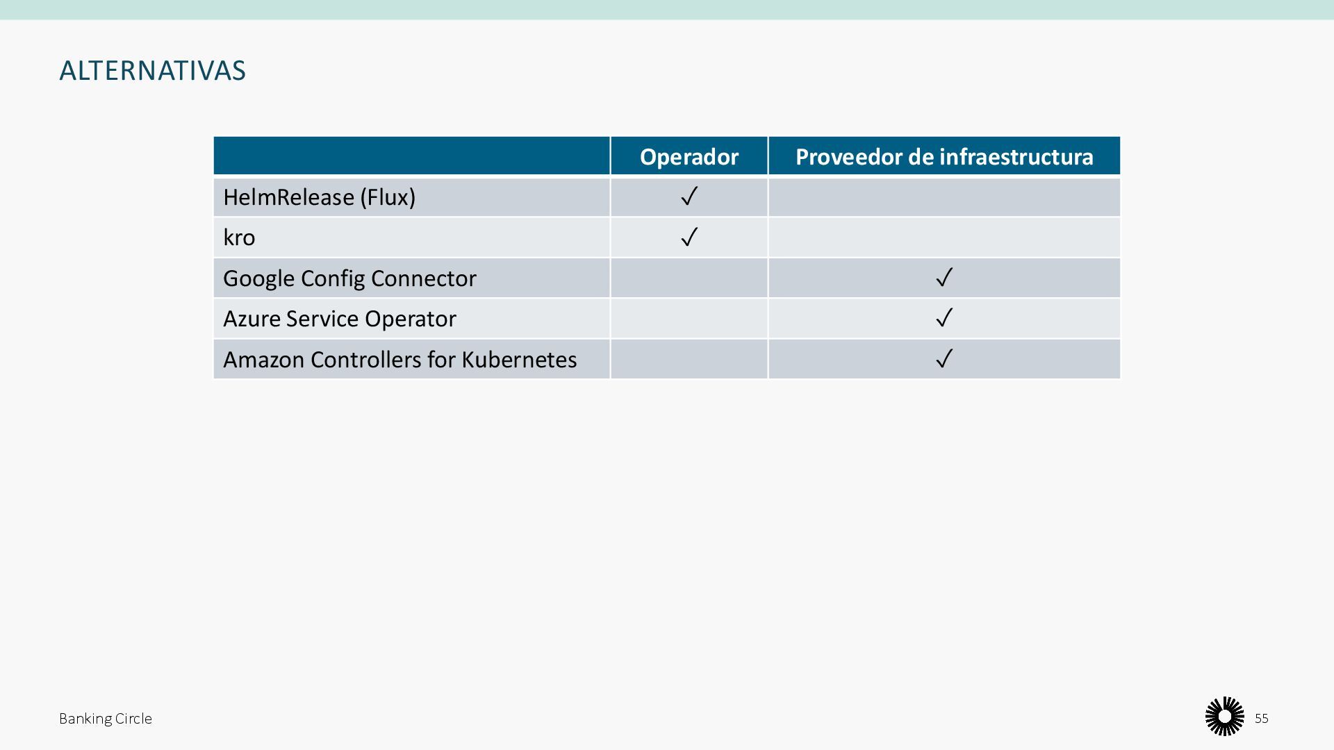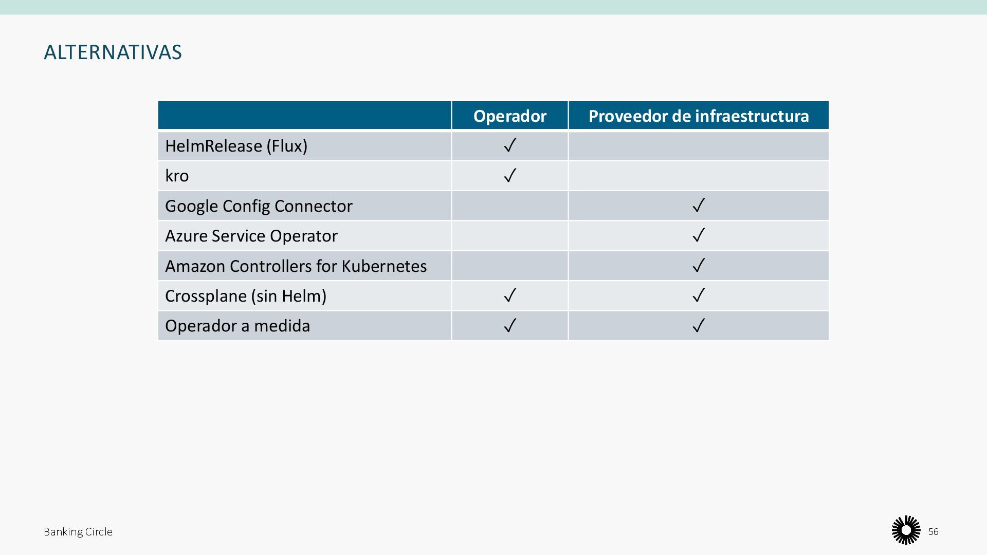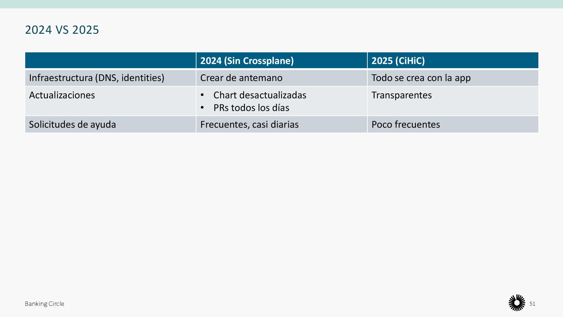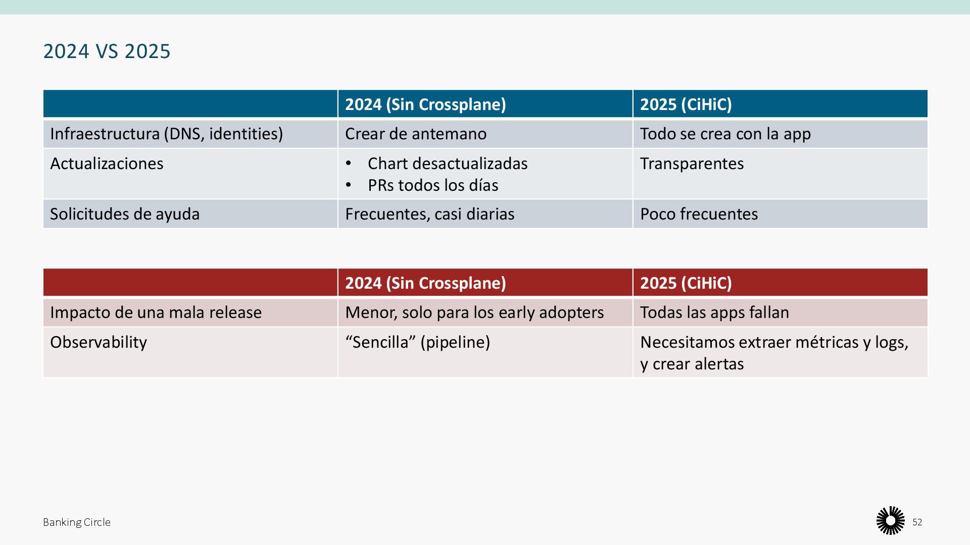 (CiHiC) Infraestructura (DNS, identities) Crear de antemano Todo se crea con la app Actualizaciones • Chart desactualizadas • PRs todos los días Transparentes Solicitudes de ayuda Frecuentes, casi diarias Poco frecuentes 2024 (Sin Crossplane) 2025 (CiHiC) Impacto de una mala release Menor, solo para los early adopters Todas las apps fallan Observability “Sencilla” (pipeline) Necesitamos extraer métricas y logs, y crear alertas