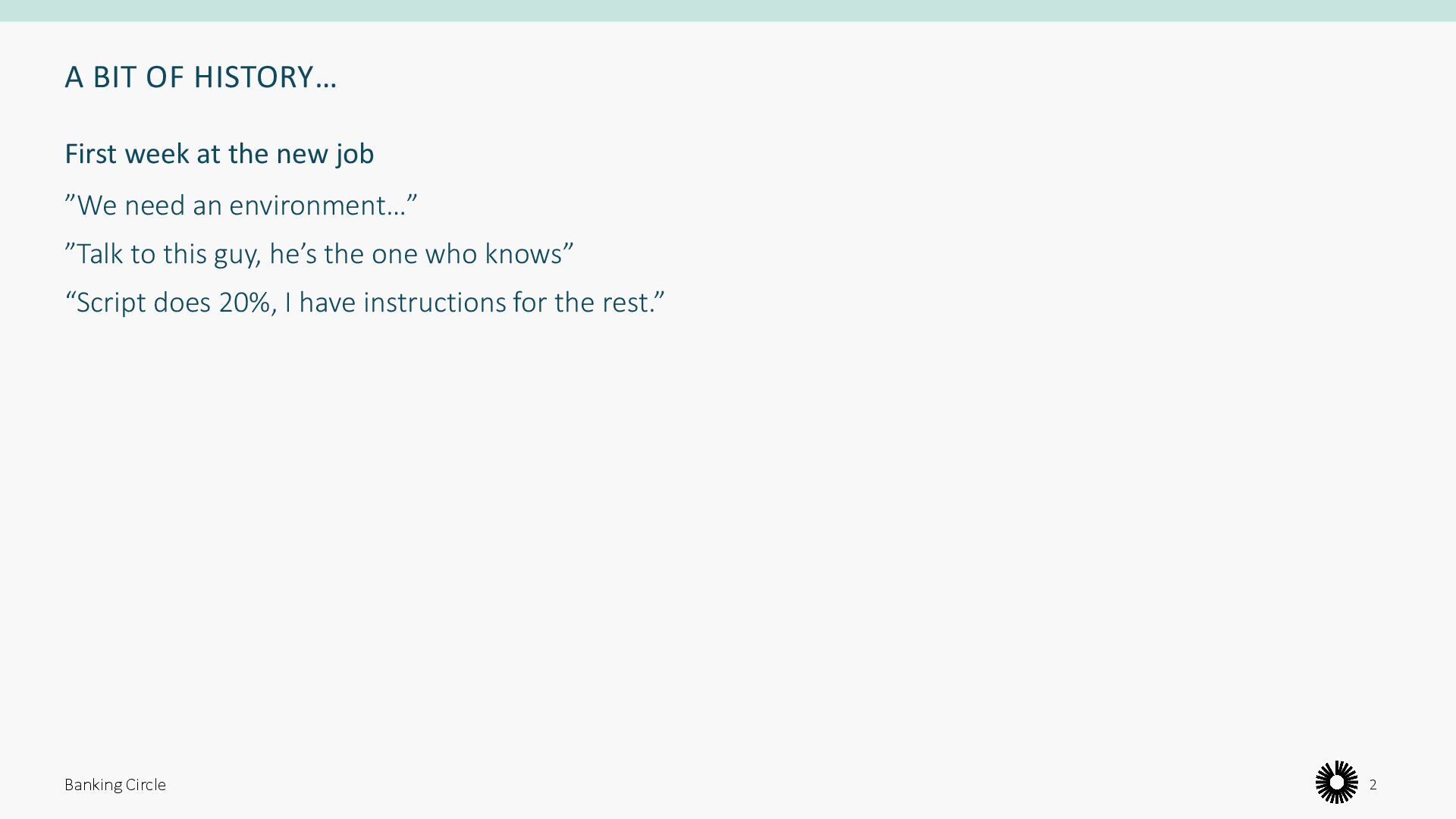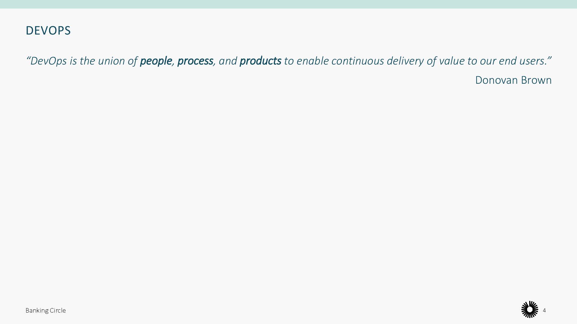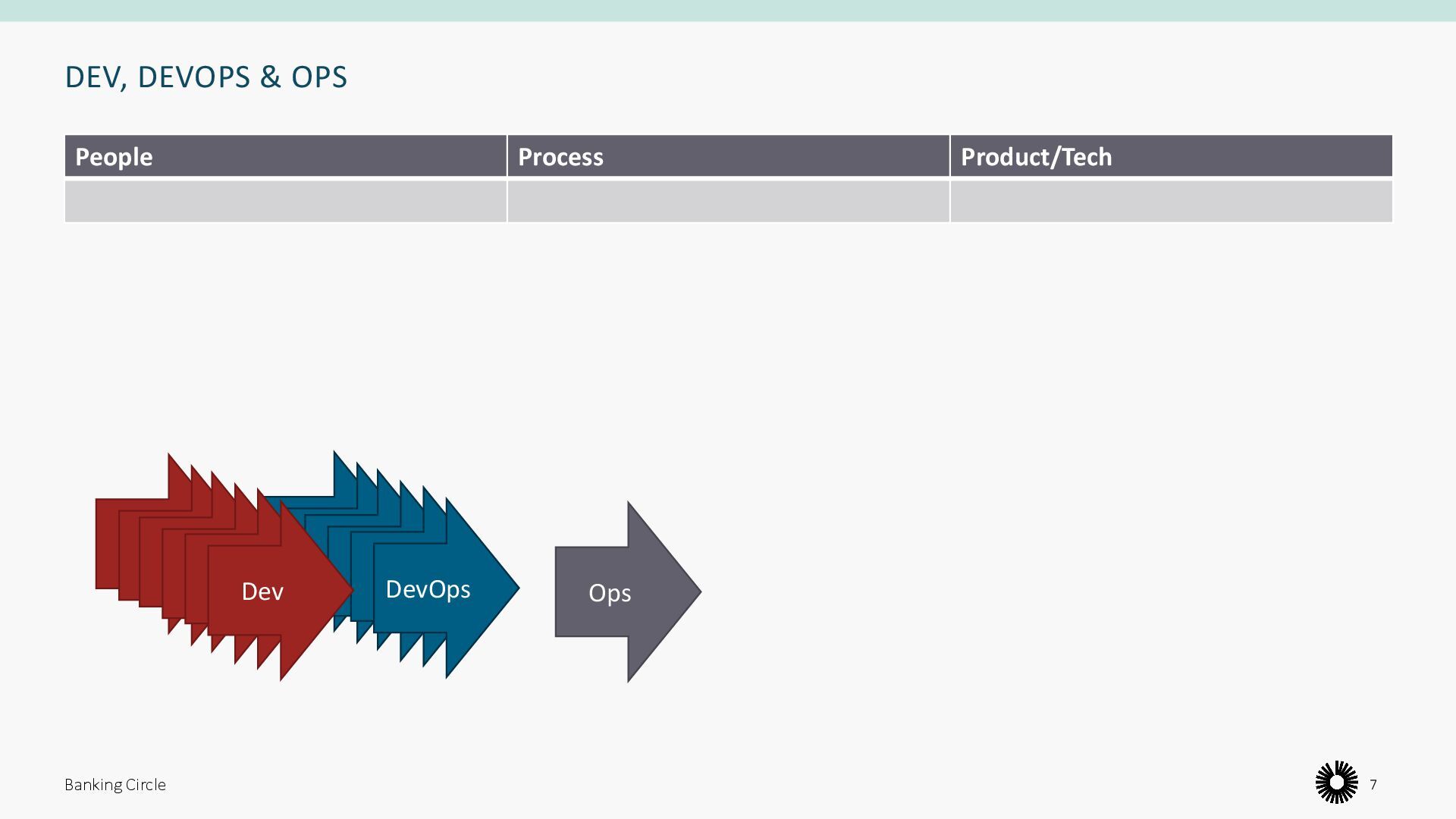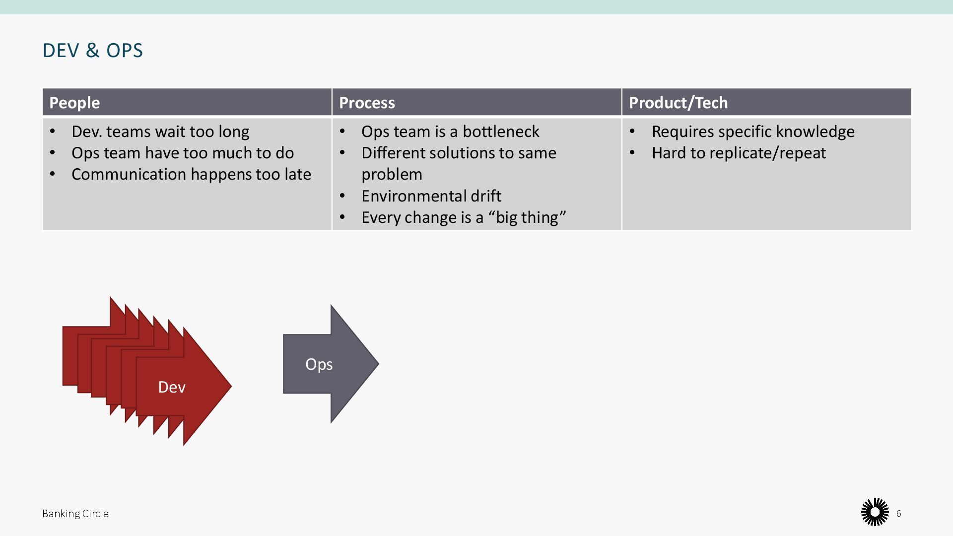 too long • Ops team have too much to do • Communication happens too late • Ops team is a bottleneck • Different solutions to same problem • Environmental drift • Every change is a “big thing” • Requires specific knowledge • Hard to replicate/repeat Banking Circle 6 Dev Ops Dev Dev Dev Dev Dev