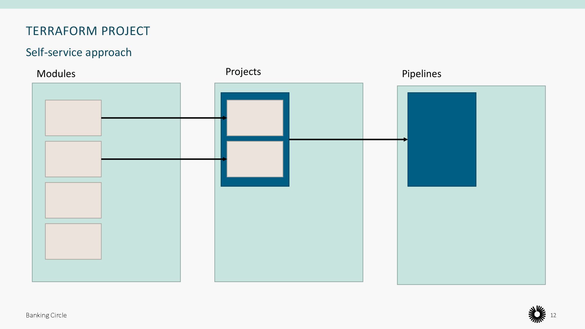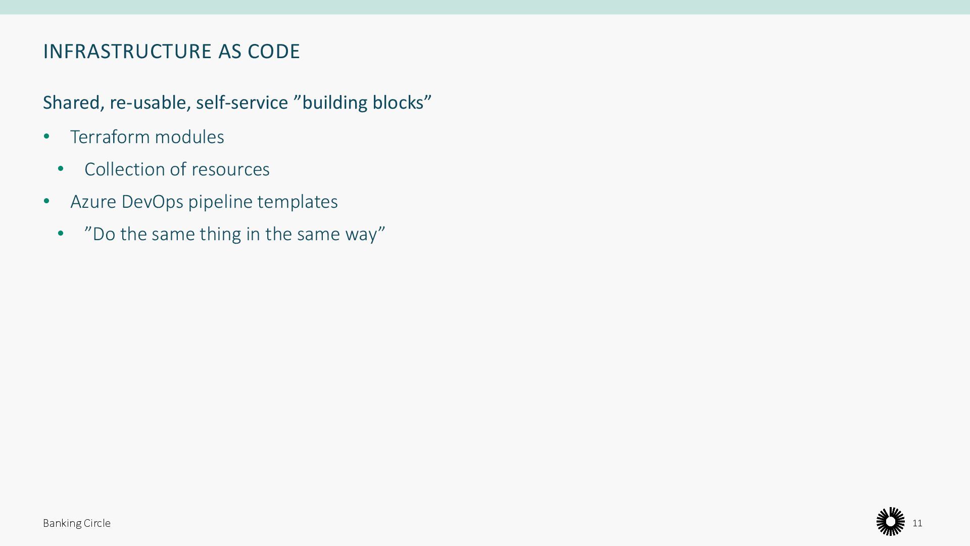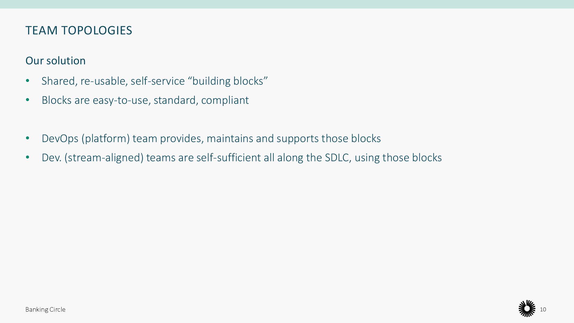 are easy-to-use, standard, compliant • DevOps (platform) team provides, maintains and supports those blocks • Dev. (stream-aligned) teams are self-sufficient all along the SDLC, using those blocks Banking Circle 10 Our solution