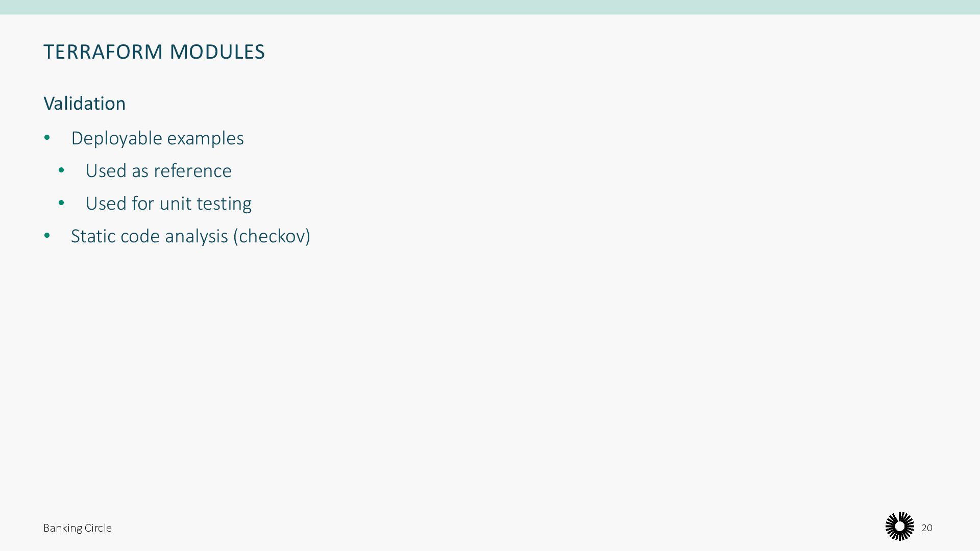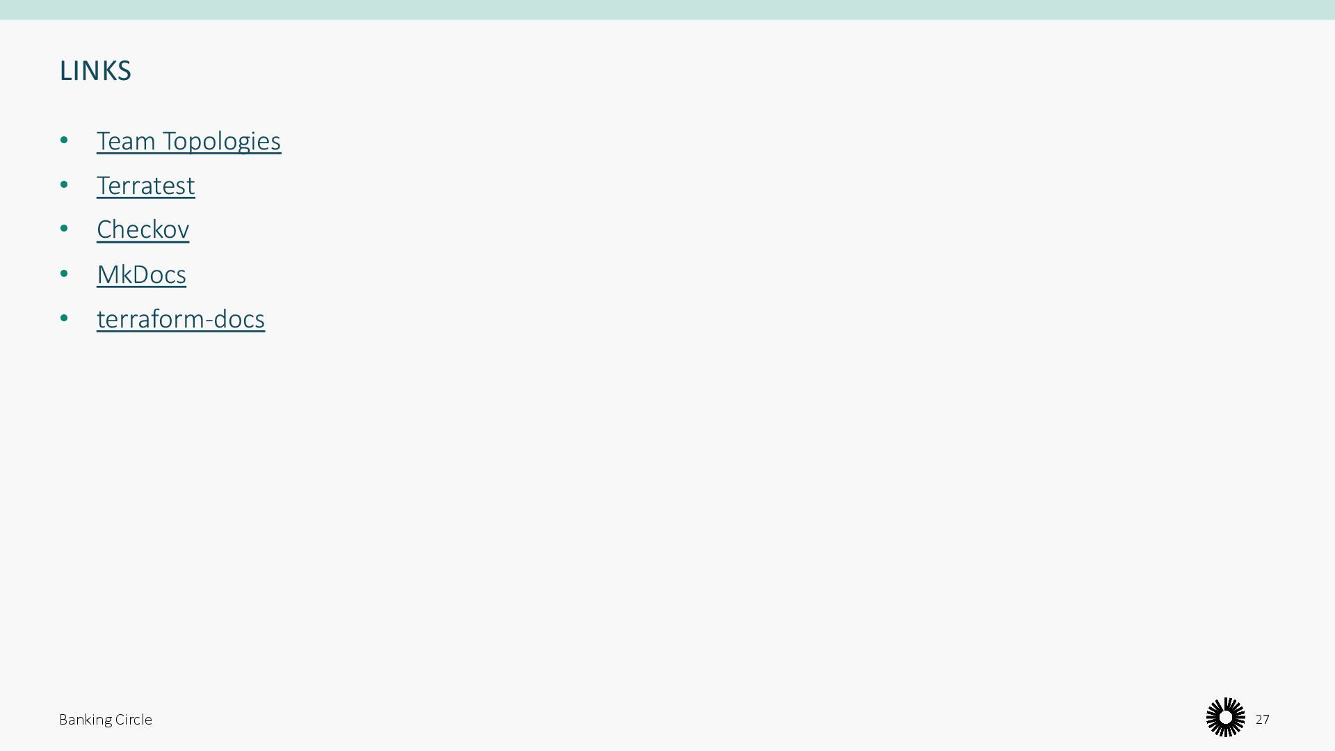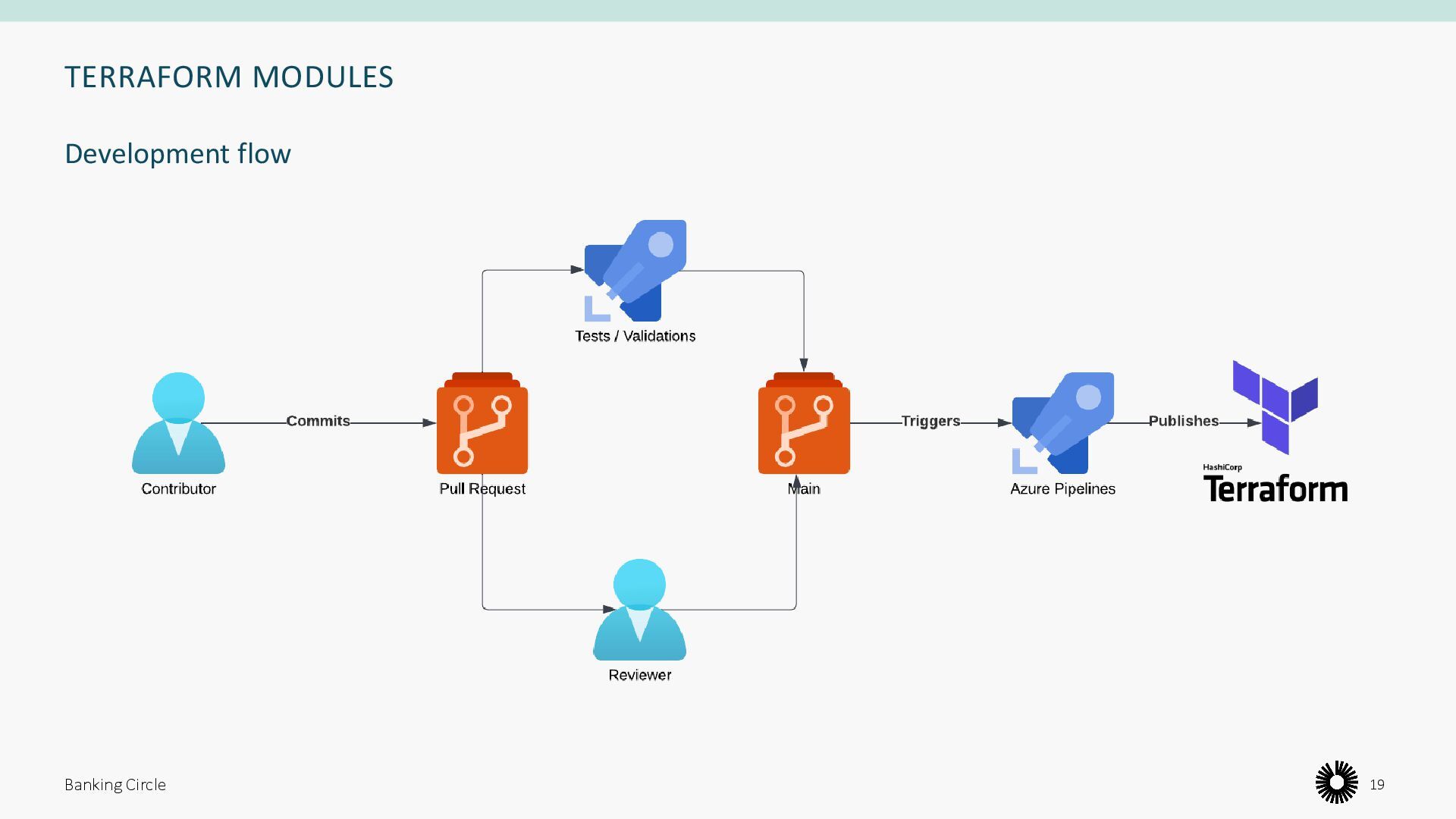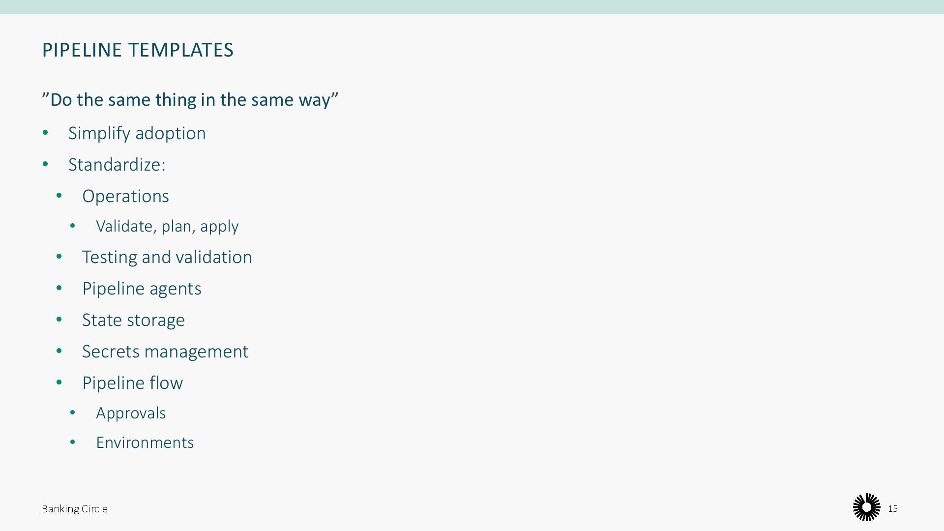Validate, plan, apply • Testing and validation • Pipeline agents • State storage • Secrets management • Pipeline flow • Approvals • Environments Banking Circle 15 ”Do the same thing in the same way”