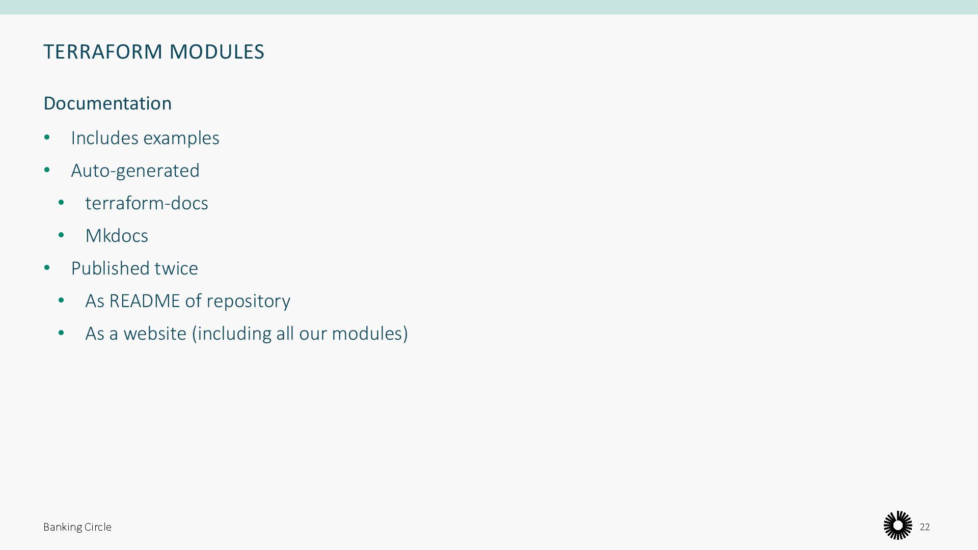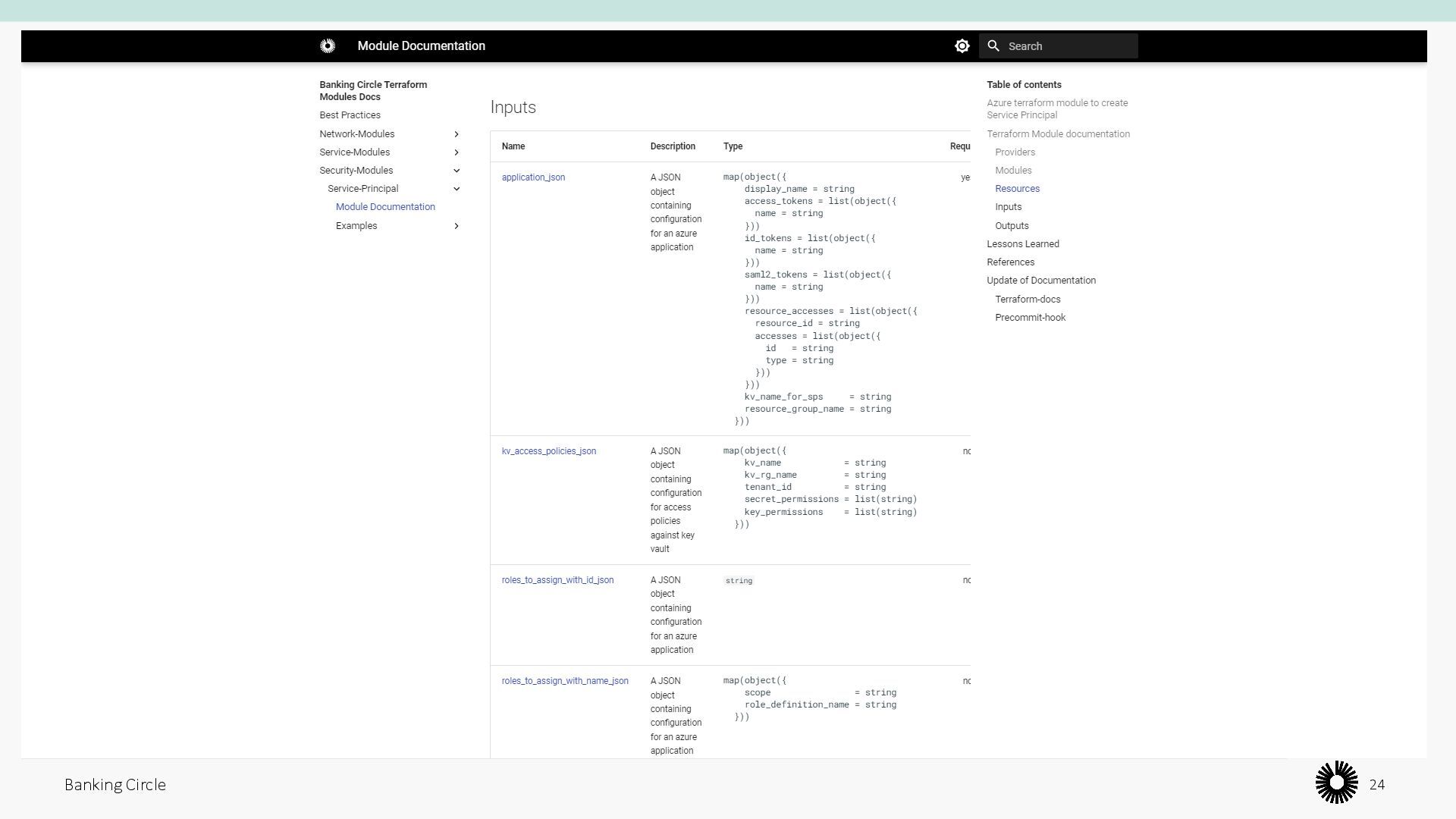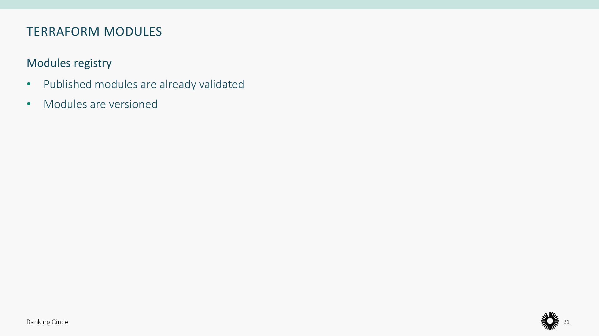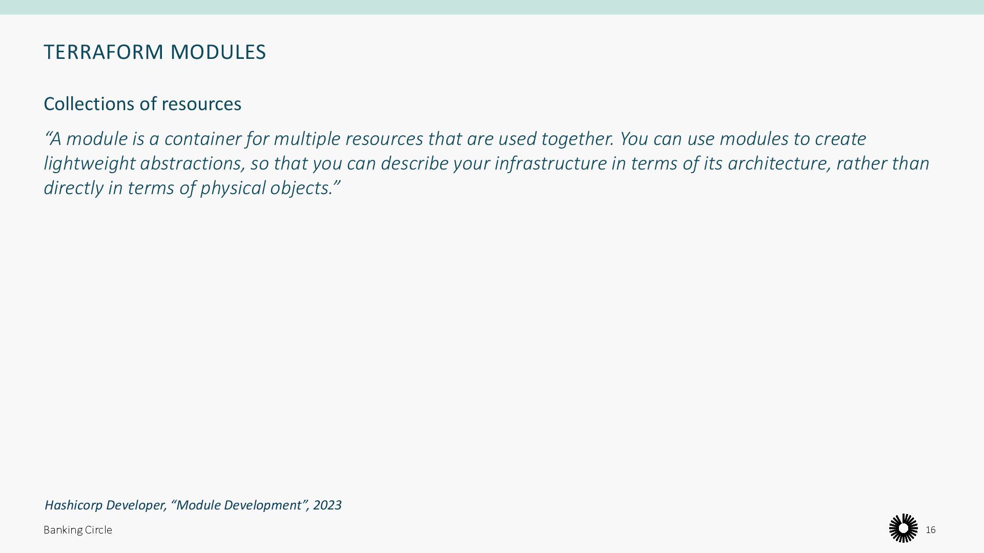 that are used together. You can use modules to create lightweight abstractions, so that you can describe your infrastructure in terms of its architecture, rather than directly in terms of physical objects.” Banking Circle 16 Collections of resources Hashicorp Developer, “Module Development”, 2023