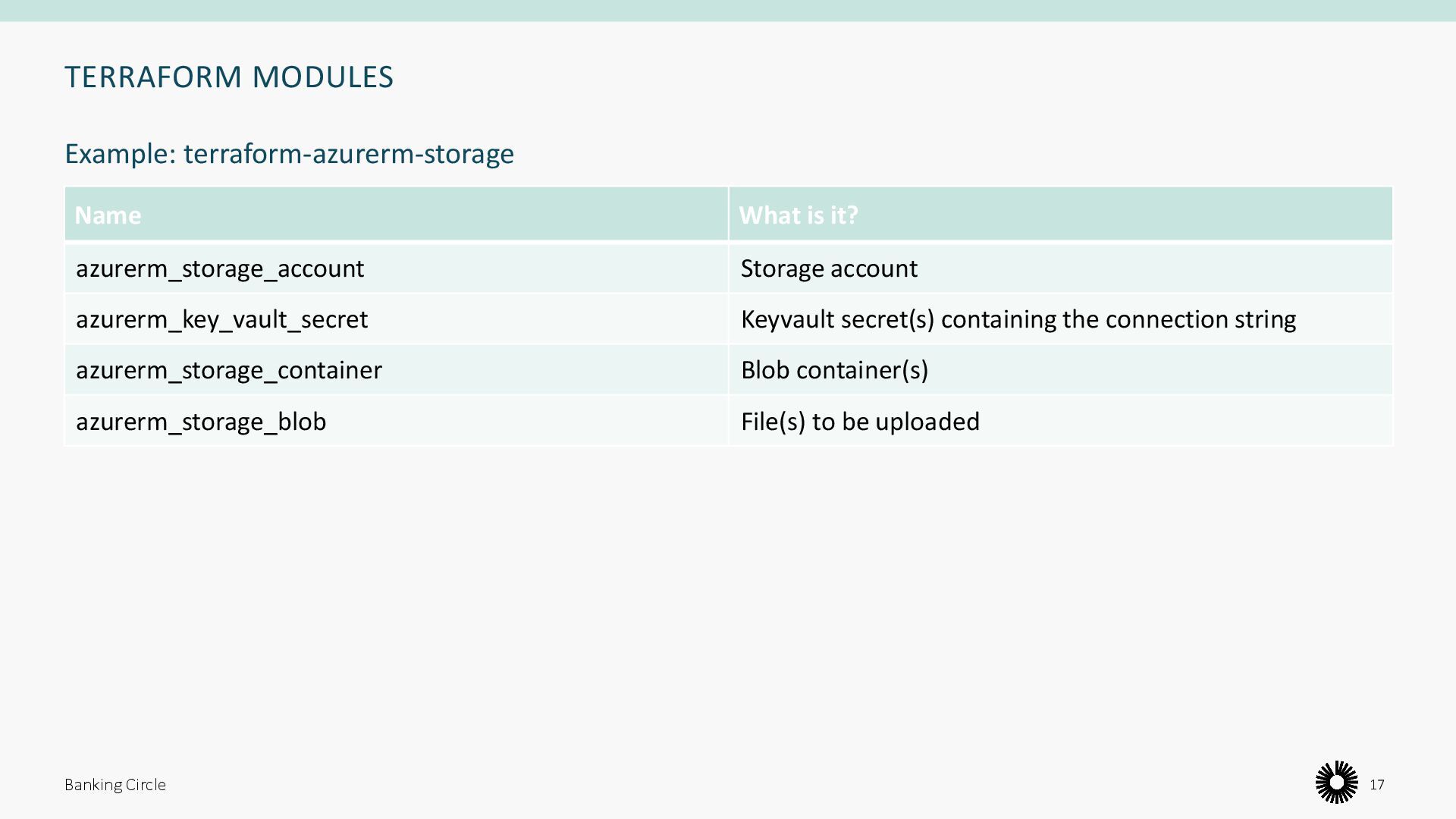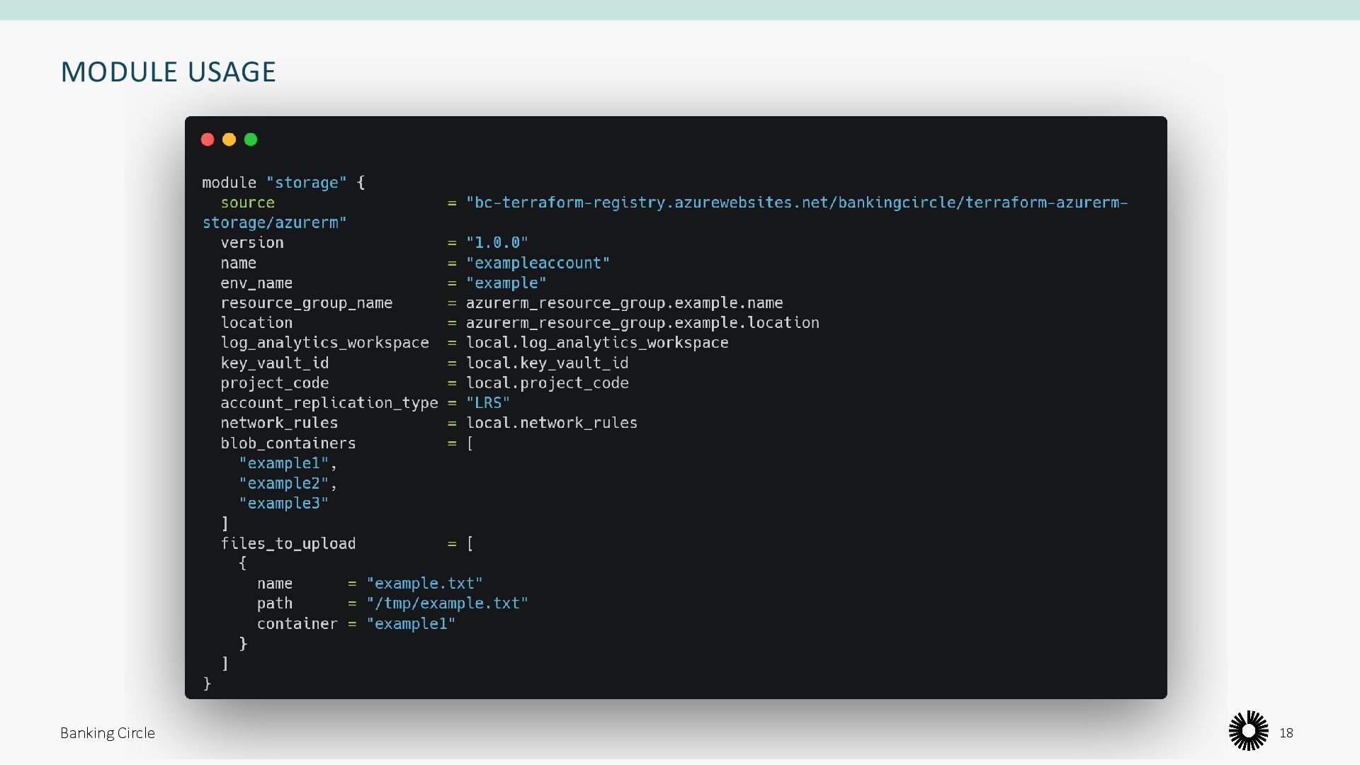 Keyvault secret(s) containing the connection string azurerm_storage_container Blob container(s) azurerm_storage_blob File(s) to be uploaded Banking Circle 17 Example: terraform-azurerm-storage