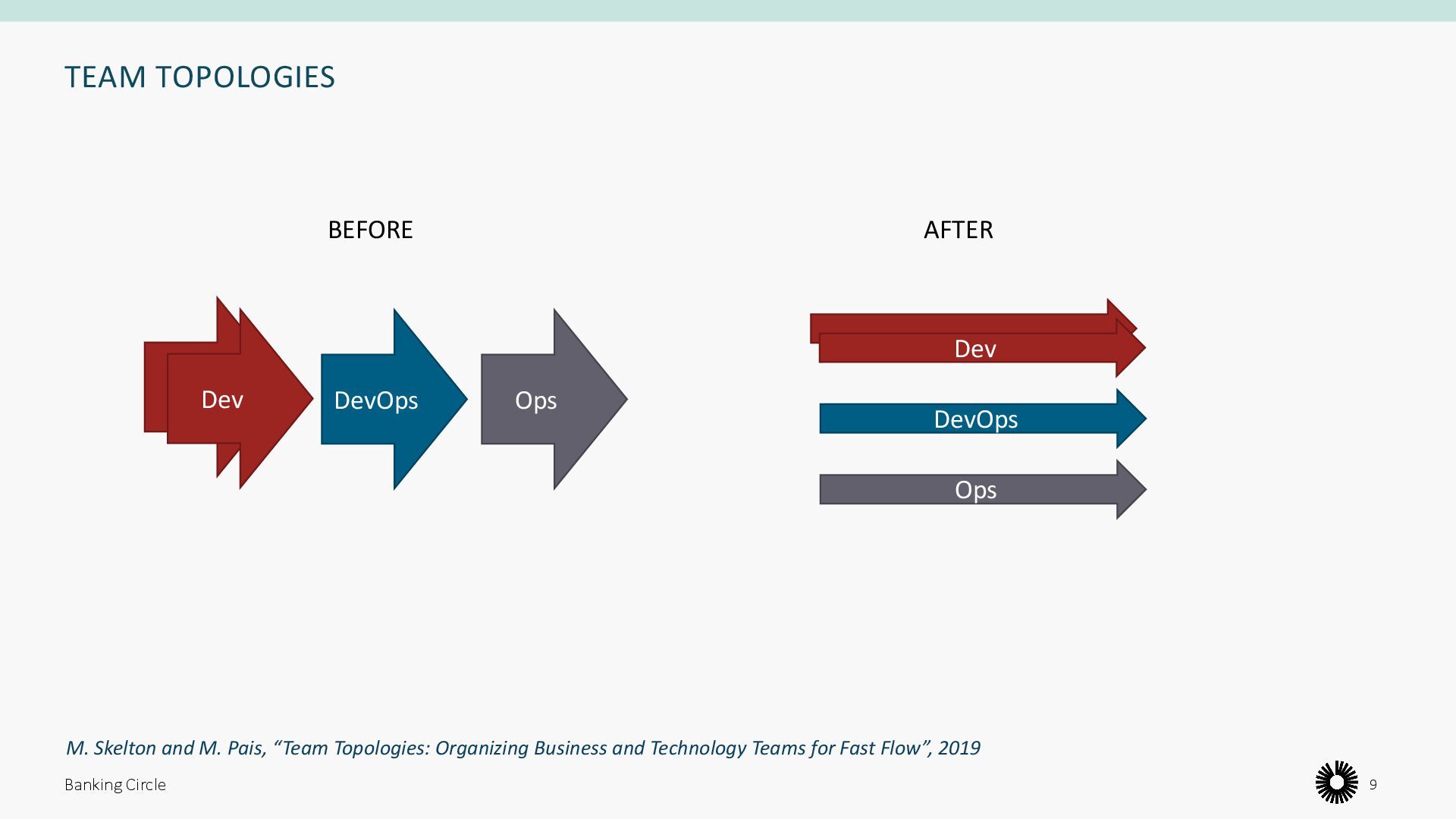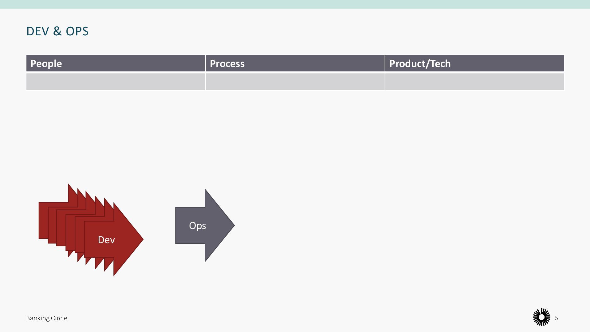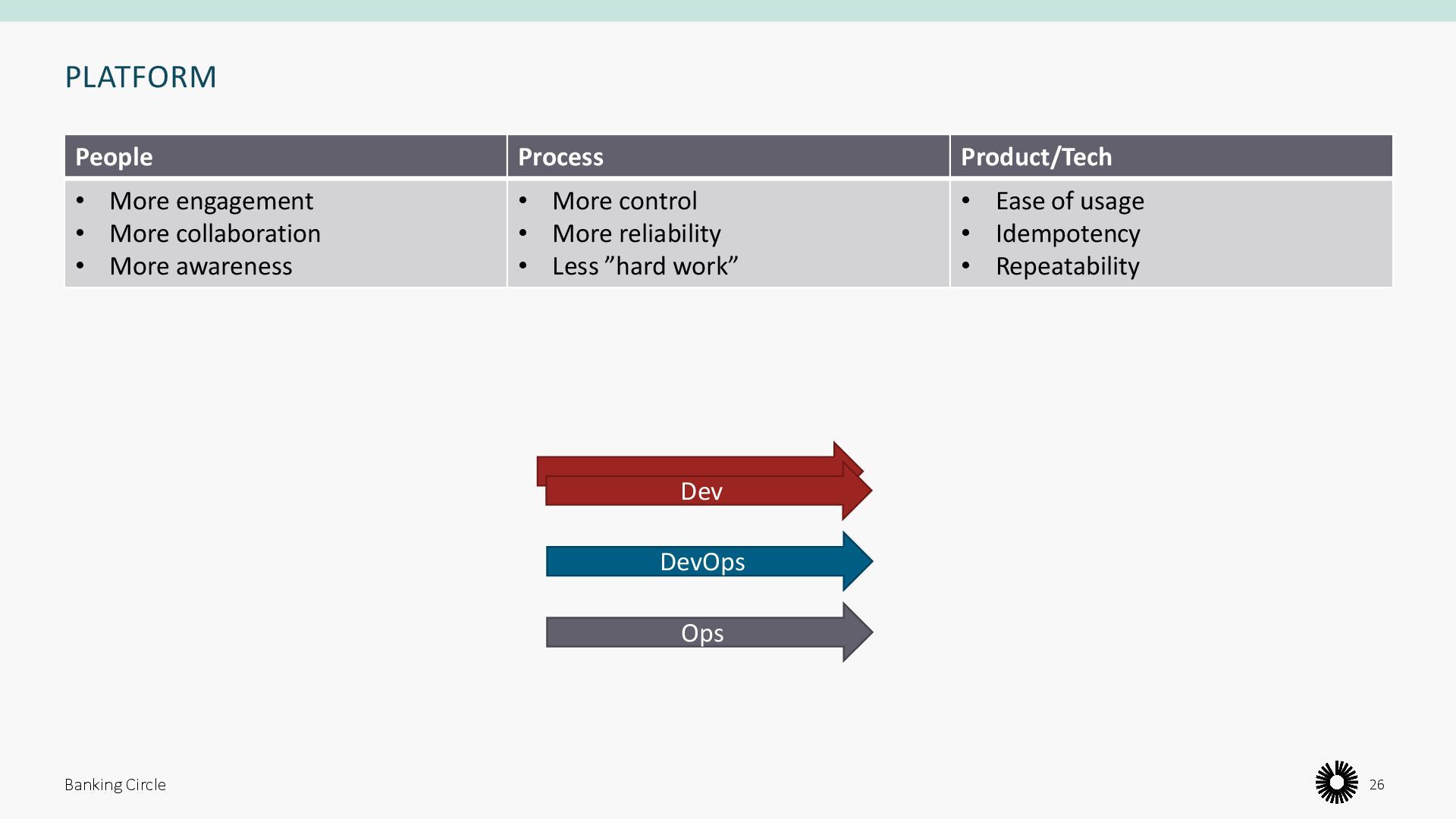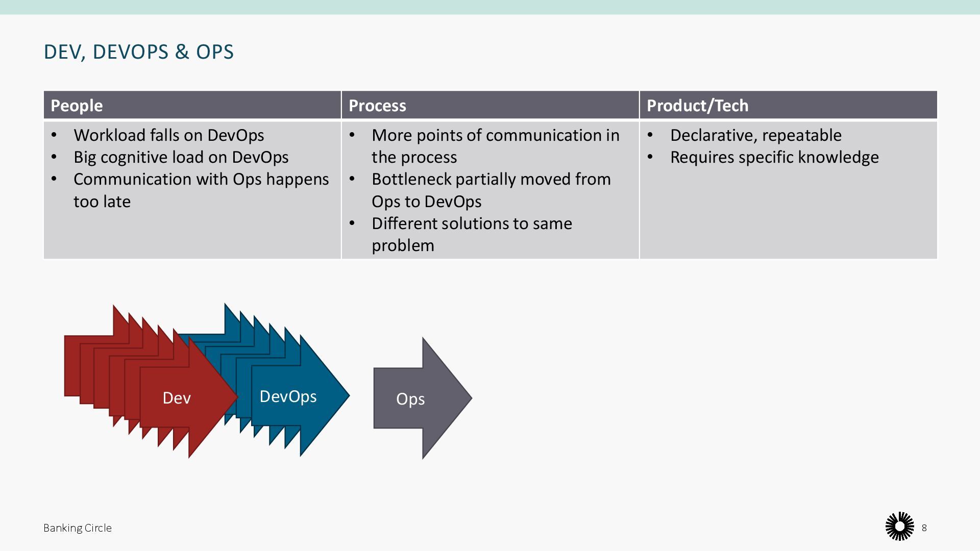 People Process Product/Tech • Workload falls on DevOps • Big cognitive load on DevOps • Communication with Ops happens too late • More points of communication in the process • Bottleneck partially moved from Ops to DevOps • Different solutions to same problem • Declarative, repeatable • Requires specific knowledge Banking Circle 8 Dev Ops Dev Dev Dev Dev Dev