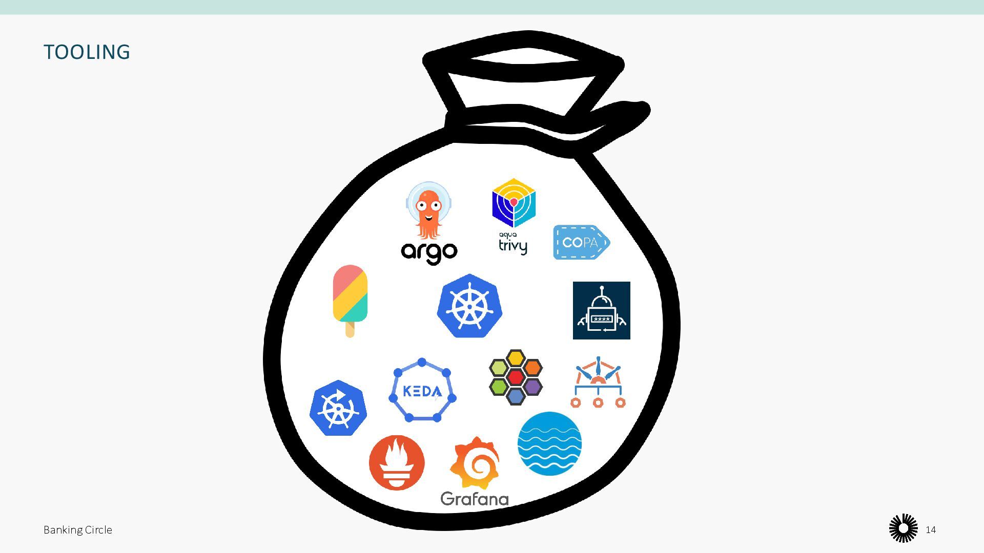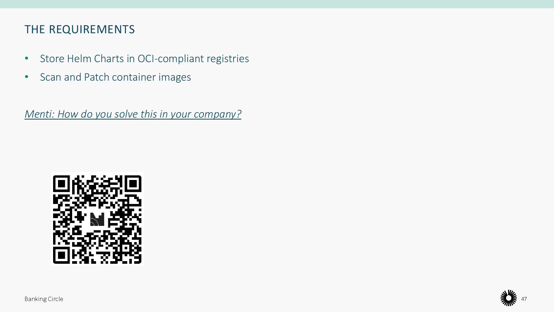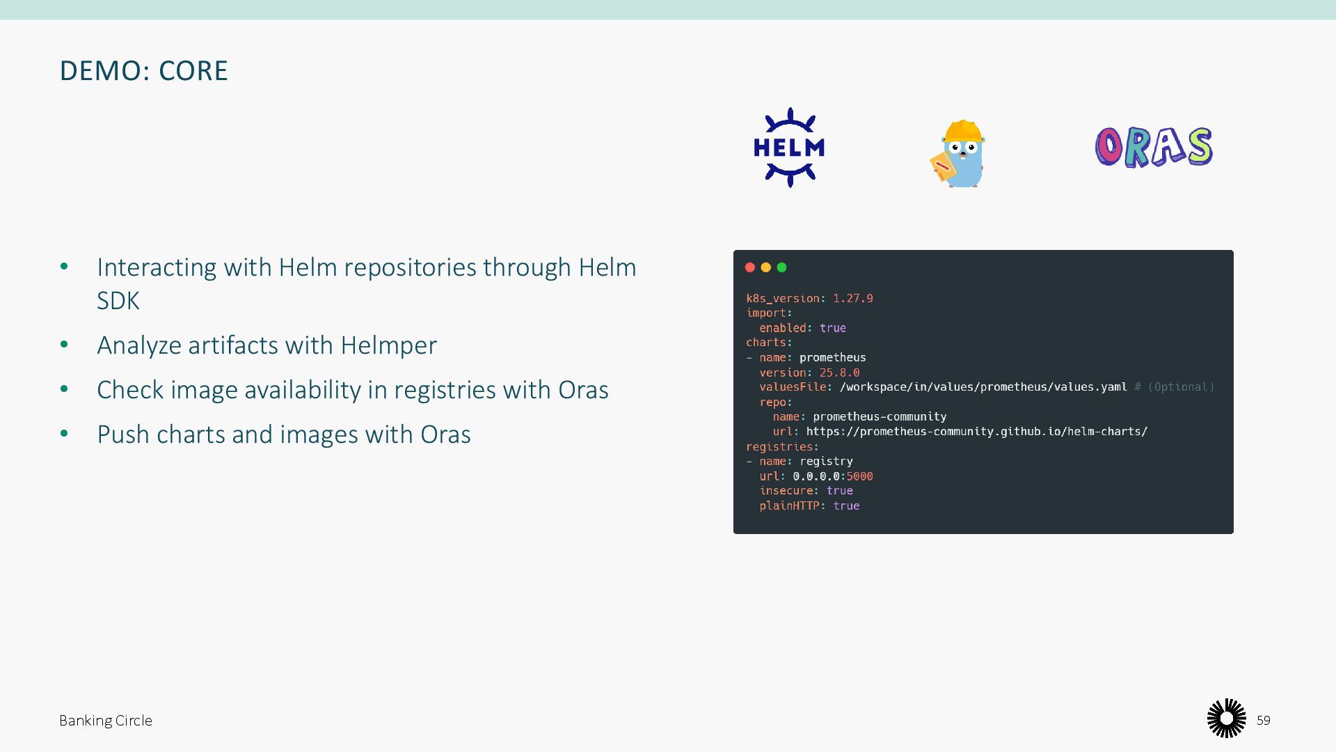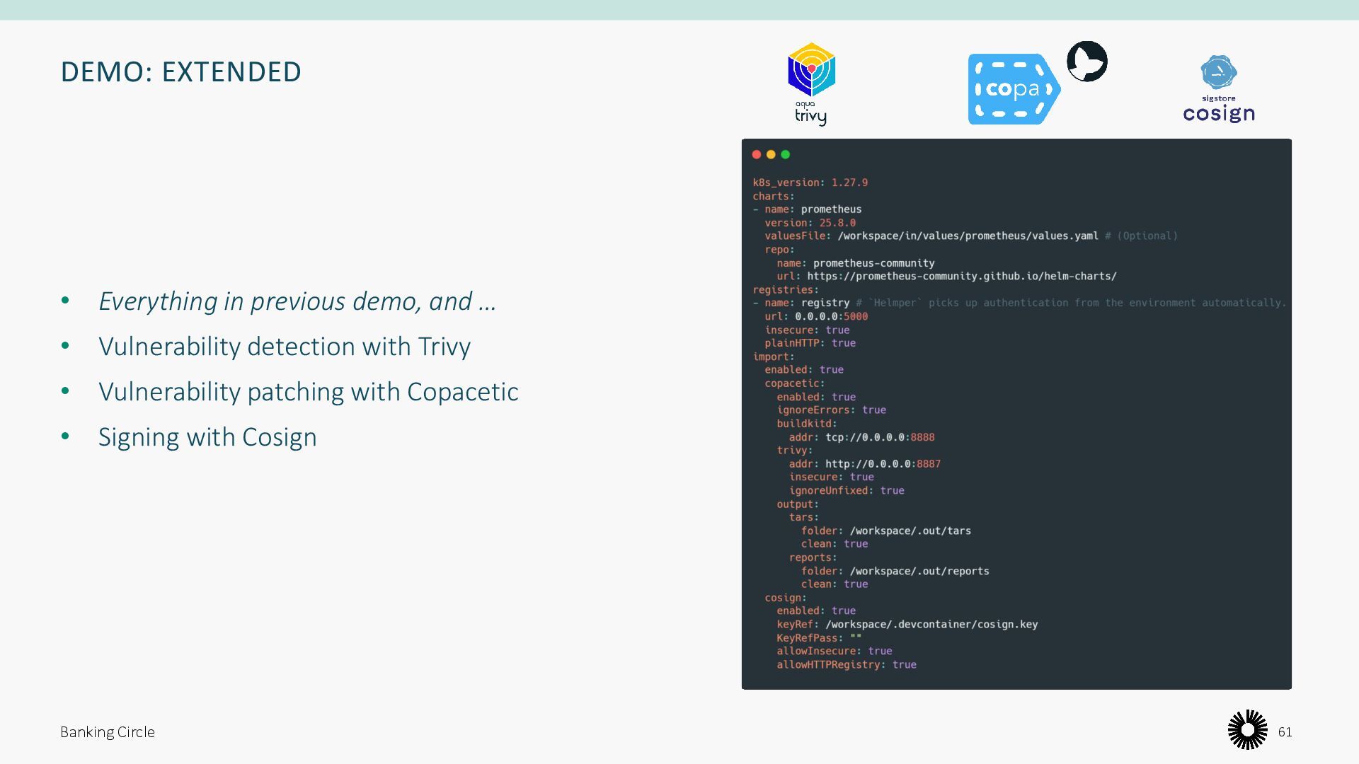 Ensure good practice around storing dependencies for charts used in production • Easy and repeatable import of Container Images in Helm Charts • See an example of how to build Golang projects leveraging popular tools • Learn about recent CNCF projects in the domain of vulnerability detection and patching Banking Circle 41