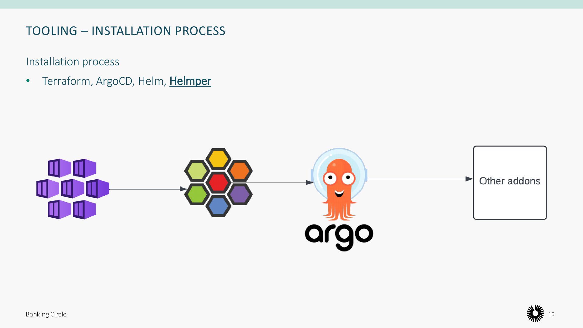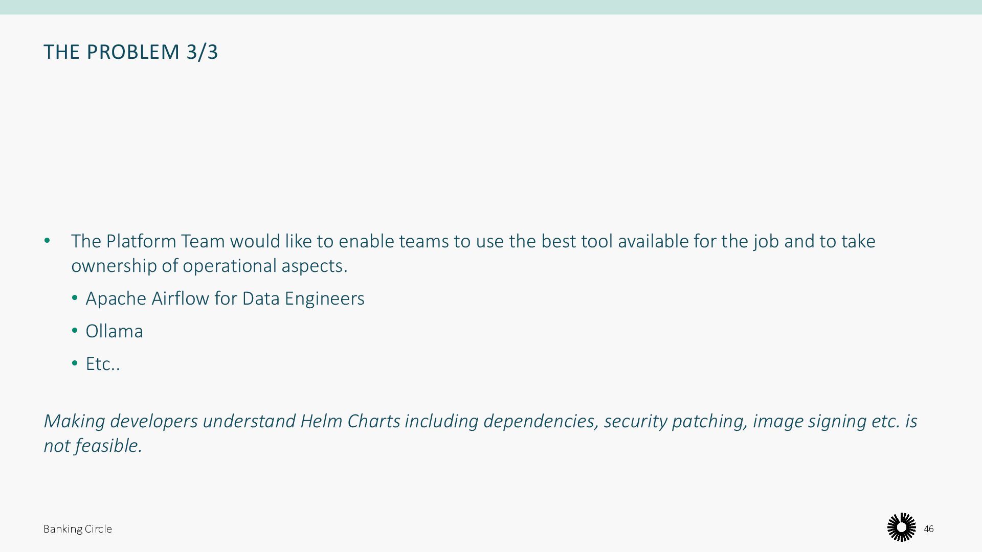 enable teams to use the best tool available for the job and to take ownership of operational aspects. • Apache Airflow for Data Engineers • Ollama • Etc.. Making developers understand Helm Charts including dependencies, security patching, image signing etc. is not feasible. Banking Circle 46