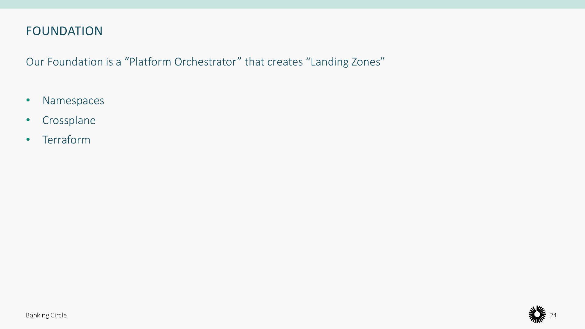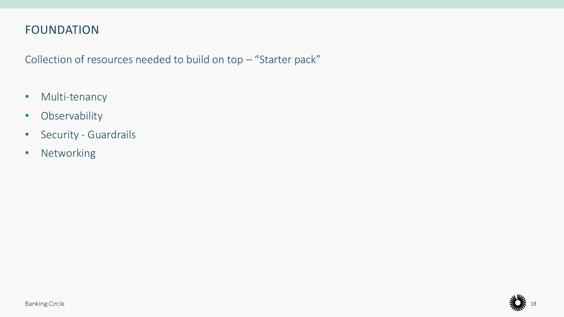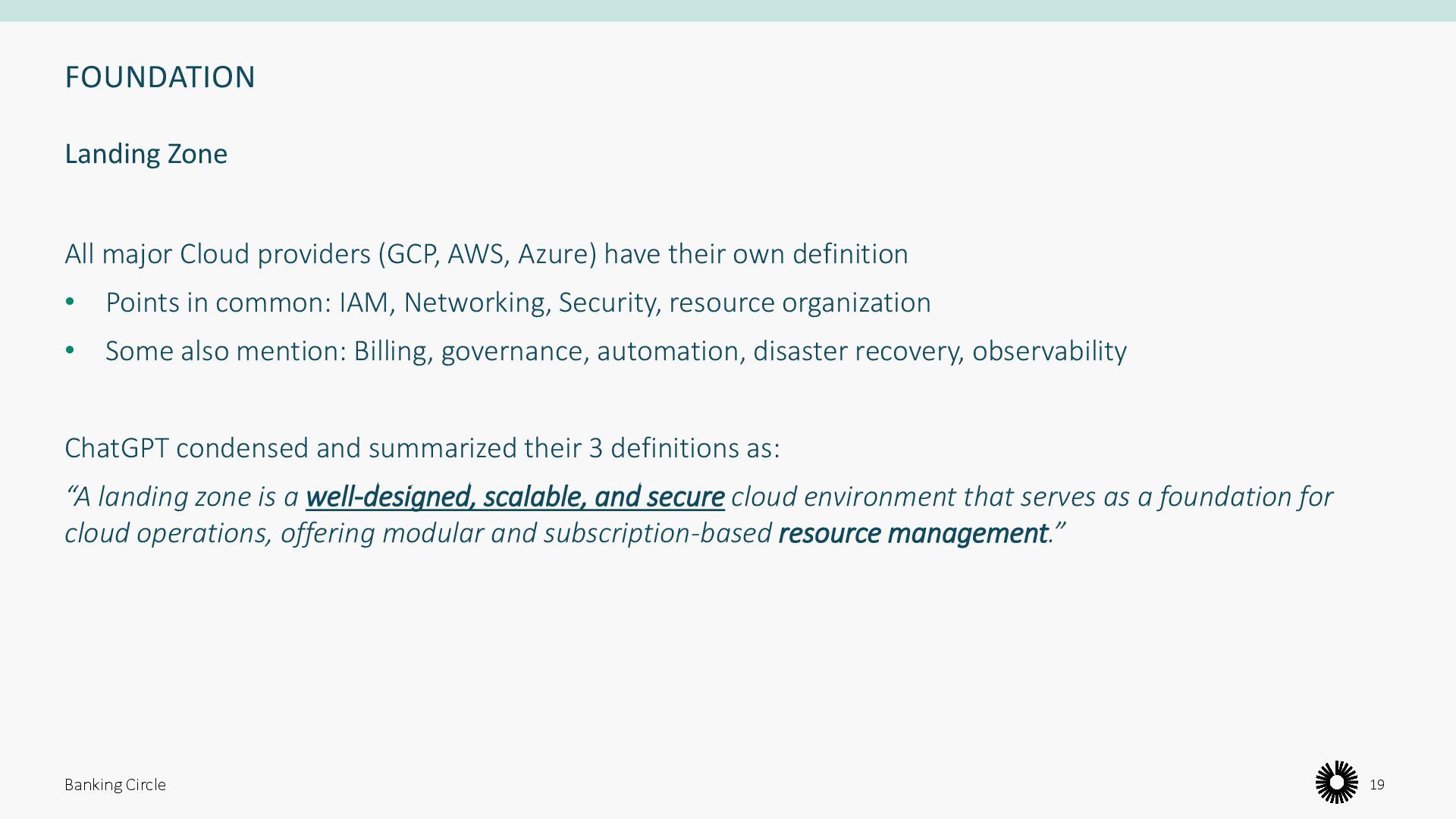 own definition • Points in common: IAM, Networking, Security, resource organization • Some also mention: Billing, governance, automation, disaster recovery, observability ChatGPT condensed and summarized their 3 definitions as: “A landing zone is a well-designed, scalable, and secure cloud environment that serves as a foundation for cloud operations, offering modular and subscription-based resource management.” Banking Circle 19 Landing Zone