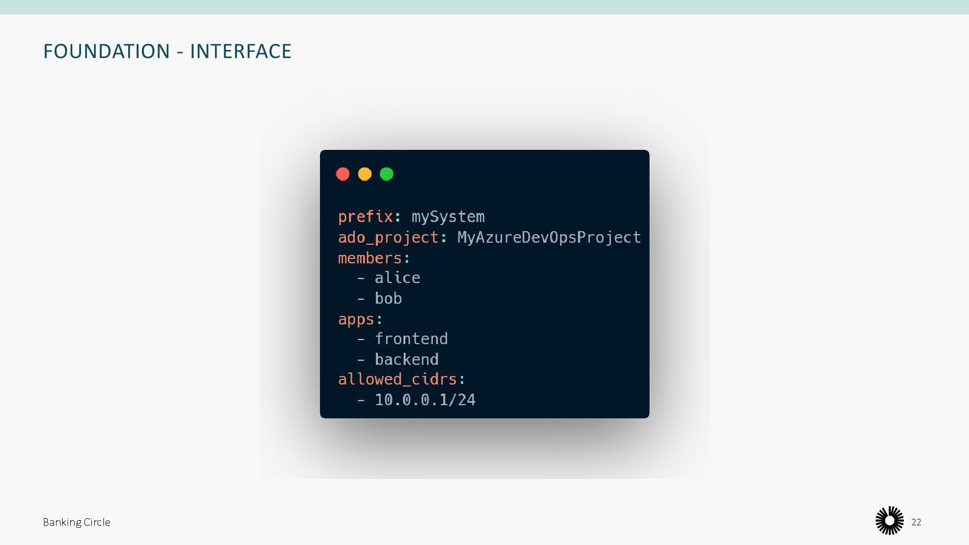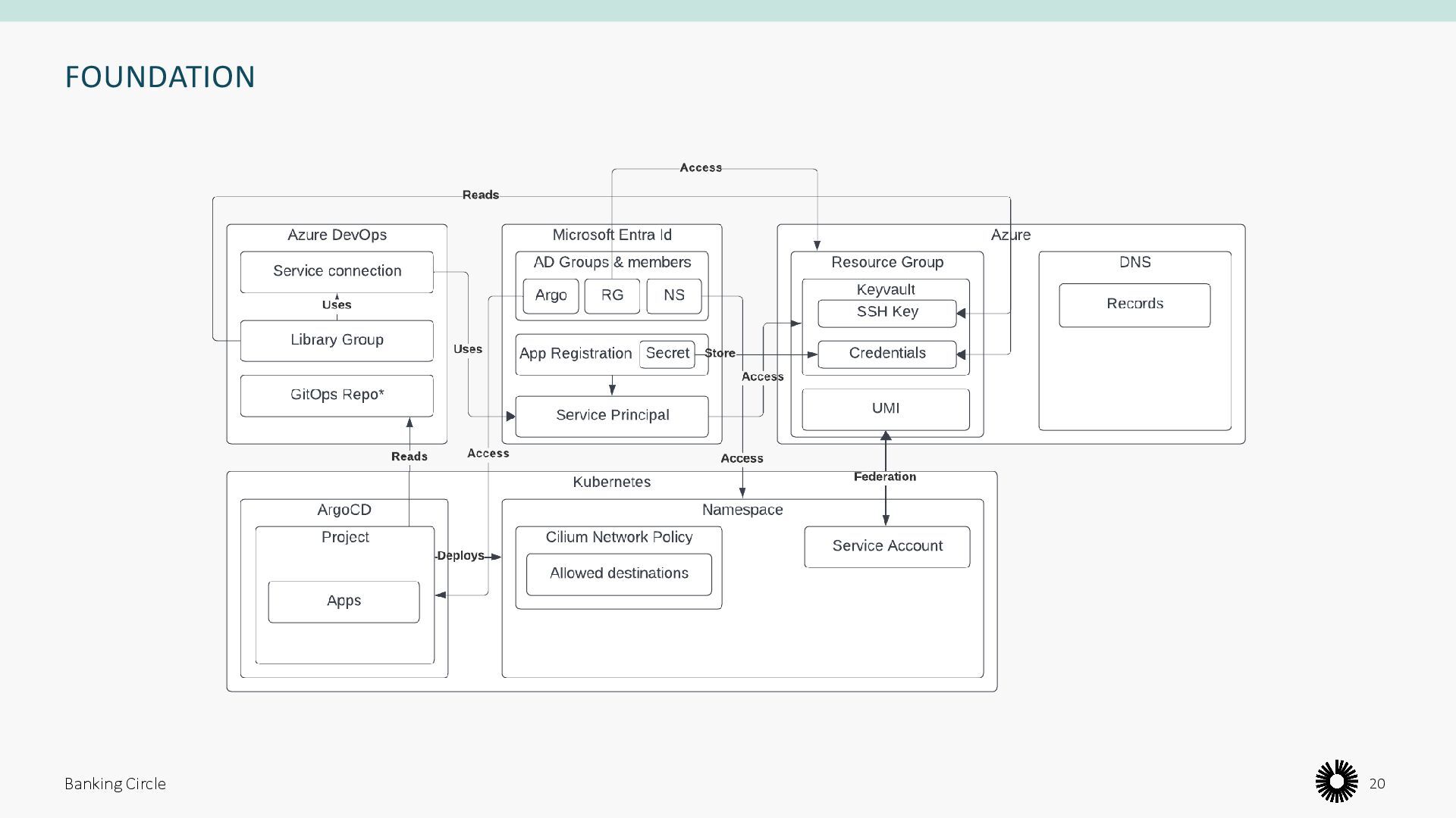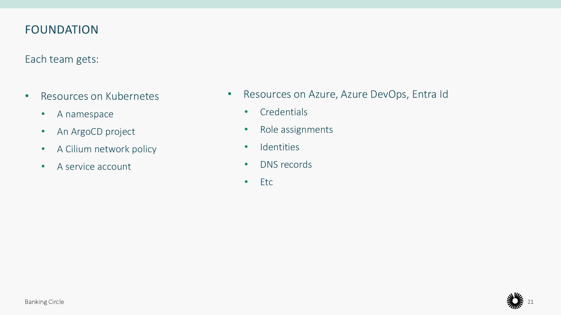 namespace • An ArgoCD project • A Cilium network policy • A service account Banking Circle 21 • Resources on Azure, Azure DevOps, Entra Id • Credentials • Role assignments • Identities • DNS records • Etc