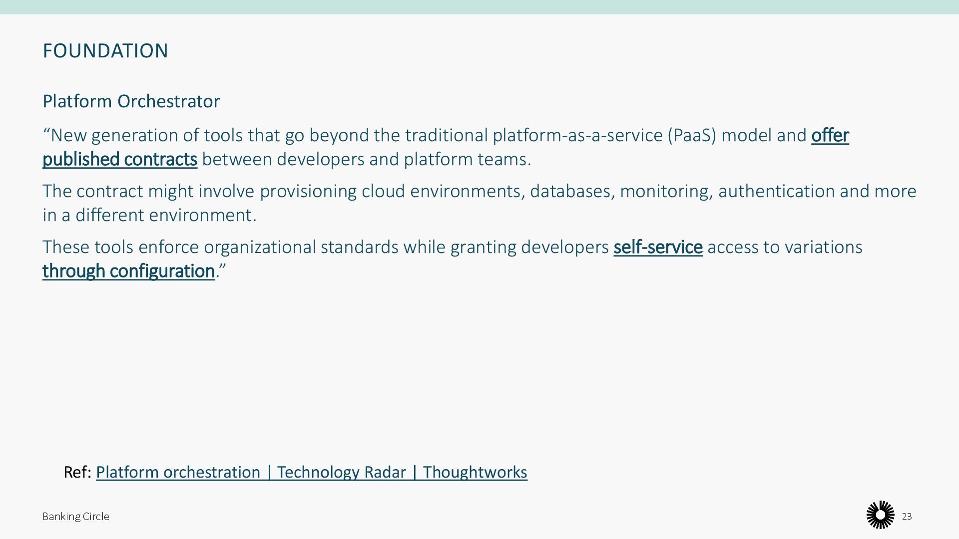 platform-as-a-service (PaaS) model and offer published contracts between developers and platform teams. The contract might involve provisioning cloud environments, databases, monitoring, authentication and more in a different environment. These tools enforce organizational standards while granting developers self-service access to variations through configuration.” Banking Circle 23 Platform Orchestrator Ref: Platform orchestration | Technology Radar | Thoughtworks