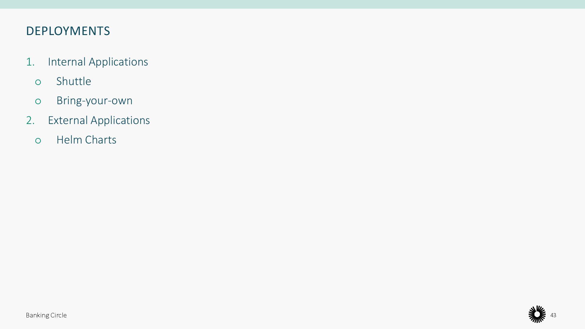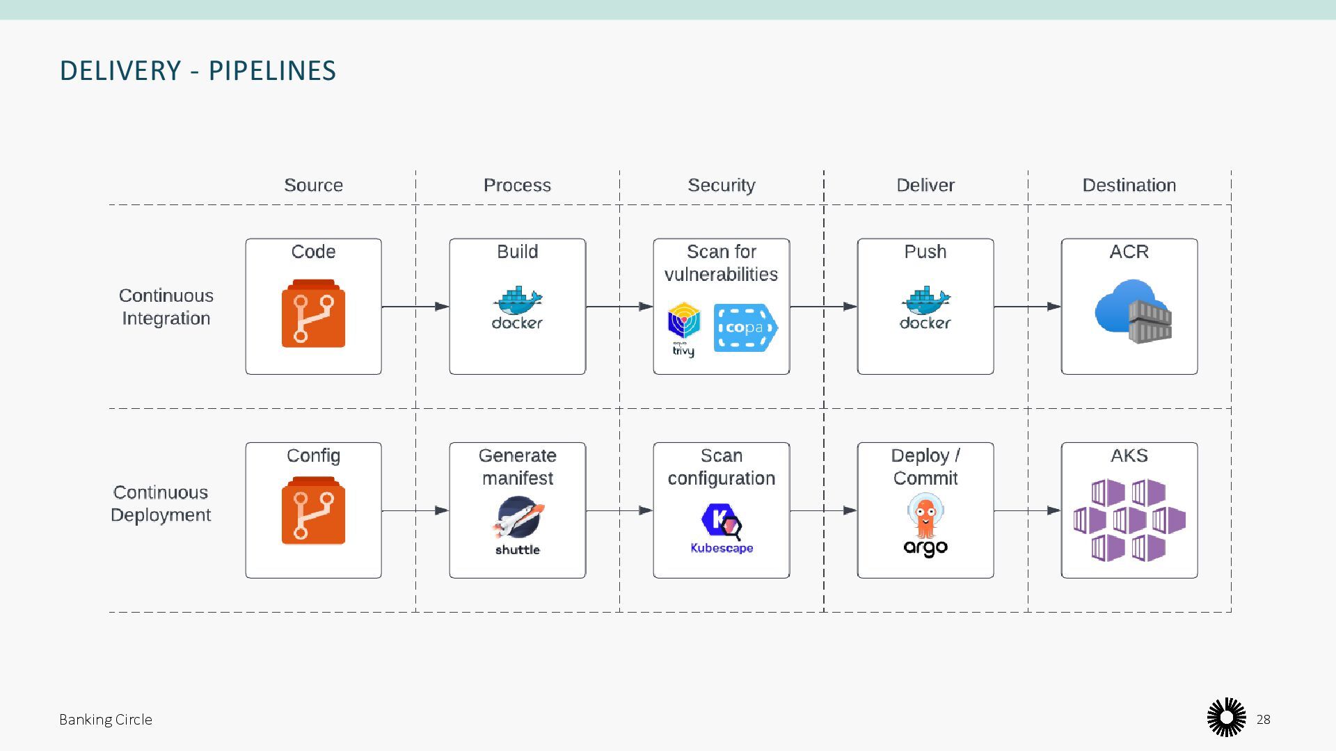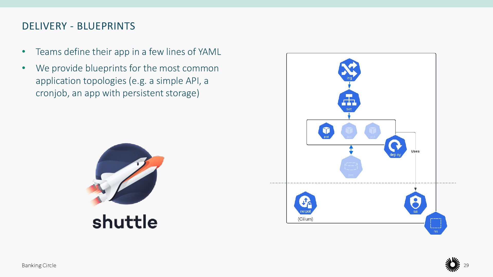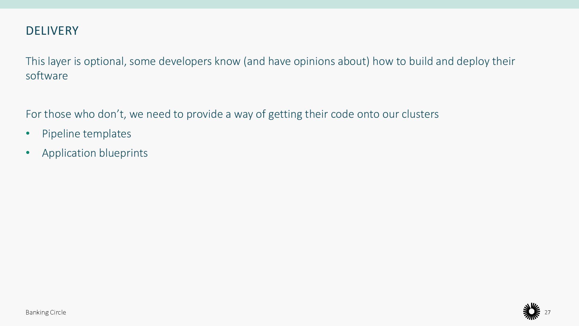 opinions about) how to build and deploy their software For those who don’t, we need to provide a way of getting their code onto our clusters • Pipeline templates • Application blueprints Banking Circle 27