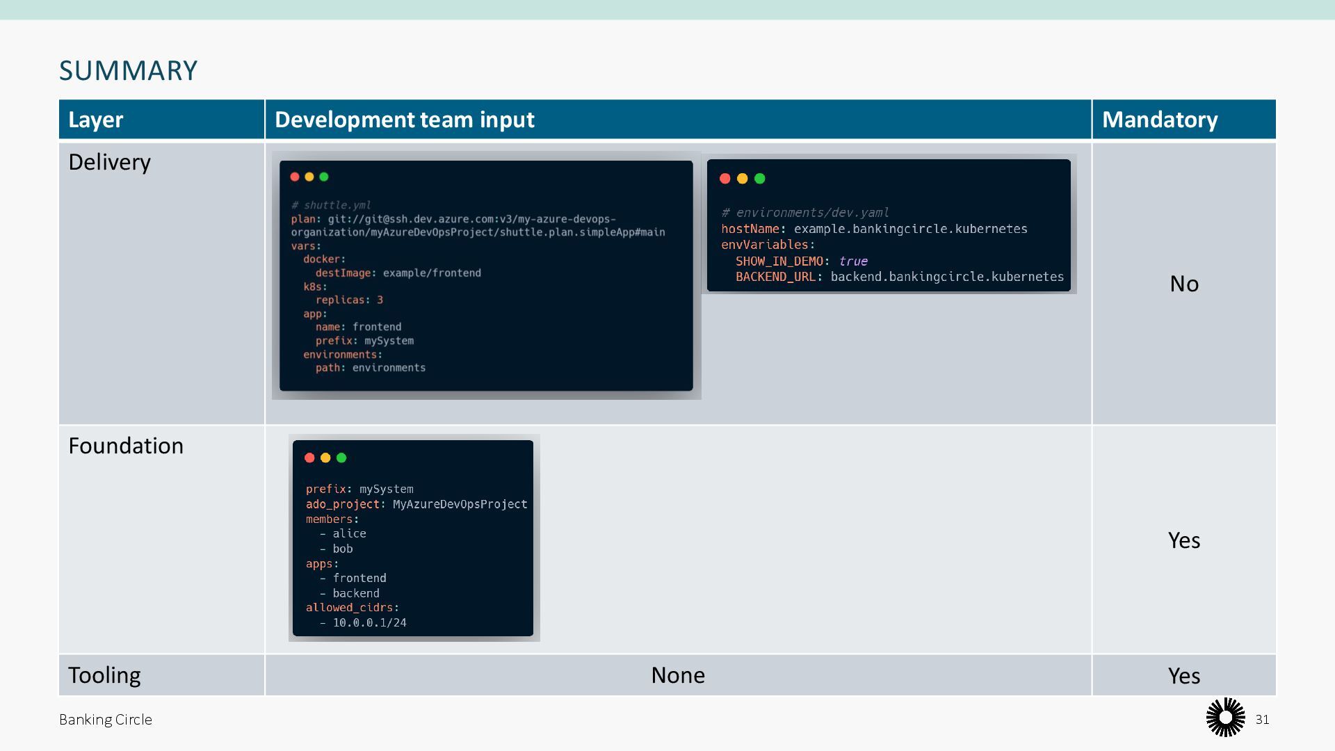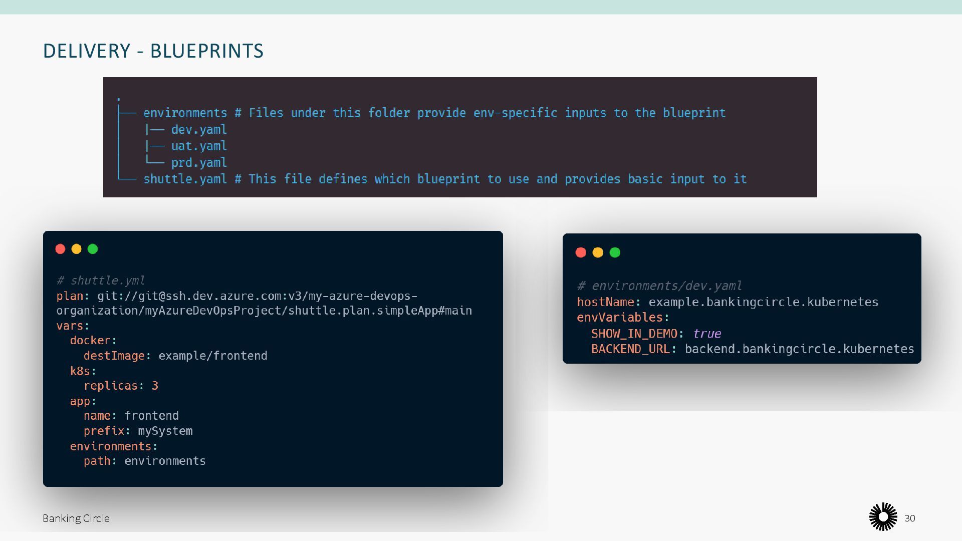 few lines of YAML • We provide blueprints for the most common application topologies (e.g. a simple API, a cronjob, an app with persistent storage) Banking Circle 29