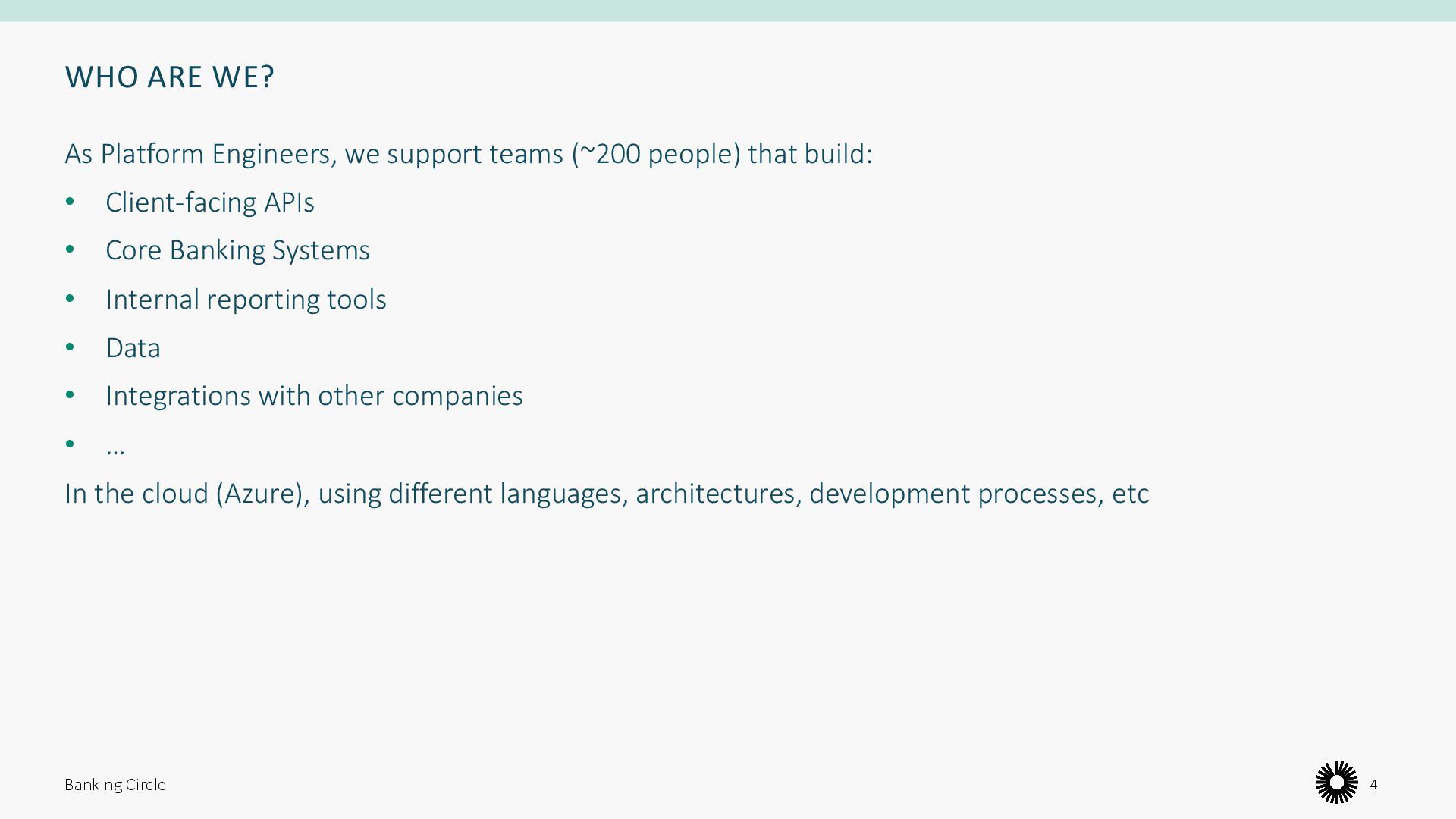 people) that build: • Client-facing APIs • Core Banking Systems • Internal reporting tools • Data • Integrations with other companies • … In the cloud (Azure), using different languages, architectures, development processes, etc Banking Circle 4