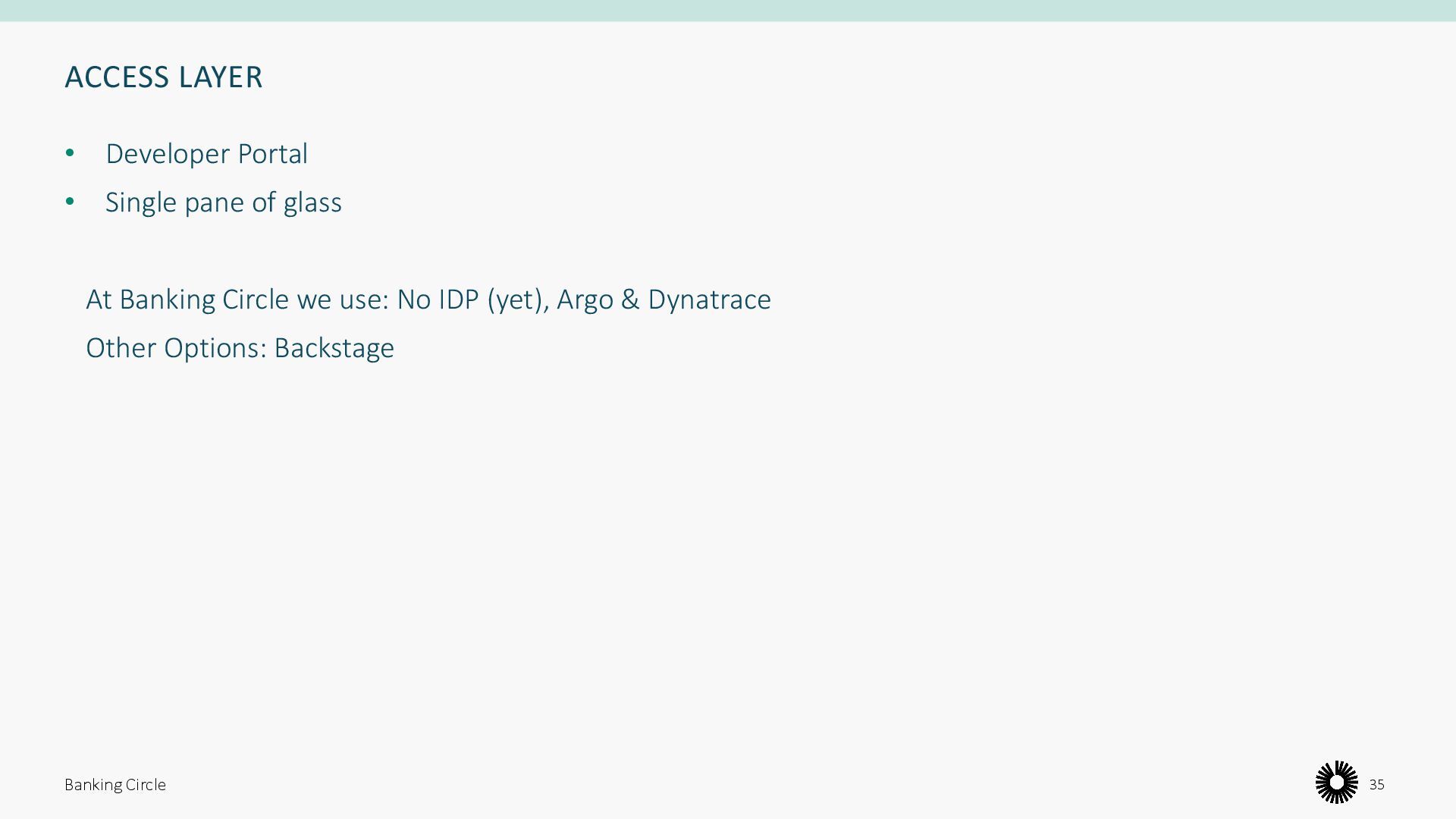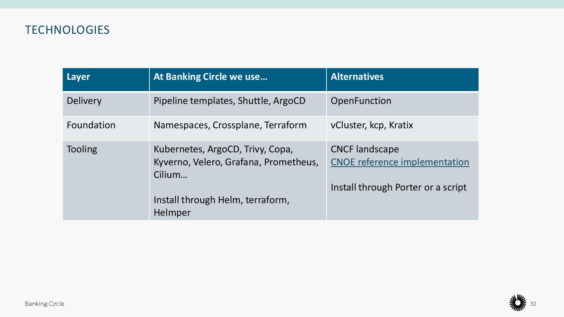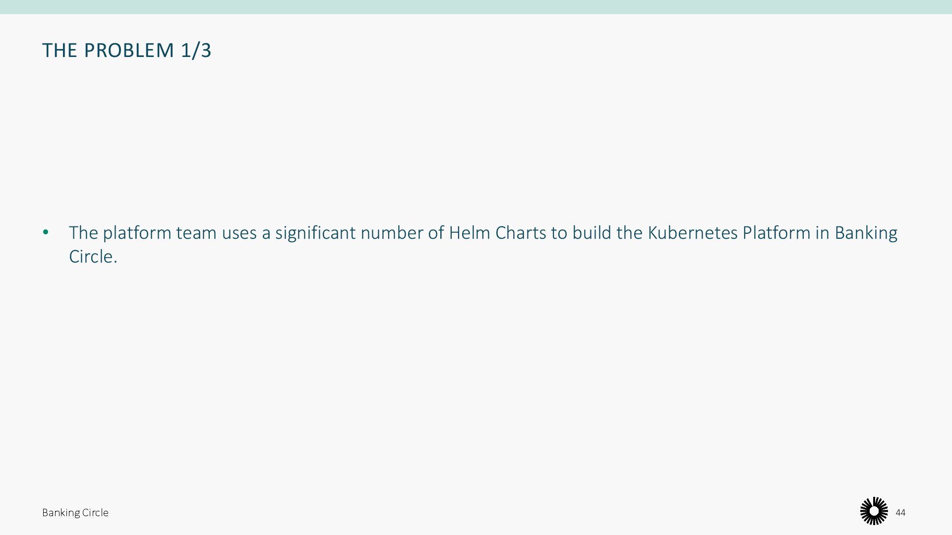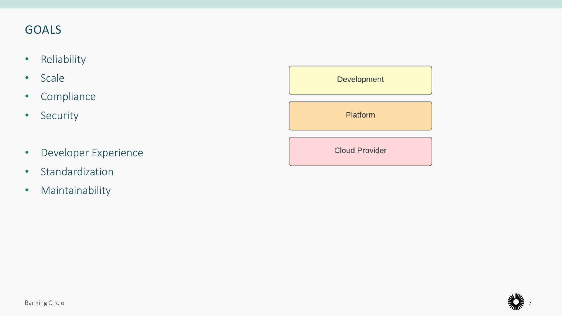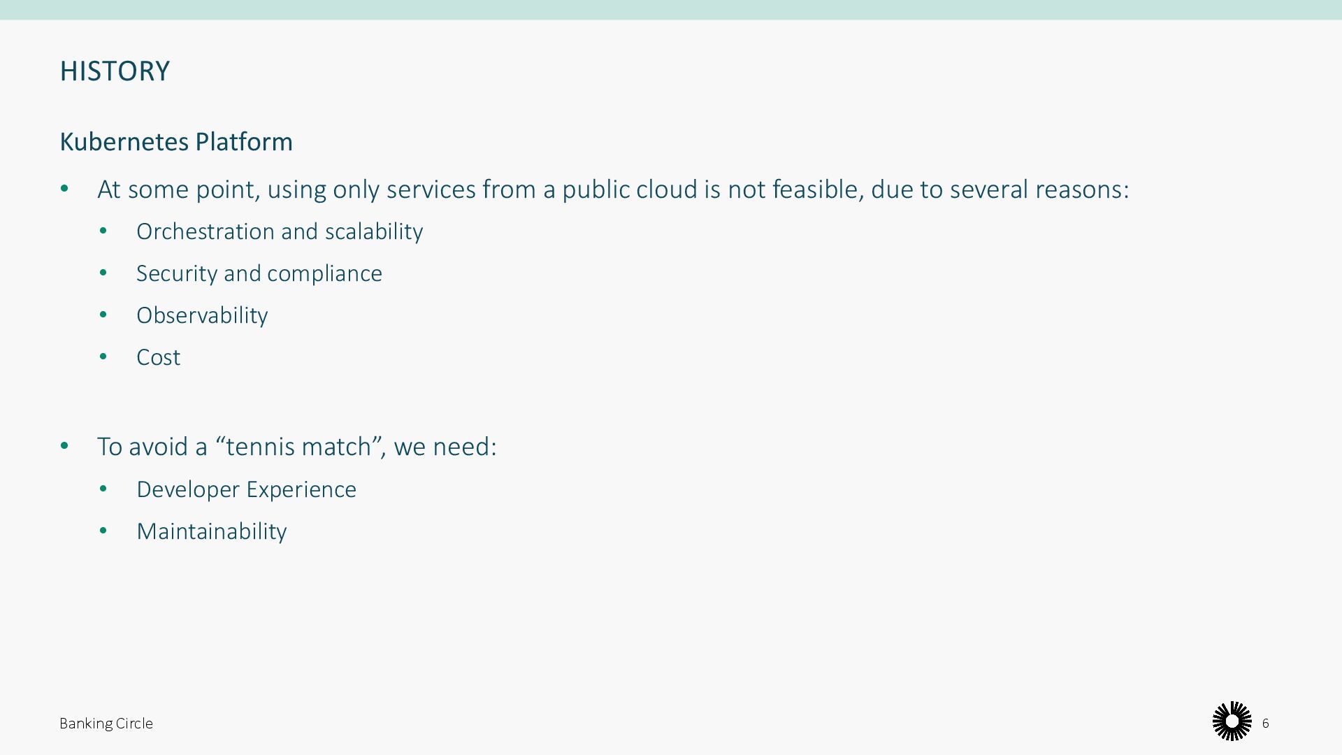 public cloud is not feasible, due to several reasons: • Orchestration and scalability • Security and compliance • Observability • Cost • To avoid a “tennis match”, we need: • Developer Experience • Maintainability Banking Circle 6 Kubernetes Platform
