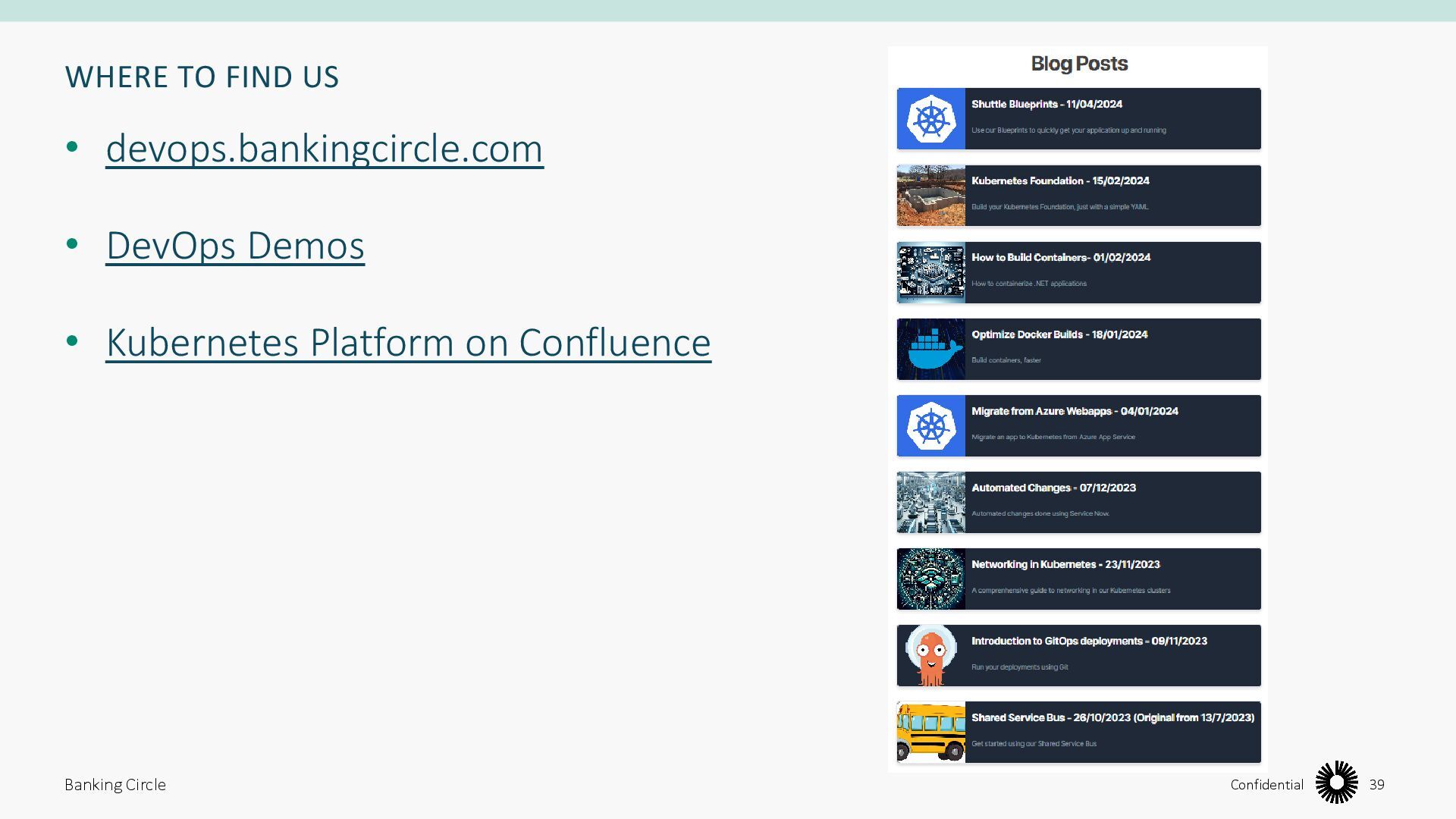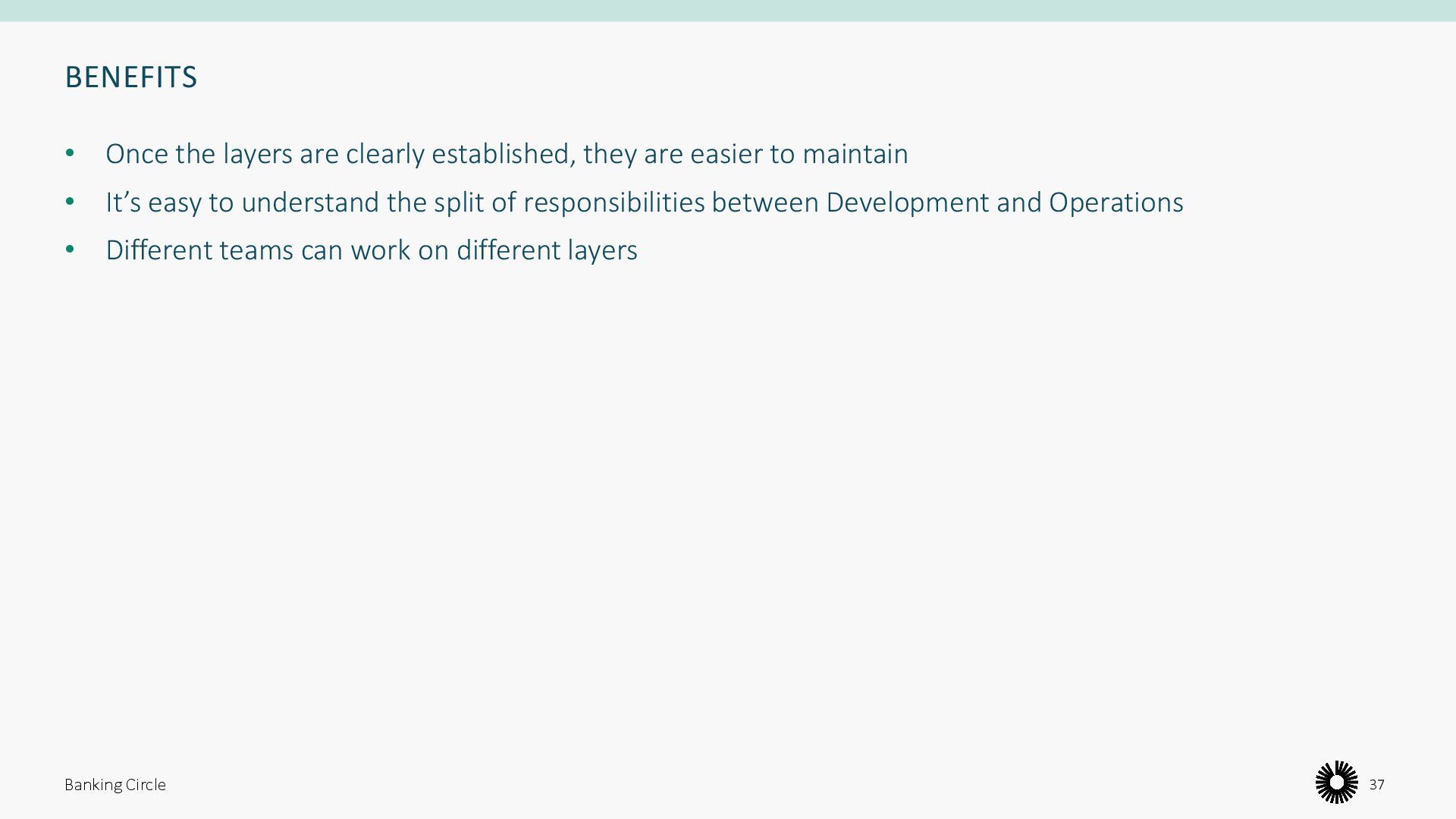easier to maintain • It’s easy to understand the split of responsibilities between Development and Operations • Different teams can work on different layers Banking Circle 37