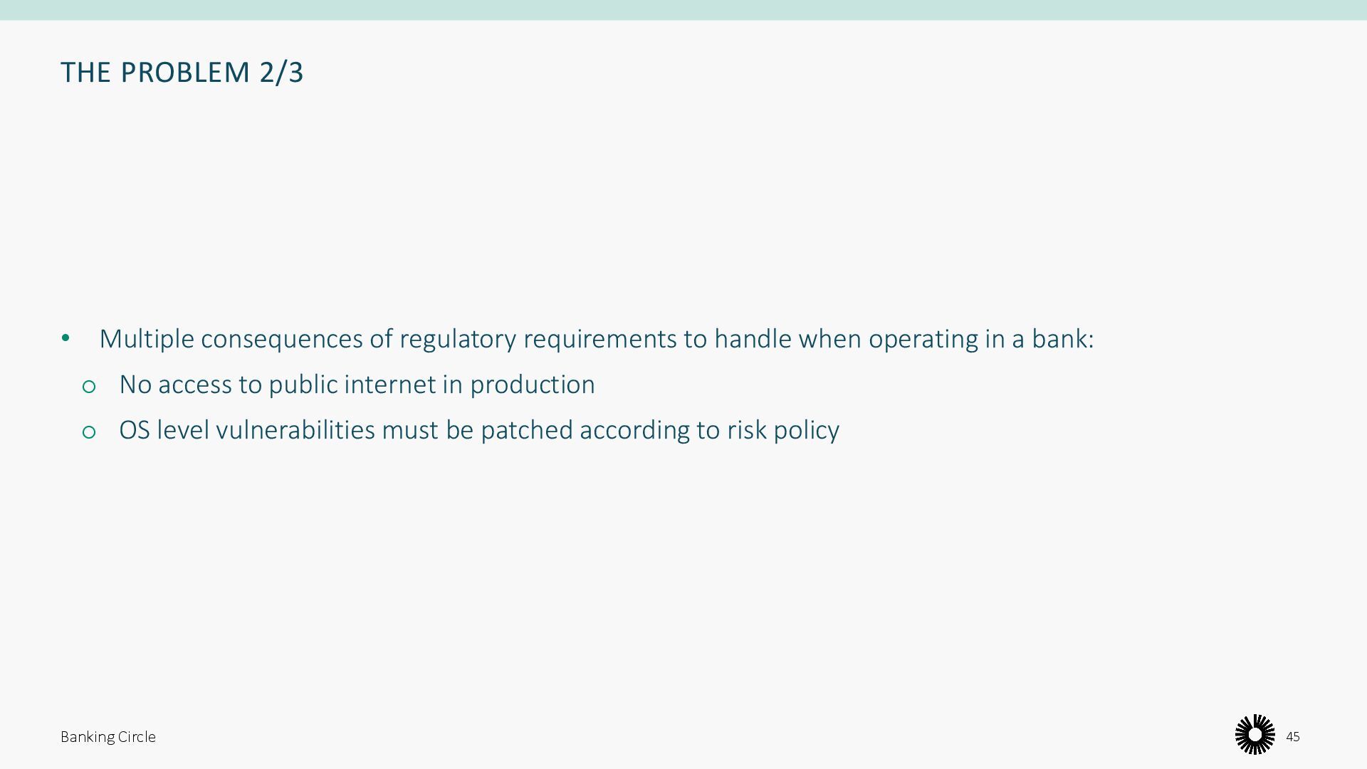 handle when operating in a bank: o No access to public internet in production o OS level vulnerabilities must be patched according to risk policy Banking Circle 45