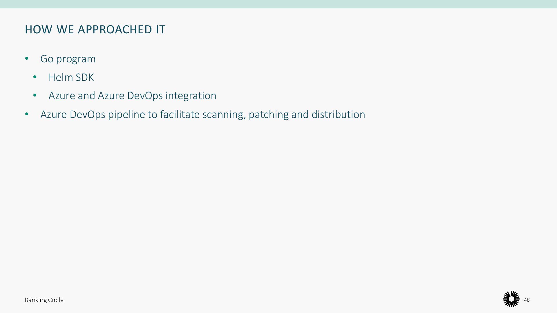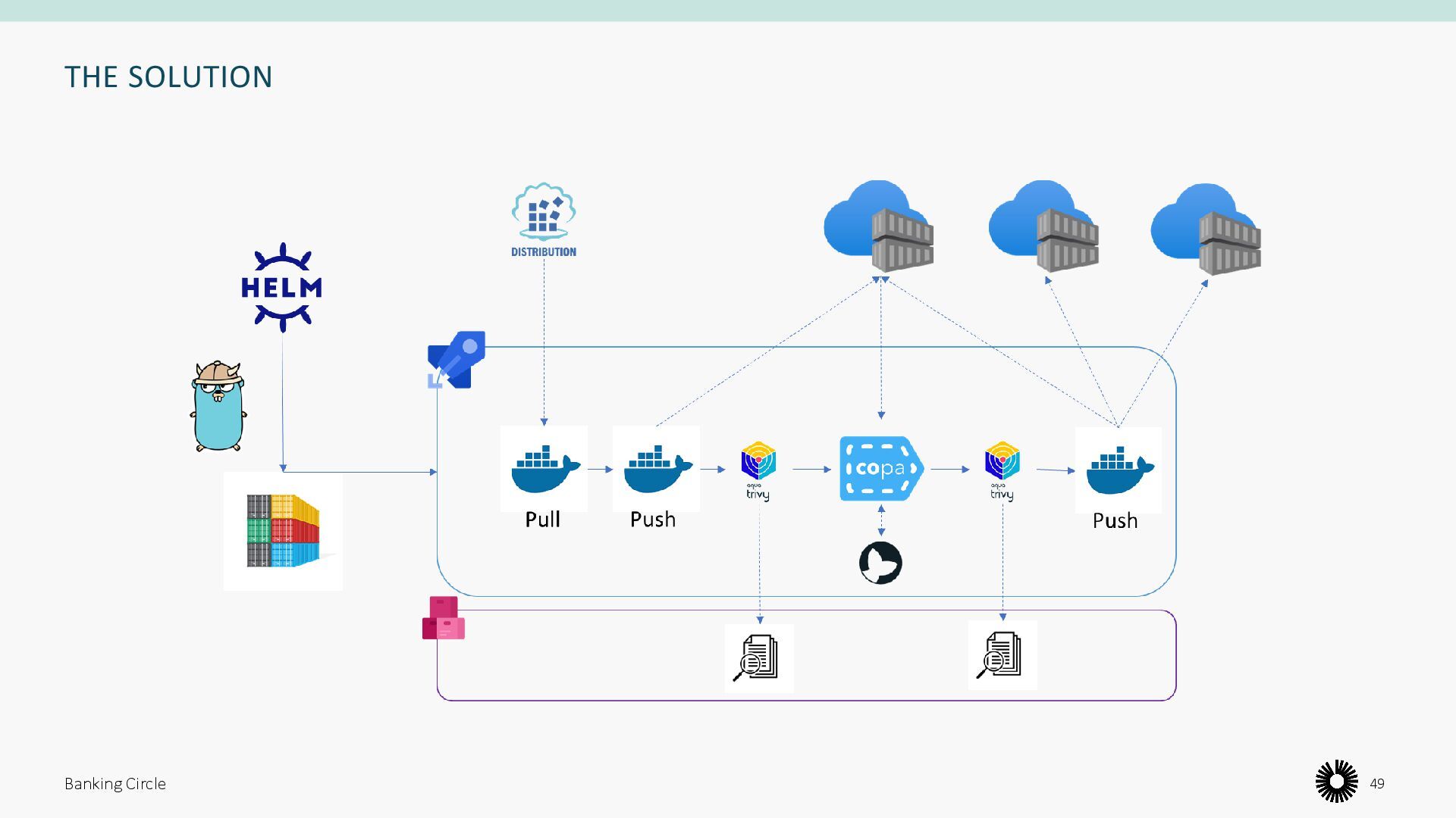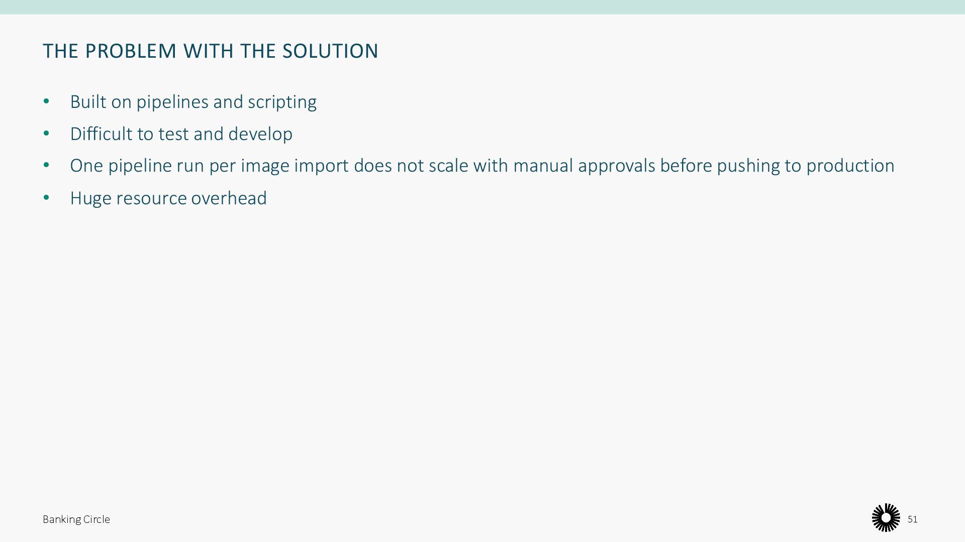 scripting • Difficult to test and develop • One pipeline run per image import does not scale with manual approvals before pushing to production • Huge resource overhead Banking Circle 51