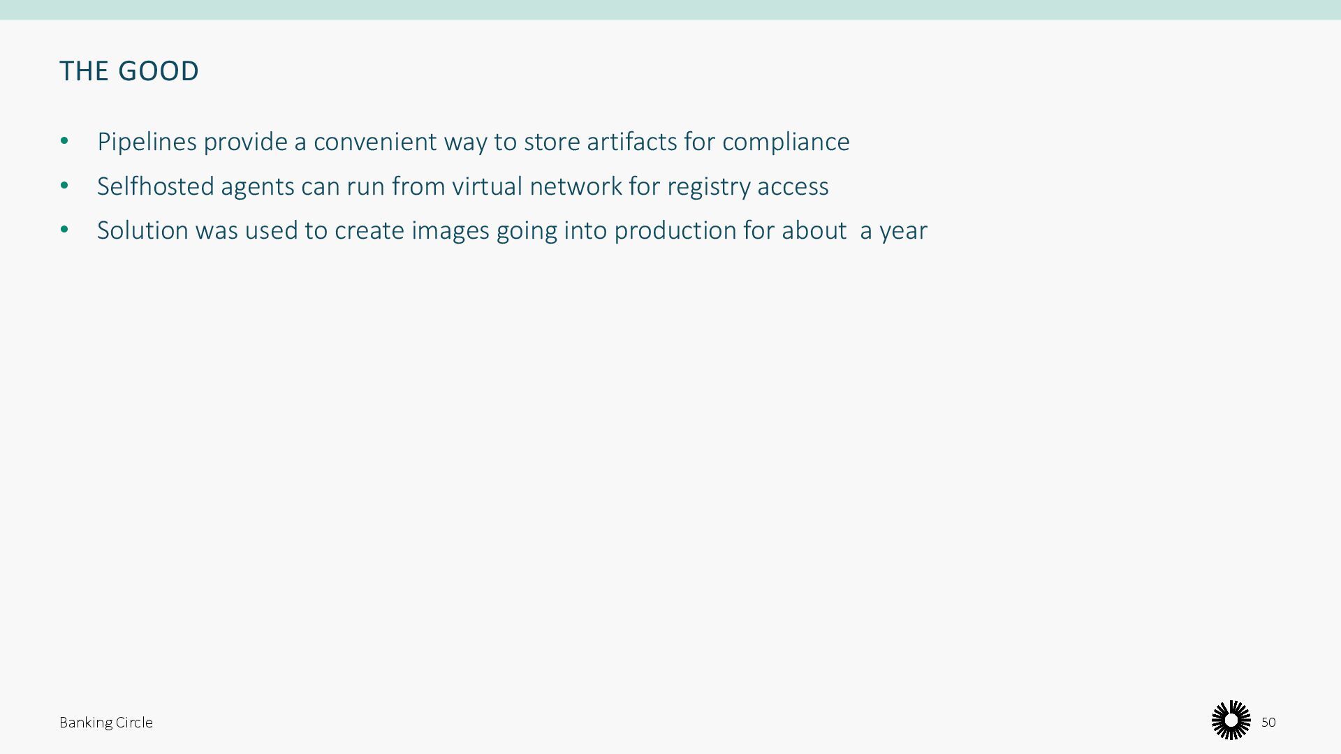 artifacts for compliance • Selfhosted agents can run from virtual network for registry access • Solution was used to create images going into production for about a year Banking Circle 50