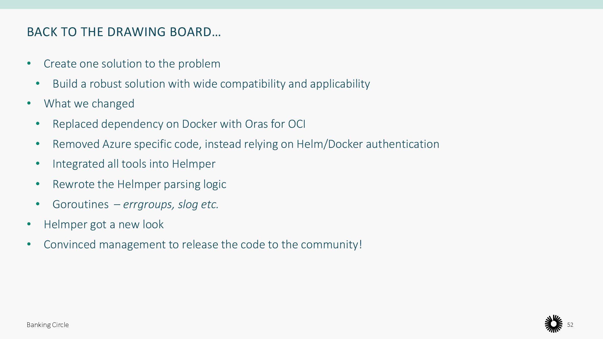the problem • Build a robust solution with wide compatibility and applicability • What we changed • Replaced dependency on Docker with Oras for OCI • Removed Azure specific code, instead relying on Helm/Docker authentication • Integrated all tools into Helmper • Rewrote the Helmper parsing logic • Goroutines – errgroups, slog etc. • Helmper got a new look • Convinced management to release the code to the community! Banking Circle 52
