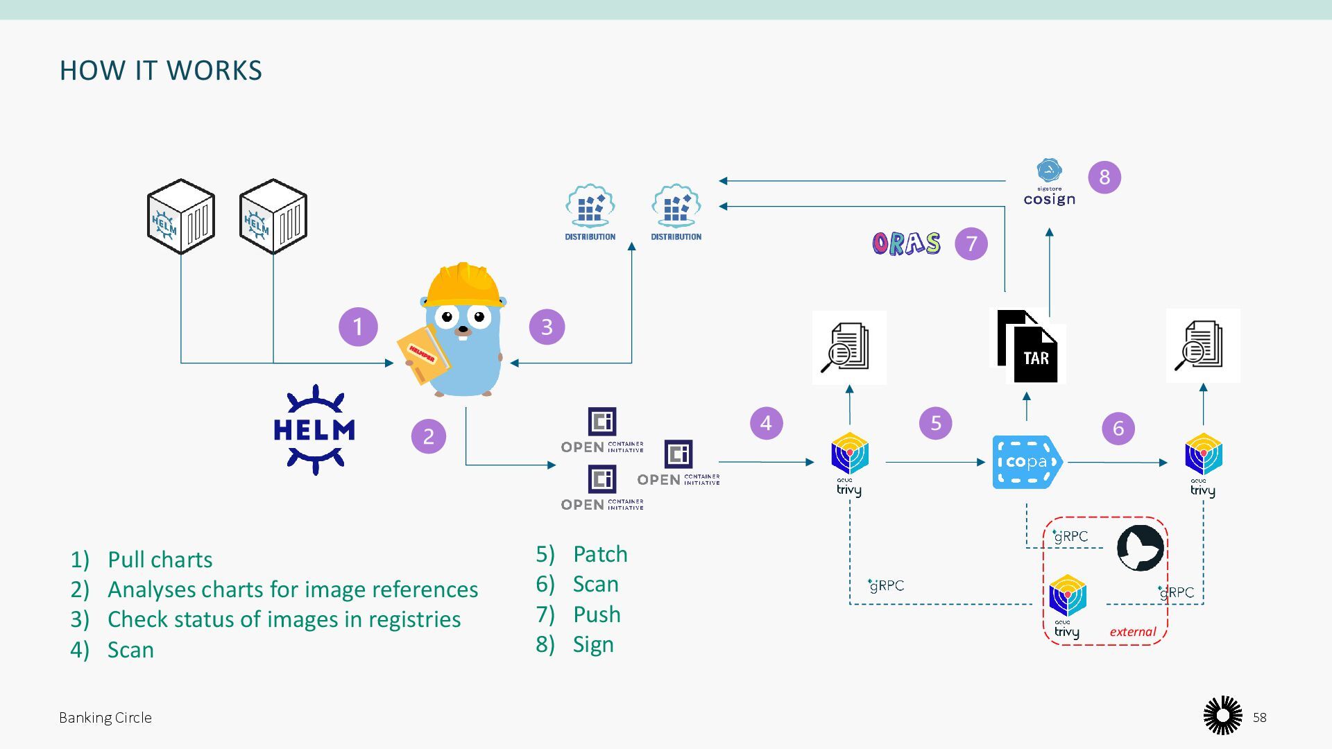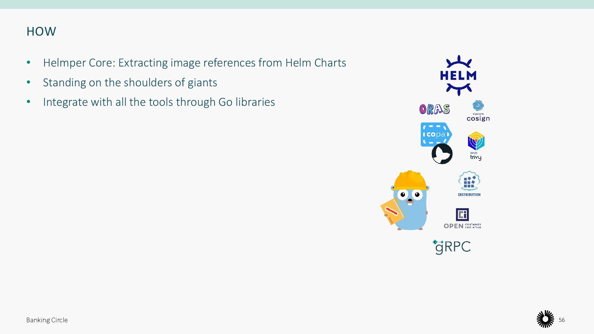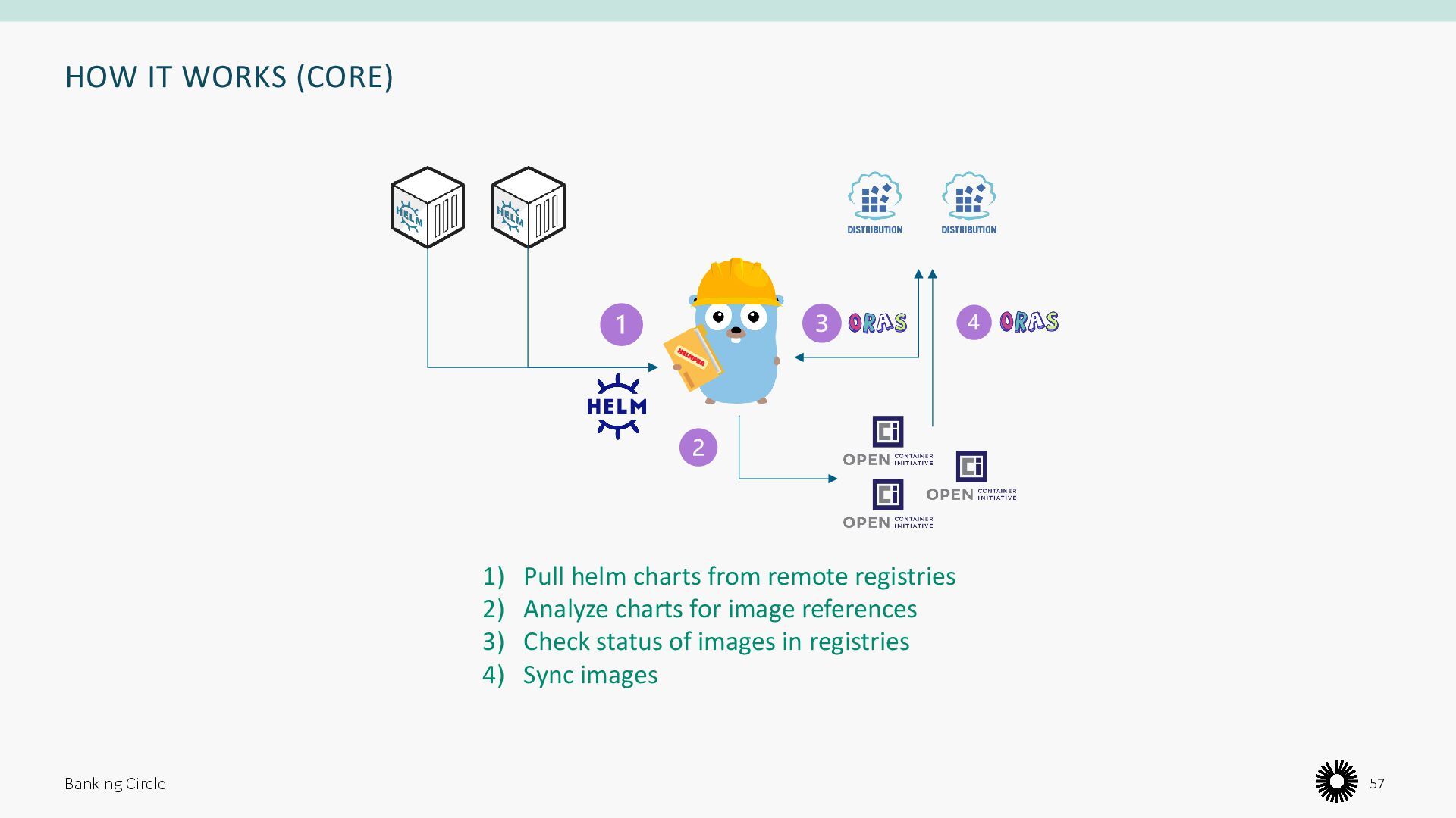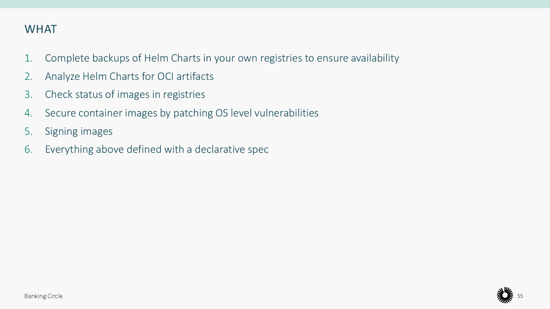 registries to ensure availability 2. Analyze Helm Charts for OCI artifacts 3. Check status of images in registries 4. Secure container images by patching OS level vulnerabilities 5. Signing images 6. Everything above defined with a declarative spec Banking Circle 55