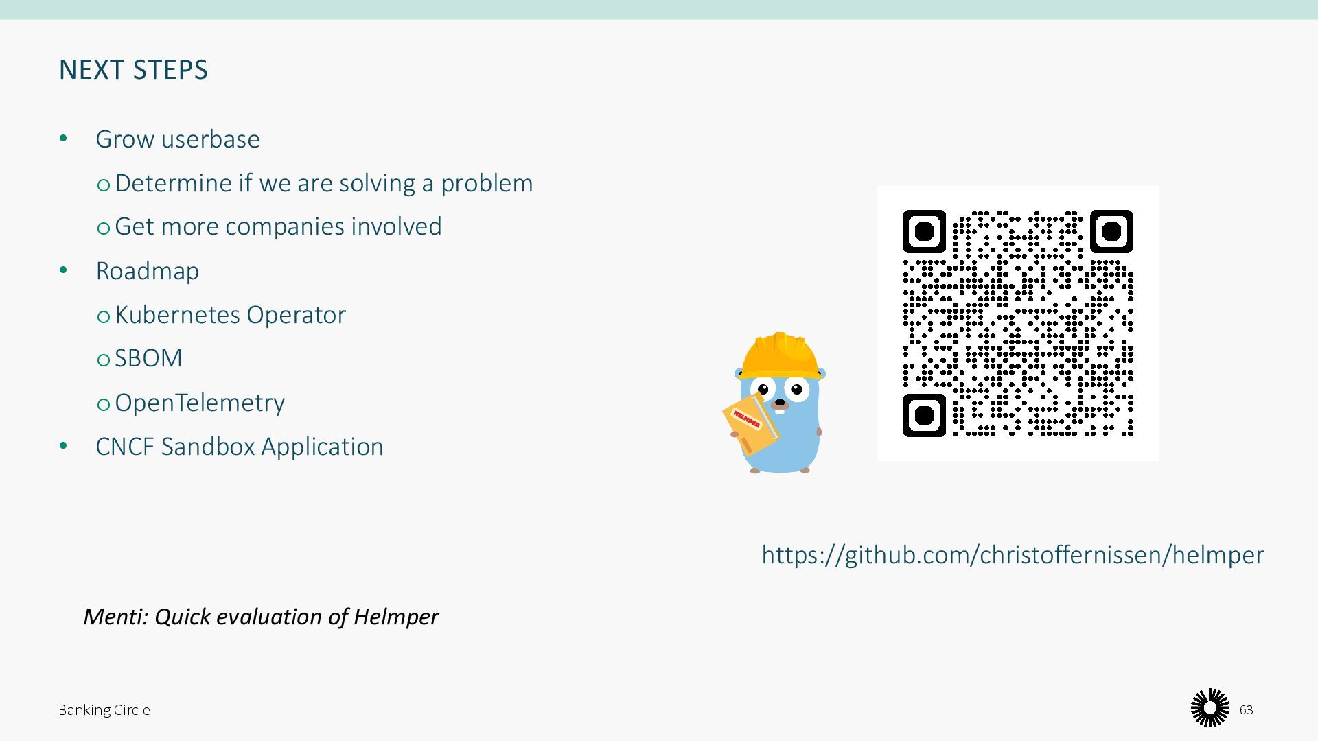 a problem oGet more companies involved • Roadmap oKubernetes Operator oSBOM oOpenTelemetry • CNCF Sandbox Application Banking Circle 63 https://github.com/christoffernissen/helmper Menti: Quick evaluation of Helmper