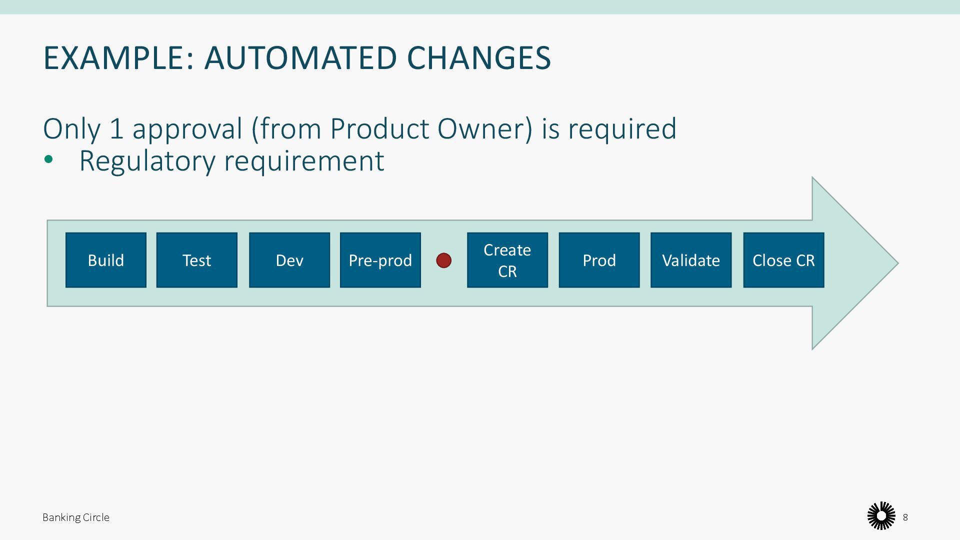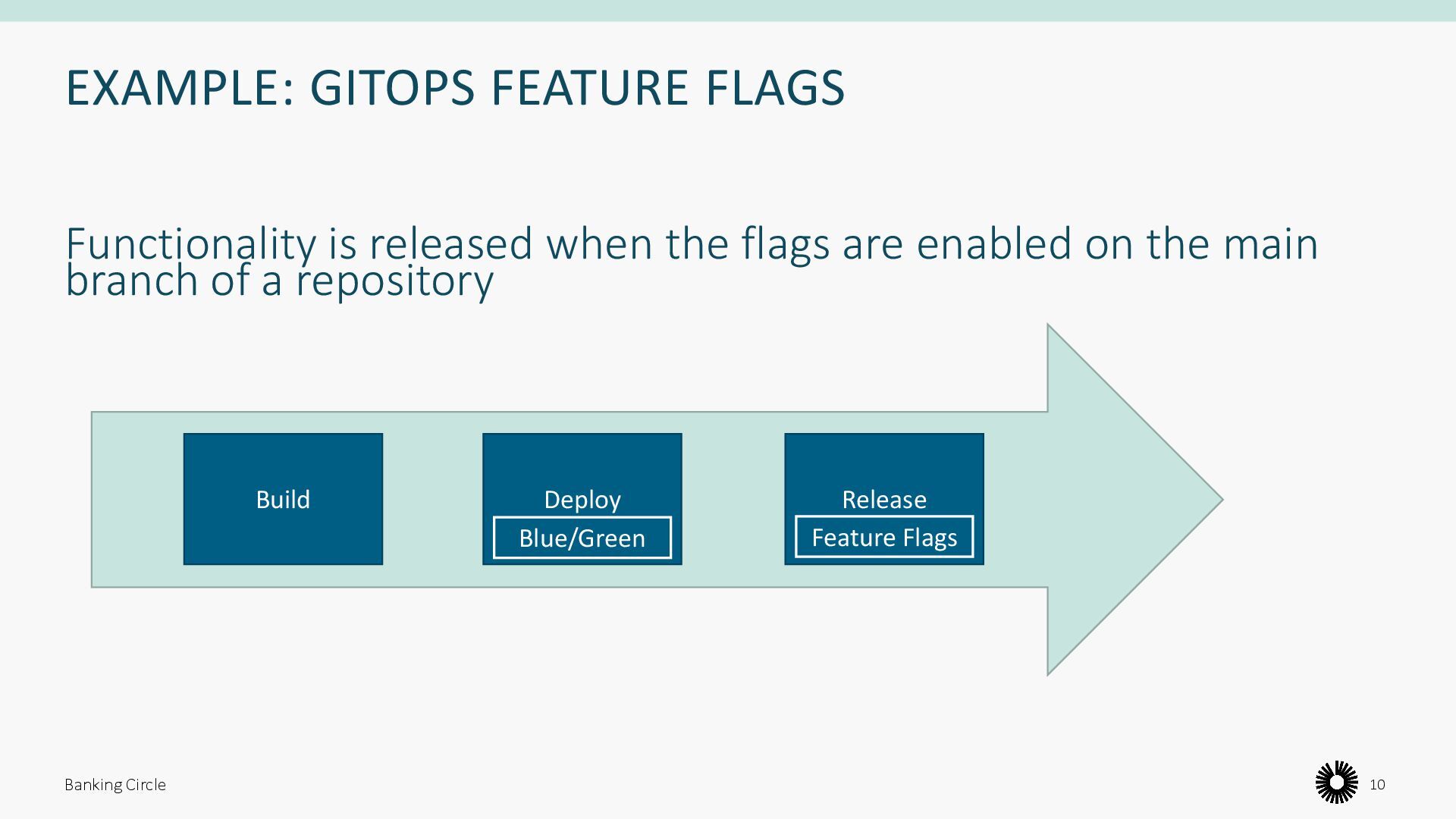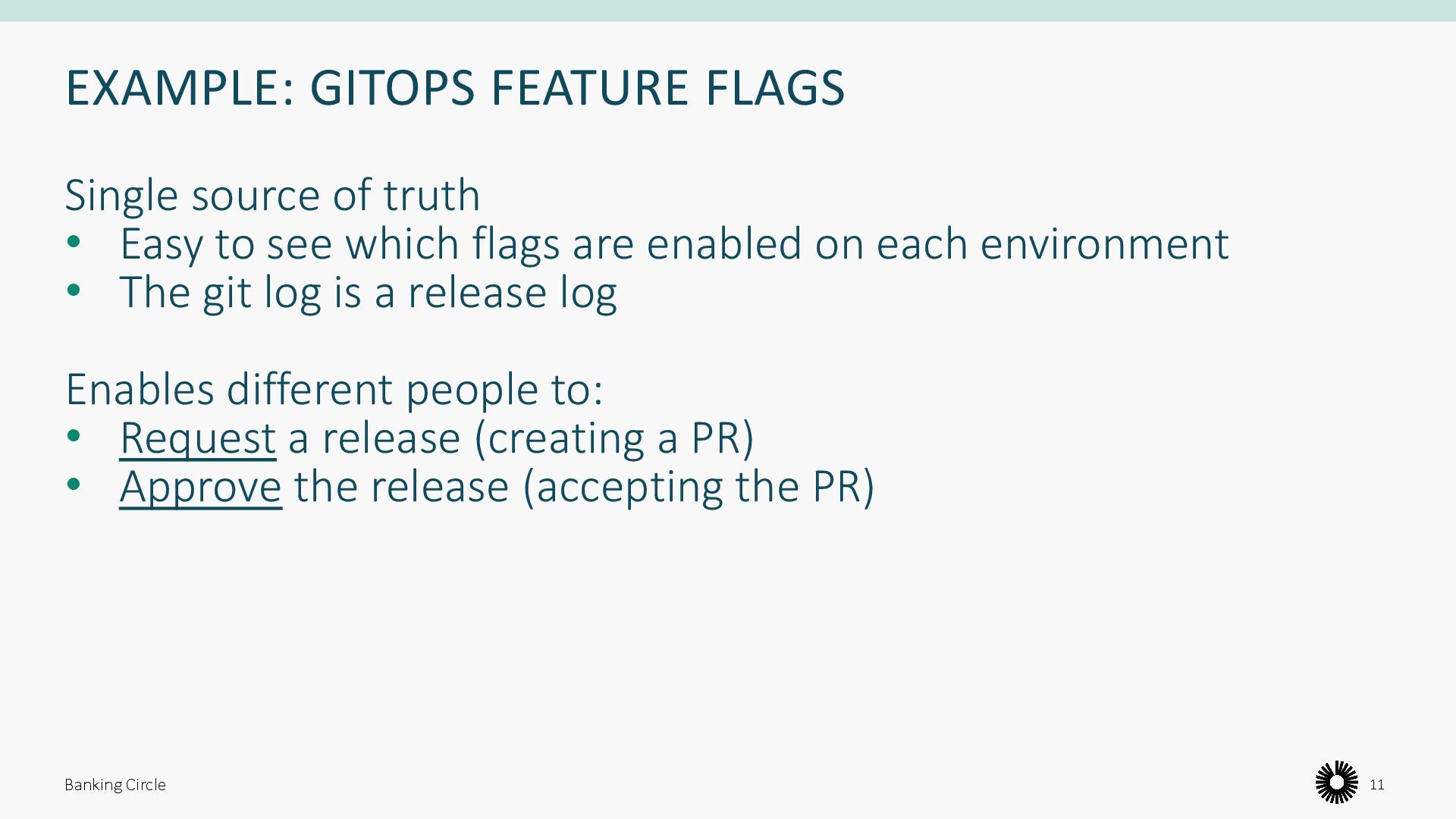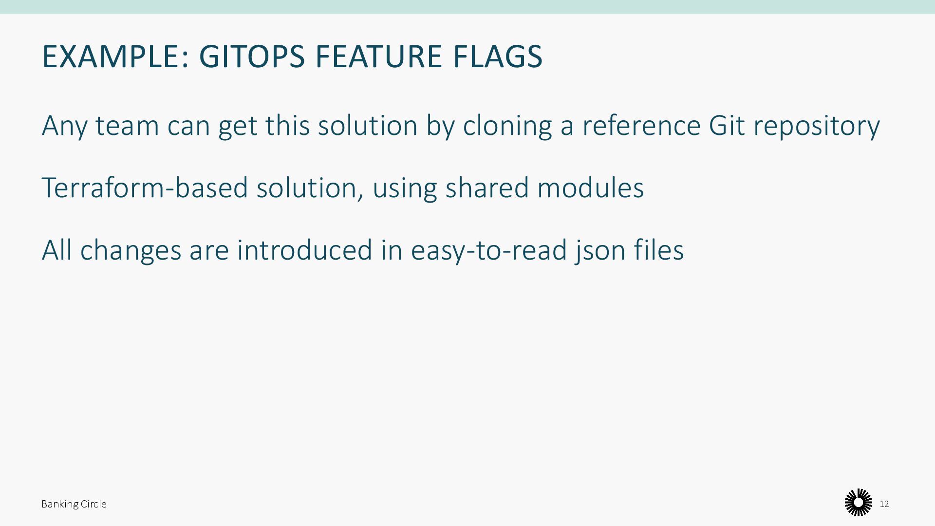 to see which flags are enabled on each environment • The git log is a release log Enables different people to: • Request a release (creating a PR) • Approve the release (accepting the PR) Banking Circle 11