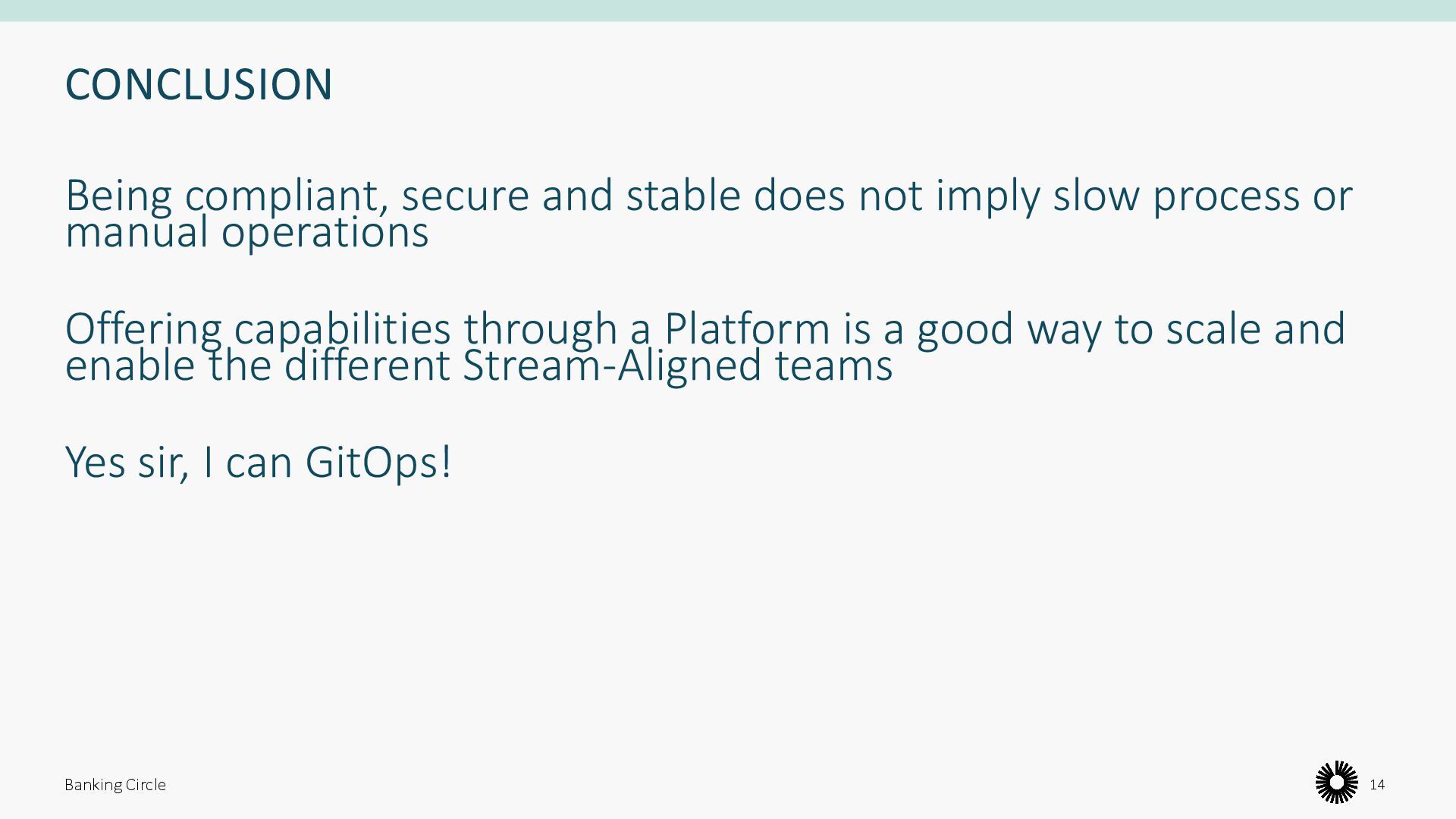 process or manual operations Offering capabilities through a Platform is a good way to scale and enable the different Stream-Aligned teams Yes sir, I can GitOps! Banking Circle 14
