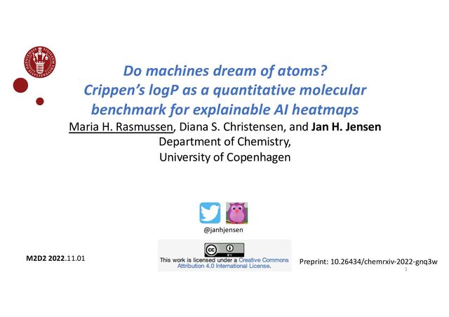 molecular benchmark for explainable AI heatmaps Maria H. Rasmussen, Diana S. Christensen, and Jan H. Jensen Department of Chemistry, University of Copenhagen @janhjensen 1 M2D2 2022.11.01 Preprint: 10.26434/chemrxiv-2022-gnq3w