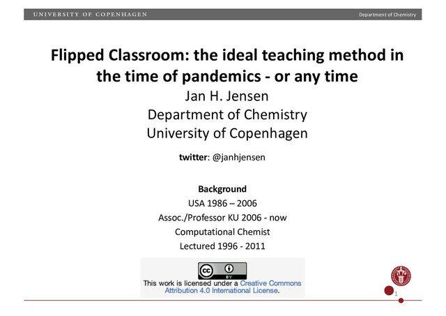 in the time of pandemics - or any time Jan H. Jensen Department of Chemistry University of Copenhagen twitter: @janhjensen Background USA 1986 – 2006 Assoc./Professor KU 2006 - now Computational Chemist Lectured 1996 - 2011