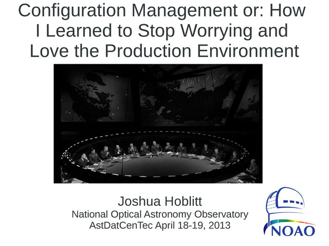 kickstart %postscripts – Update IDL license files on workstations – Started using TheForeman as an ENC • 2011 Puppet & TheForeman (1st project @ NOAO) – Image and configure brand new cluster hardware – Incrementally brought up across most of the server environment for common configs (ntp, resolv.conf, ssh, etc.) – Production applications currently being brought under umbrella