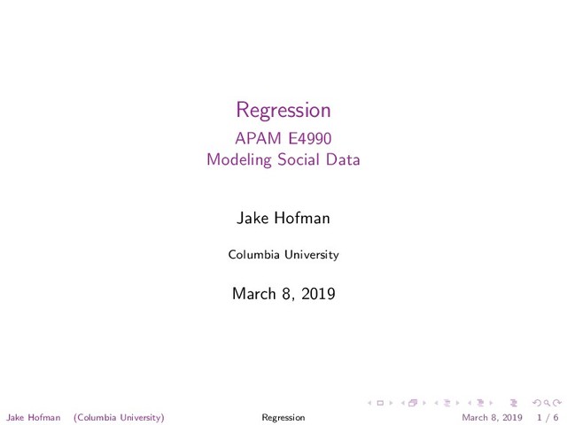 especially interested in a comparison of the means, one could proceed descriptively with a conventional least squares regression analysis as a special case. That is, for each observation i, one could let ˆ yi = β0 + β1 xi , (1.1) where the response variable yi is each applicant’s SAT score, xi is an indicator variable coded “1” if the applicant is Asian and “0” if the applicant is Hispanic, β0 is the mean SAT score for Hispanic applicants, β1 is how much larger (or smaller) the mean SAT score for Asian applicants happens to be, and i is an index running from 1 to the number of Hispanic and Asian applicants, N. Fig. 1.2. Distribution of SAT scores for Asian applicants. SAT Scores for Asian Applicants SAT Score Frequency 600 800 1000 1200 1400 1600 0 50 100 150 to equate regression analysis with causal modeling. This is too narrow and even misleading. Causal modeling is actually an interpretive framework that is imposed on the results of a regression analysis. An alternative knee-jerk response may be to equate regression analysis with the general linear model. At most, the general linear model can be seen as a special case of regression analysis. Statisticians commonly define regression so that the goal is to understand “as far as possible with the available data how the conditional distribution of some response y varies across subpopulations determined by the possible values of the predictor or predictors” (Cook and Weisberg, 1999: 27). That is, interest centers on the distribution of the response variable Y conditioning on one or more predictors X. This definition includes a wide variety of elementary procedures easily implemented in R. (See, for example, Maindonald and Braun, 2007: Chapter 2.) For example, consider Figures 1.1 and 1.2. The first shows the distribution of SAT scores for recent applicants to a major university, who self-identify as “Hispanic.” The second shows the distribution of SAT scores for recent applicants to that same university, who self-identify as “Asian.” 1 Jake Hofman (Columbia University) Regression March 8, 2019 5 / 6